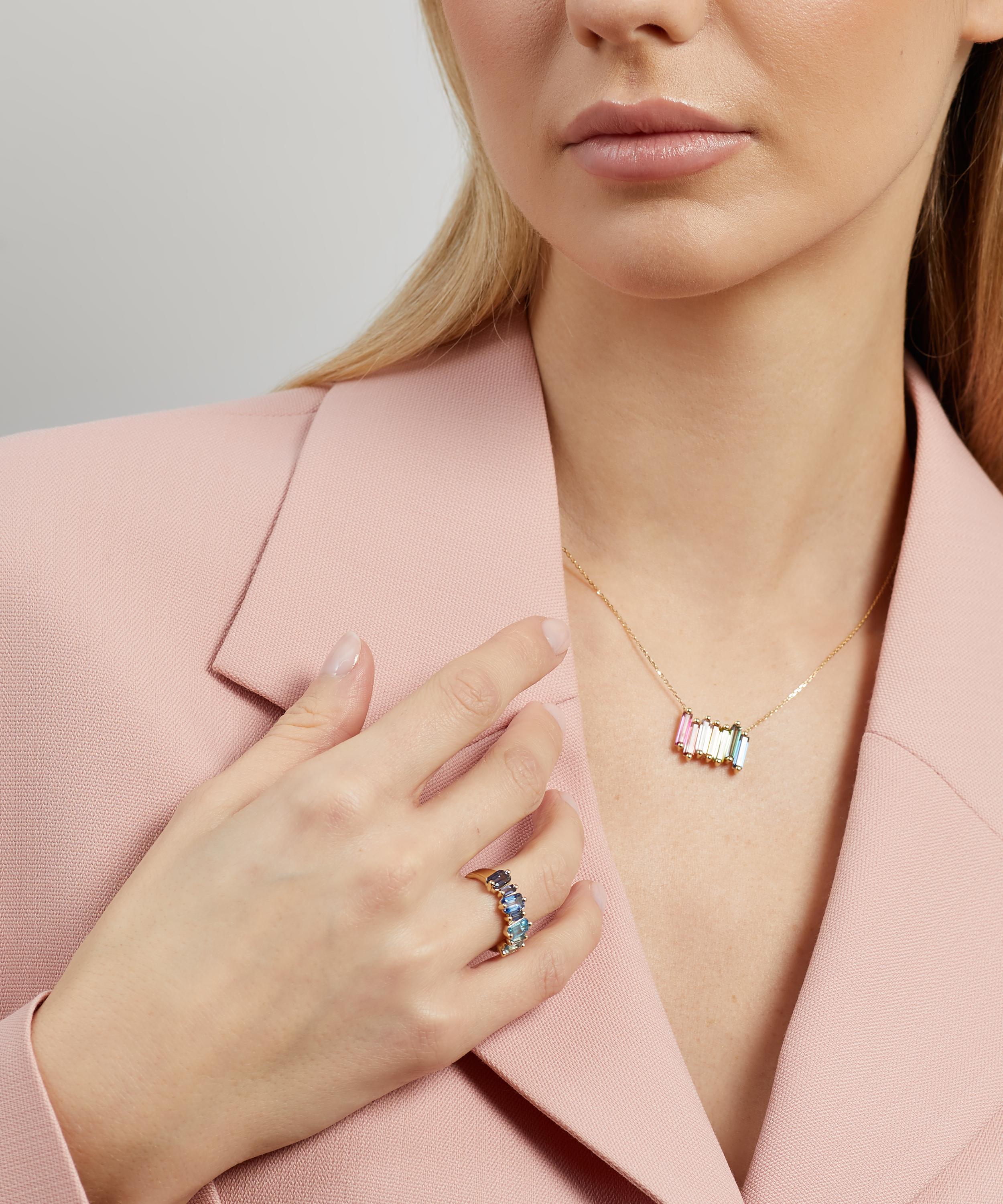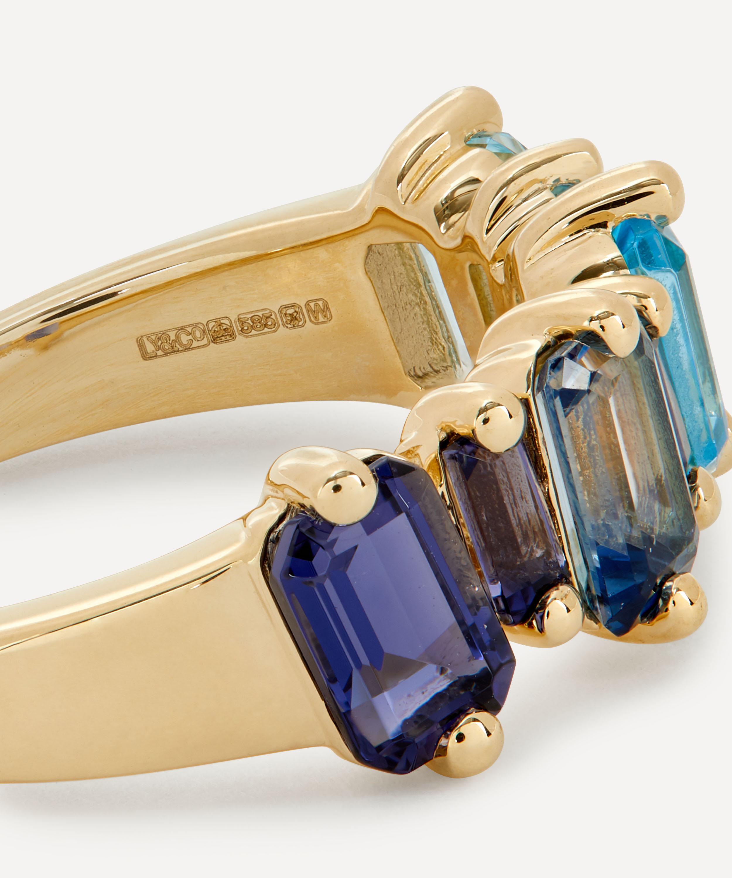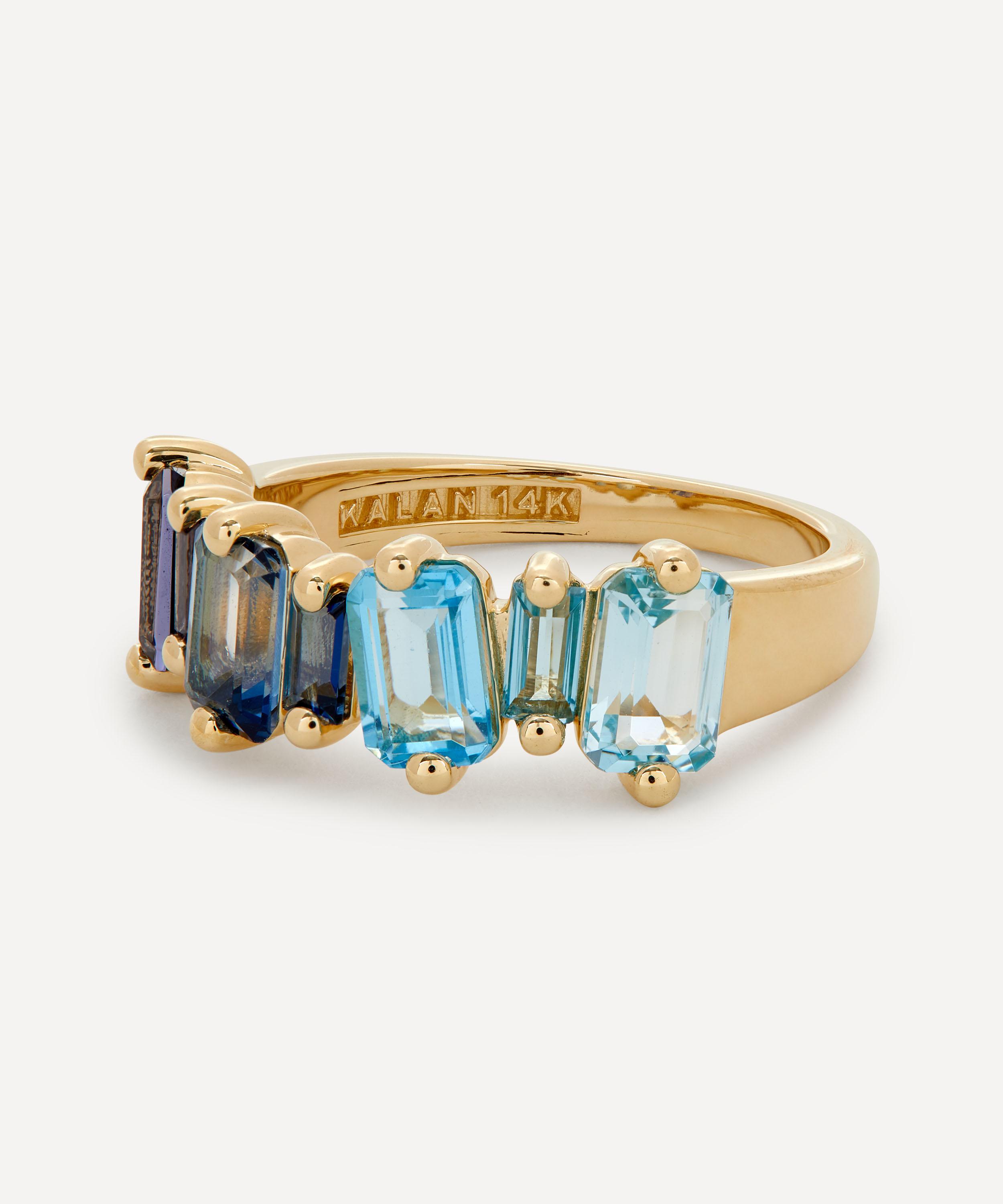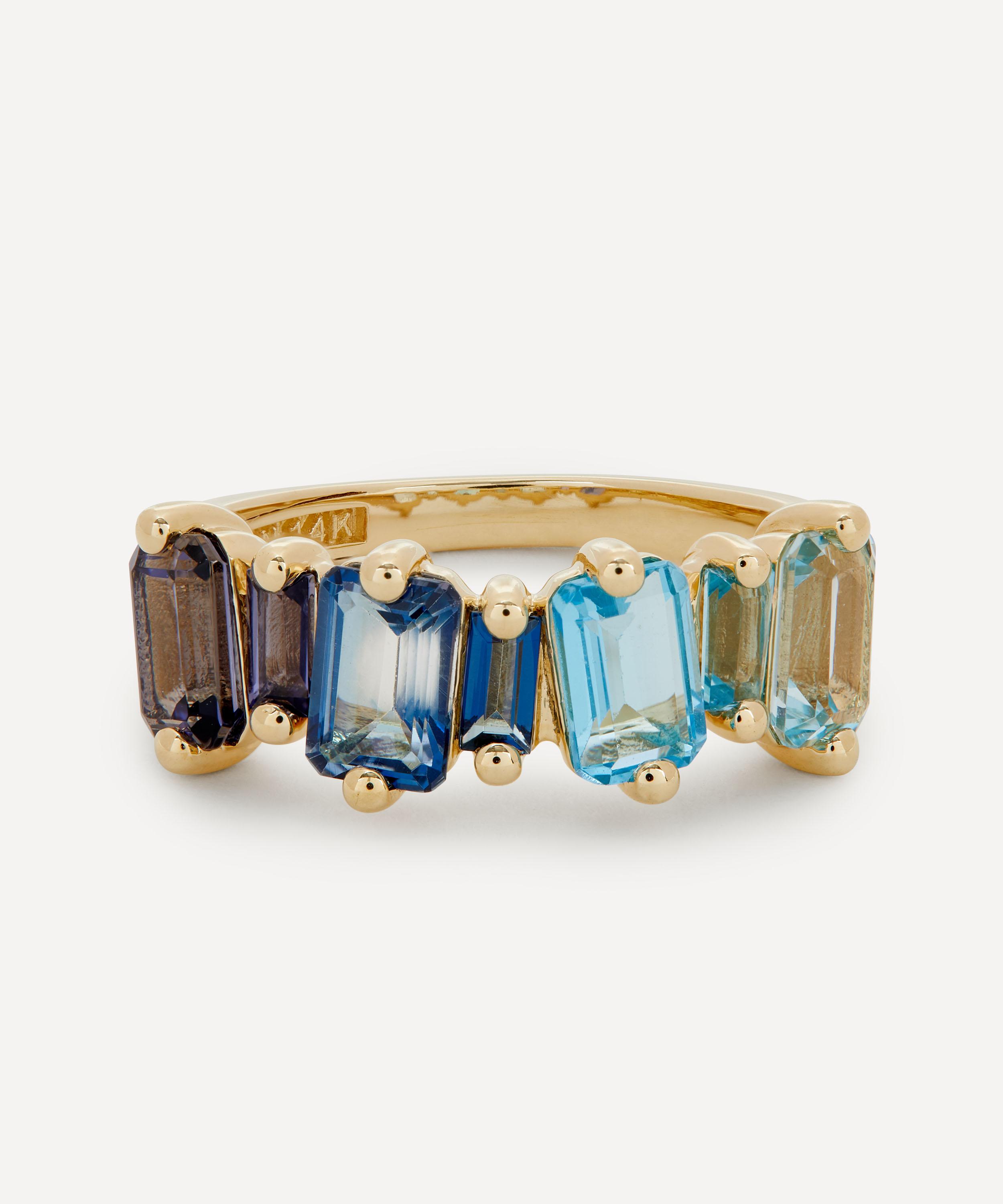 Crafted from solid 14 carat gold, this ring features a subtly irregular row of emerald cut and baguette cut iolite and blue topaz stones that come together to form a vivid blue colour gradient. Style it solo for a pop of colour day-to-day, or stack it with several of the designer's other glittering gemstone rings for a candy-coloured cocktail hour curation.