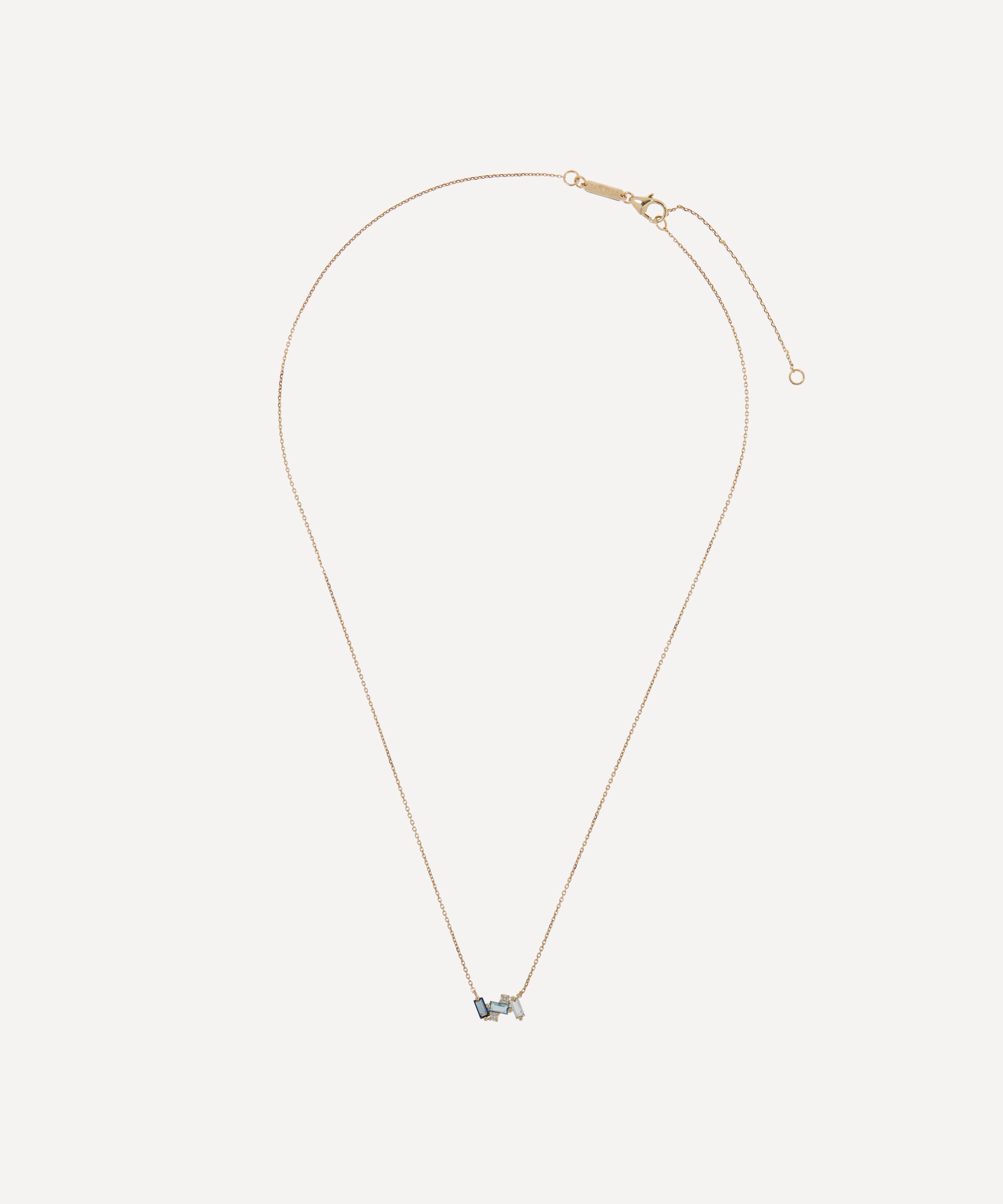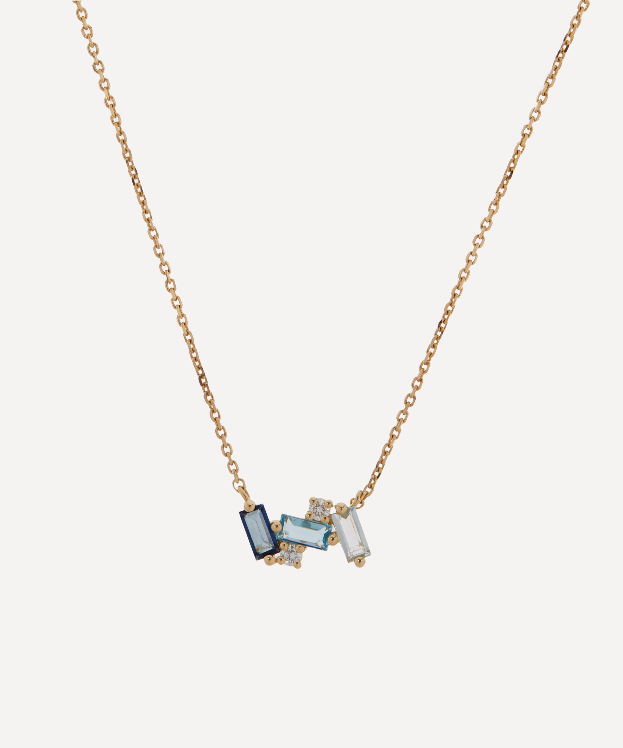 Crafted from solid 14ct gold, this necklace features a subtly irregular stack of three baguette cut blue gemstones - including Swiss, English and classic blue topaz – interspersed with two round cut sparkling diamonds. Style it solo against a bare decolletage for a minimal everyday look, or team it with pulled-back hair and a pair of the designer’s glittering gemstone drop earrings for a glamourous cocktail hour curation.