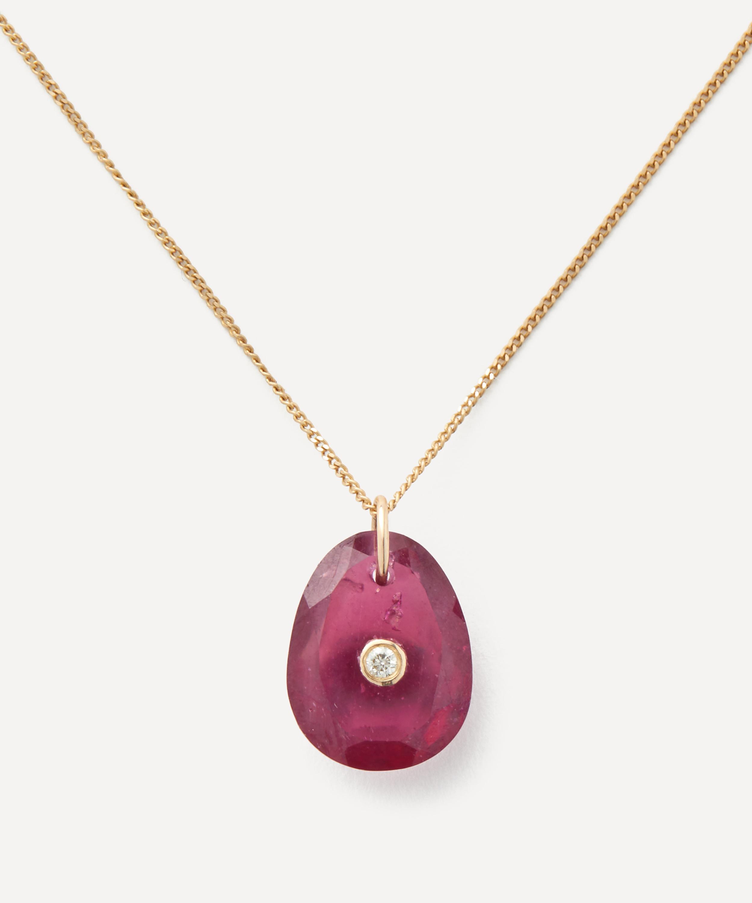 Showcasing a faceted teardrop-shaped ruby that beautifully catches the light at every angle adorned with a single diamond at the centre, this necklace features a delicate 14ct gold curb chain with an adjustable length.