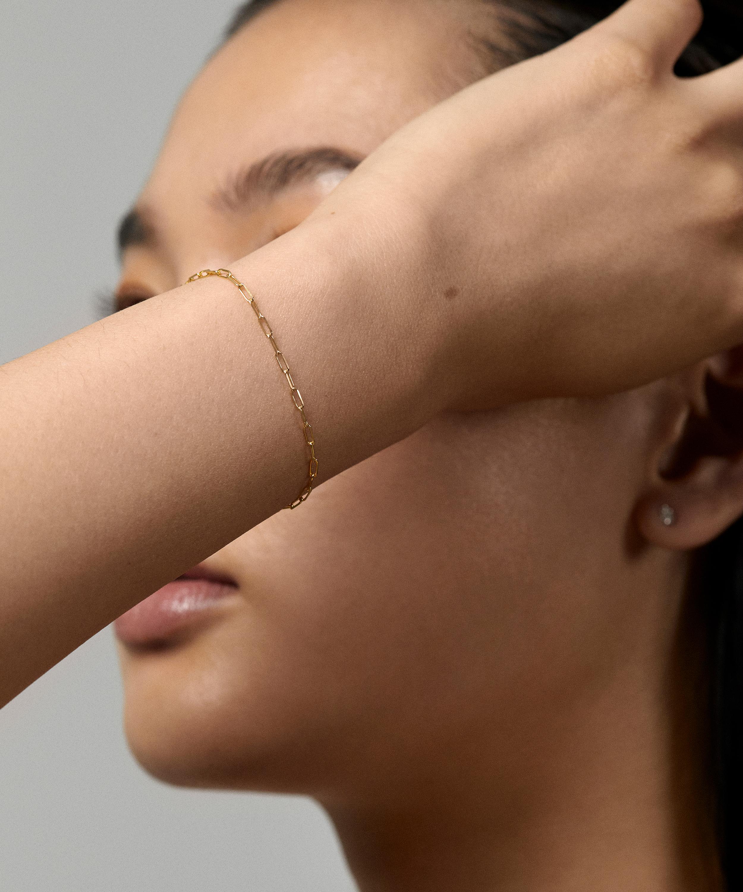 An elegant addition to your everyday line-up, this chain bracelet is crafted from 14ct solid gold and features a paperclip-inspired link design – perfect for layering, wear it with additional chains or pair it with a sparkling piece for a contrasting effect.