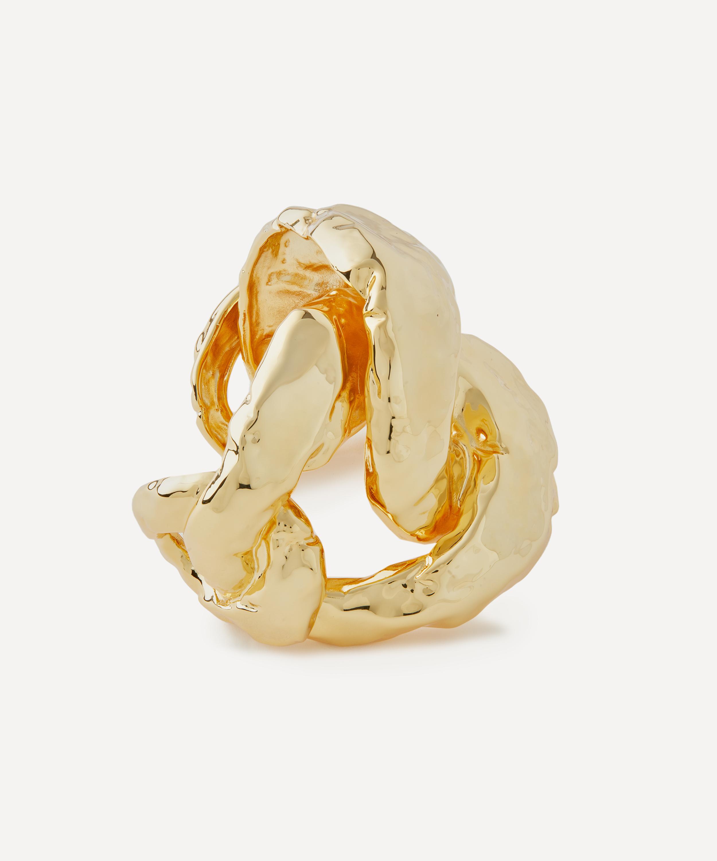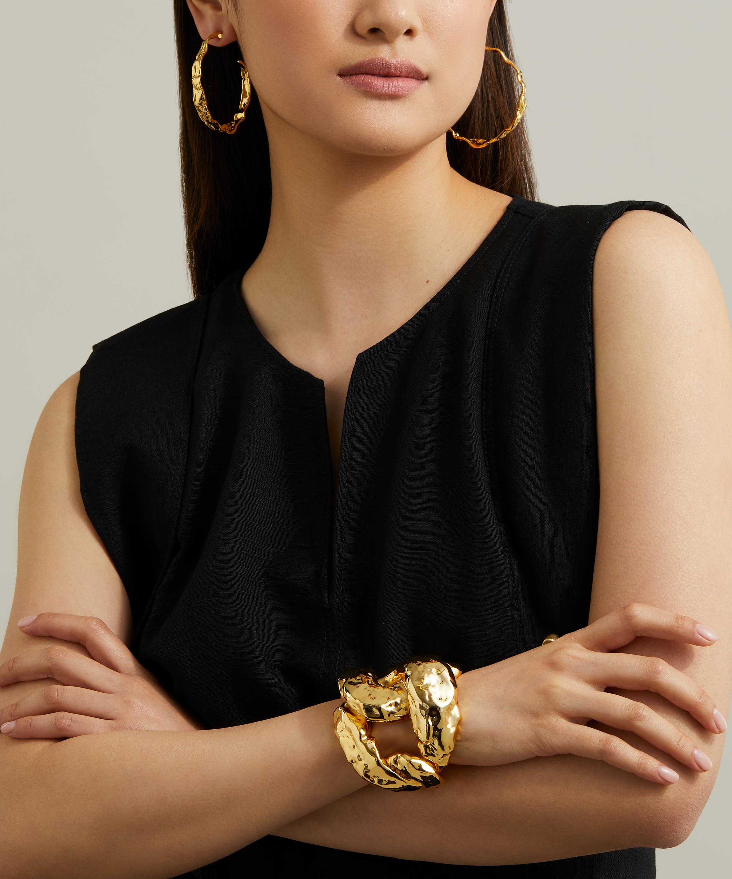 Imbue curated looks with a bit of grandeur through this brutalist-inspired cuff bracelet from Alexis Bittar. Crafted from 14ct gold-plated brass, it’s fashioned into two oversized, interlocking curb links with a textured, high-shine finish. Perfect for spicing up occasion-wear, style it on its own for a pared-down, yet elevated edit, or pair with chunky hoops and additional bangles for a maximalist take.