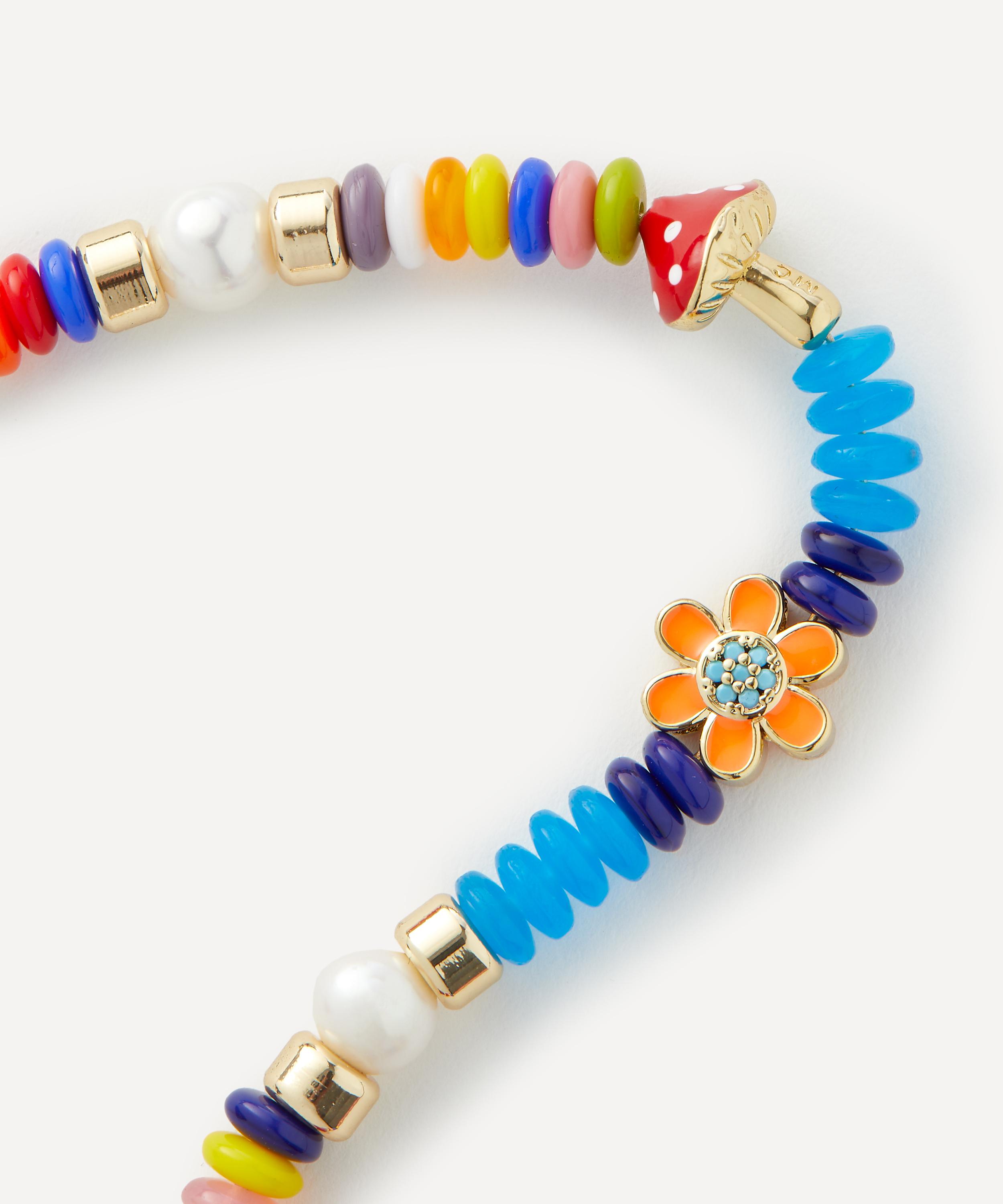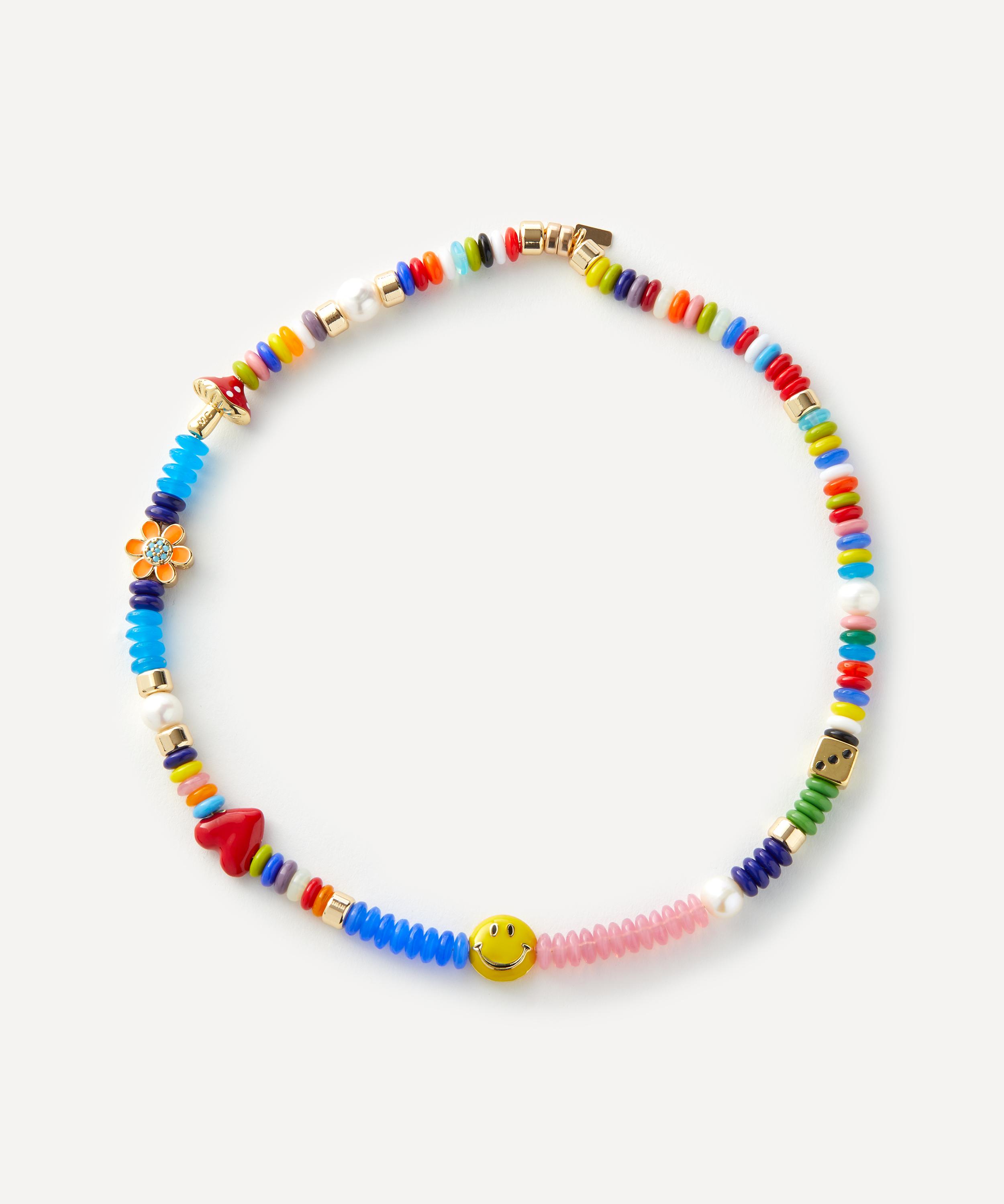 The Enamel beaded necklace presents a whimsical design from Miami-based jewellery brand Martha Calvo. Crafted from 14ct gold-plated brass, it’s composed of rainbow beads and assorted enamel beads including a ditsy happy face, red heart, dice, flower and mushroom.