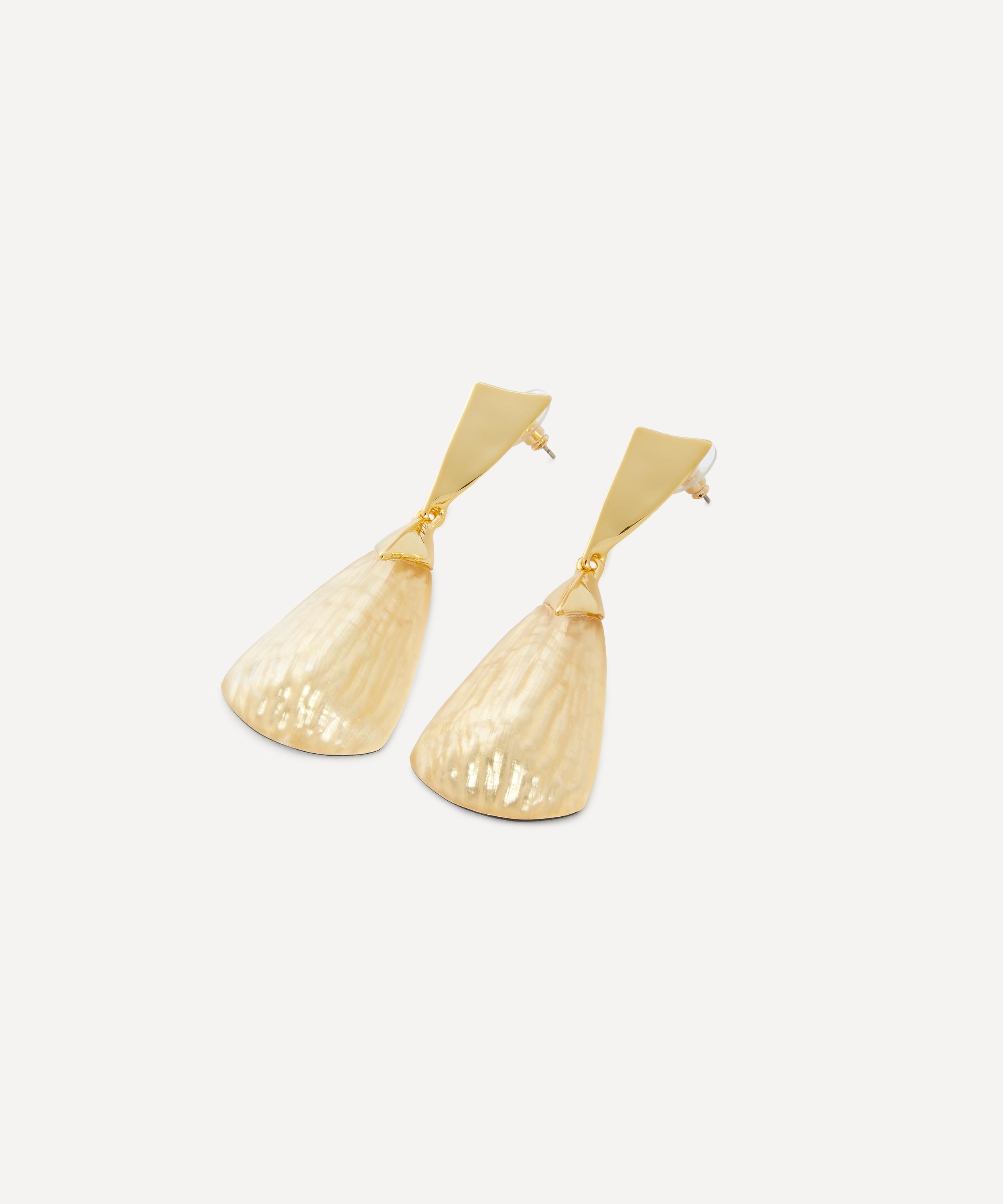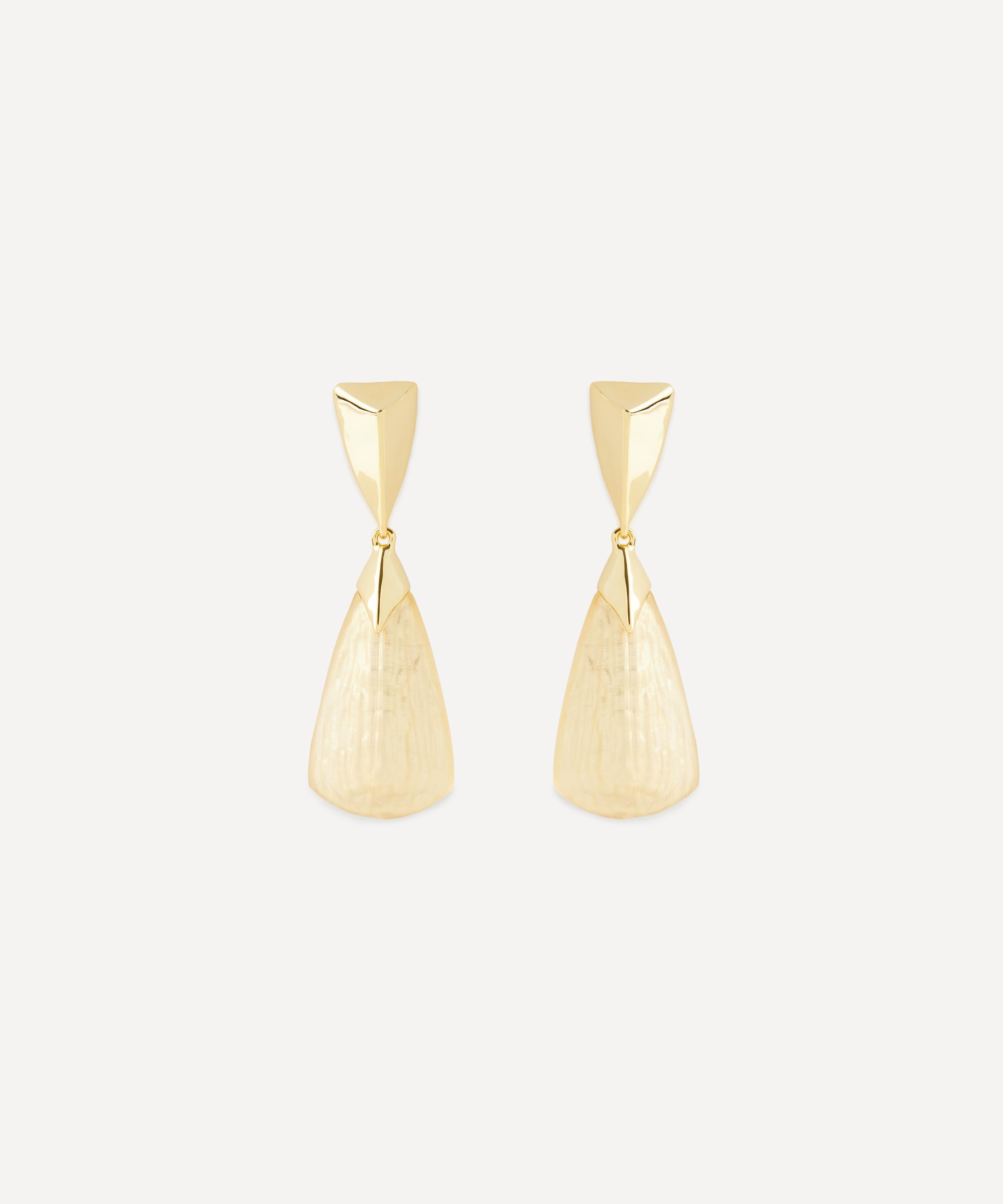 Turn heads with these statement-making drop earrings from acclaimed jewellery designer Alexis Bittar. Featuring the brand’s signature hand-carved Lucite, each earring is intricately sculpted into an armour-inspired faceted silhouette, capped with molten metalwork in 14ct gold-plated brass. Style them solo, stack with additional earrings, or team with another Lucite piece from the brand.