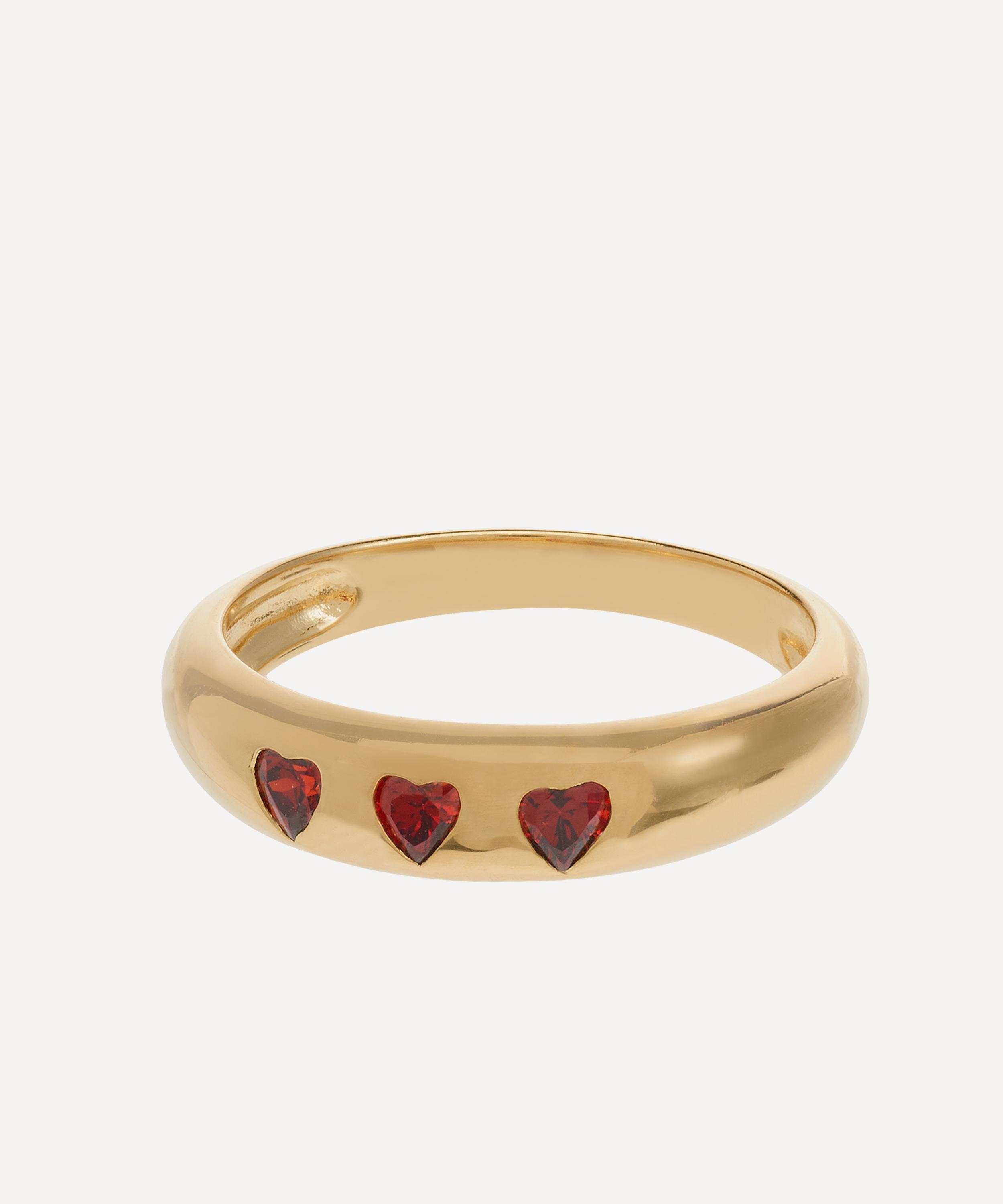 Crafted from 14ct gold-plated silver, it features a wider band to further highlight the trio of decorative garnet hearts that adorn the front – offering a romantic look, style it solo, stack with other rings or team it with your favourite jewels for a sparkling curation.