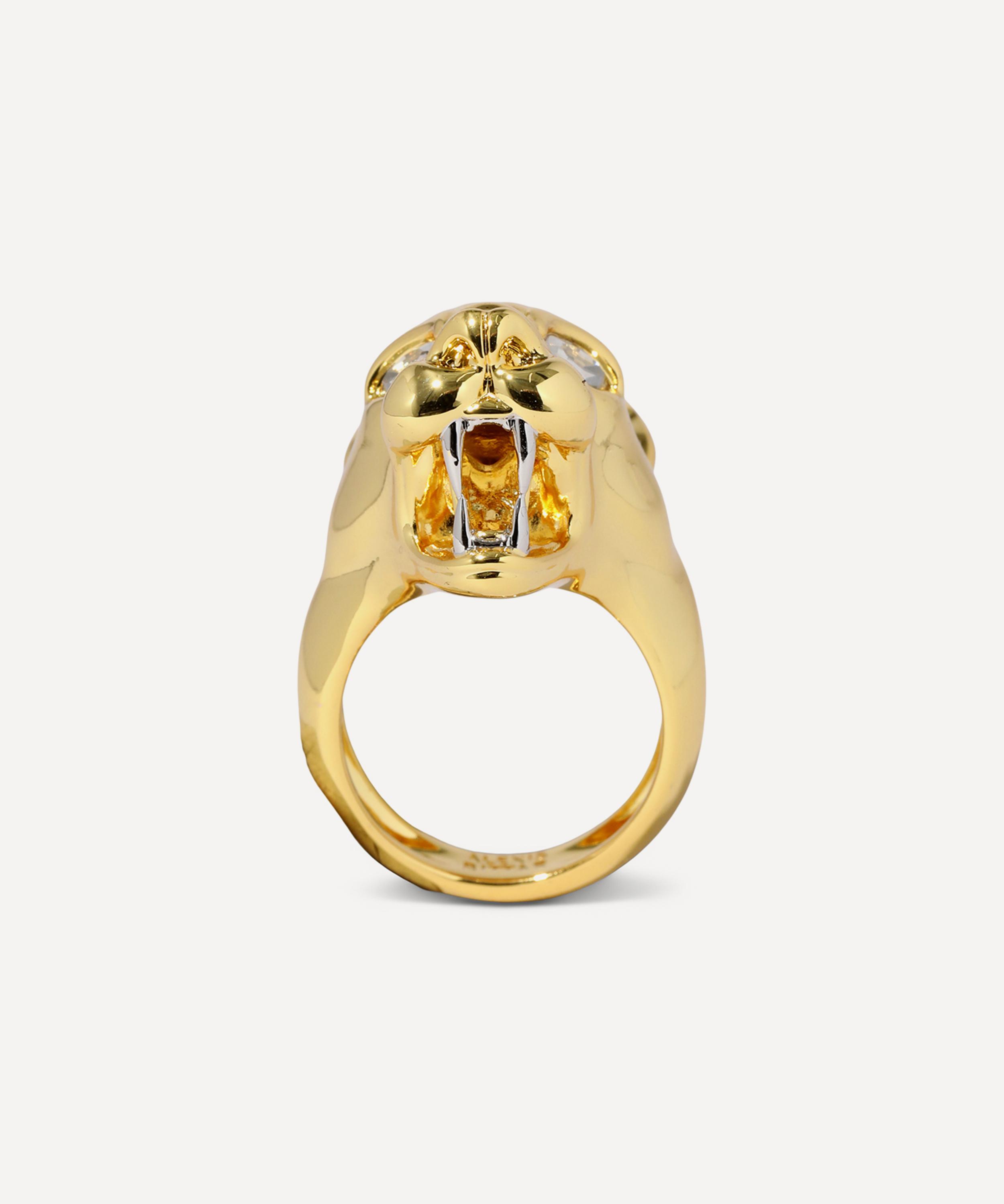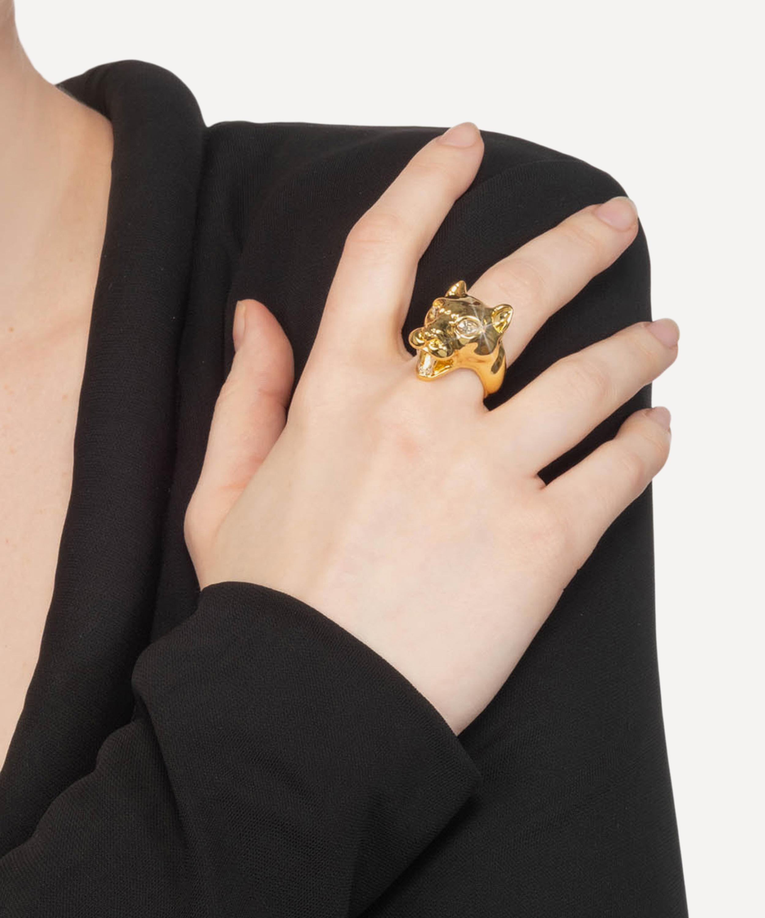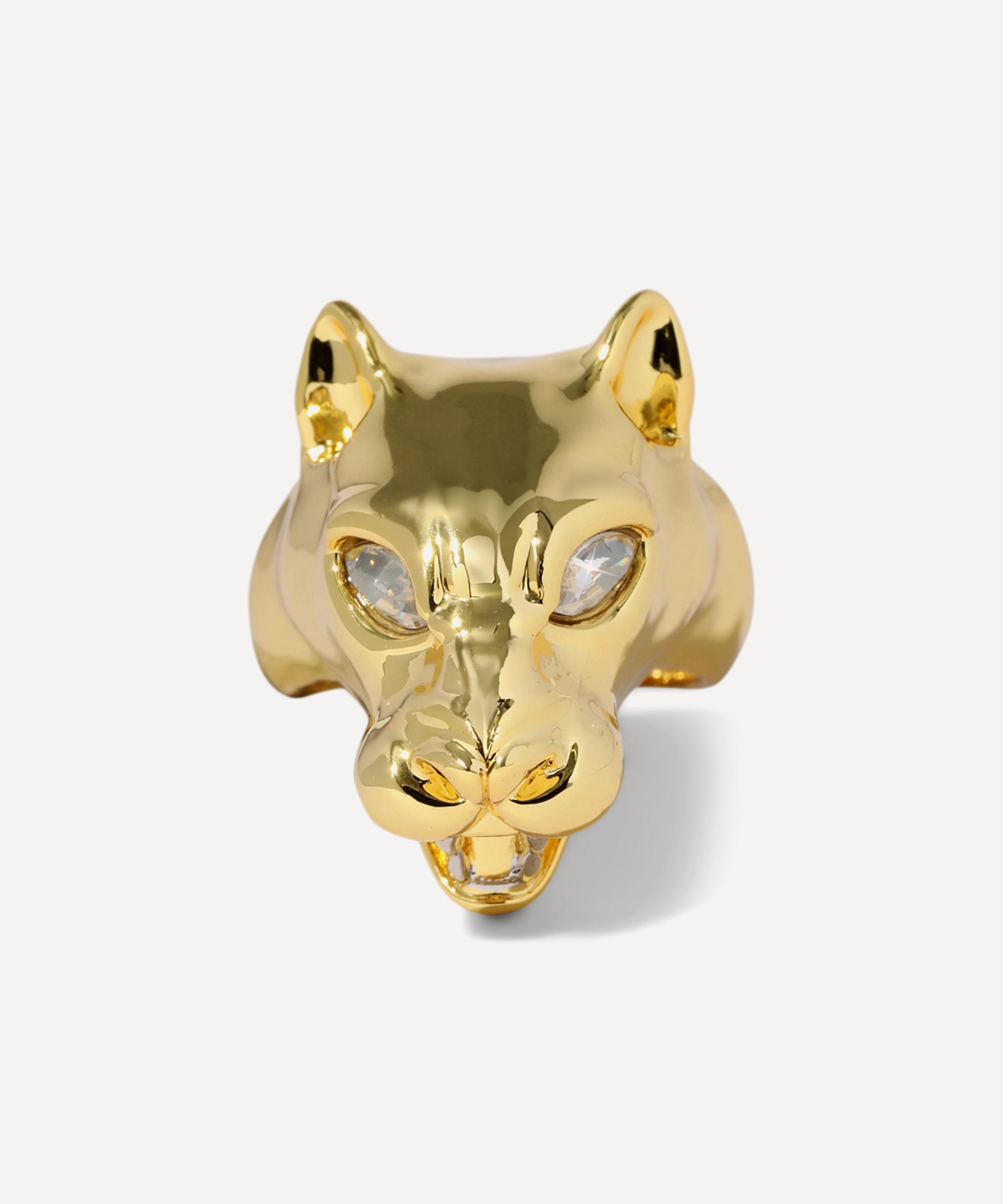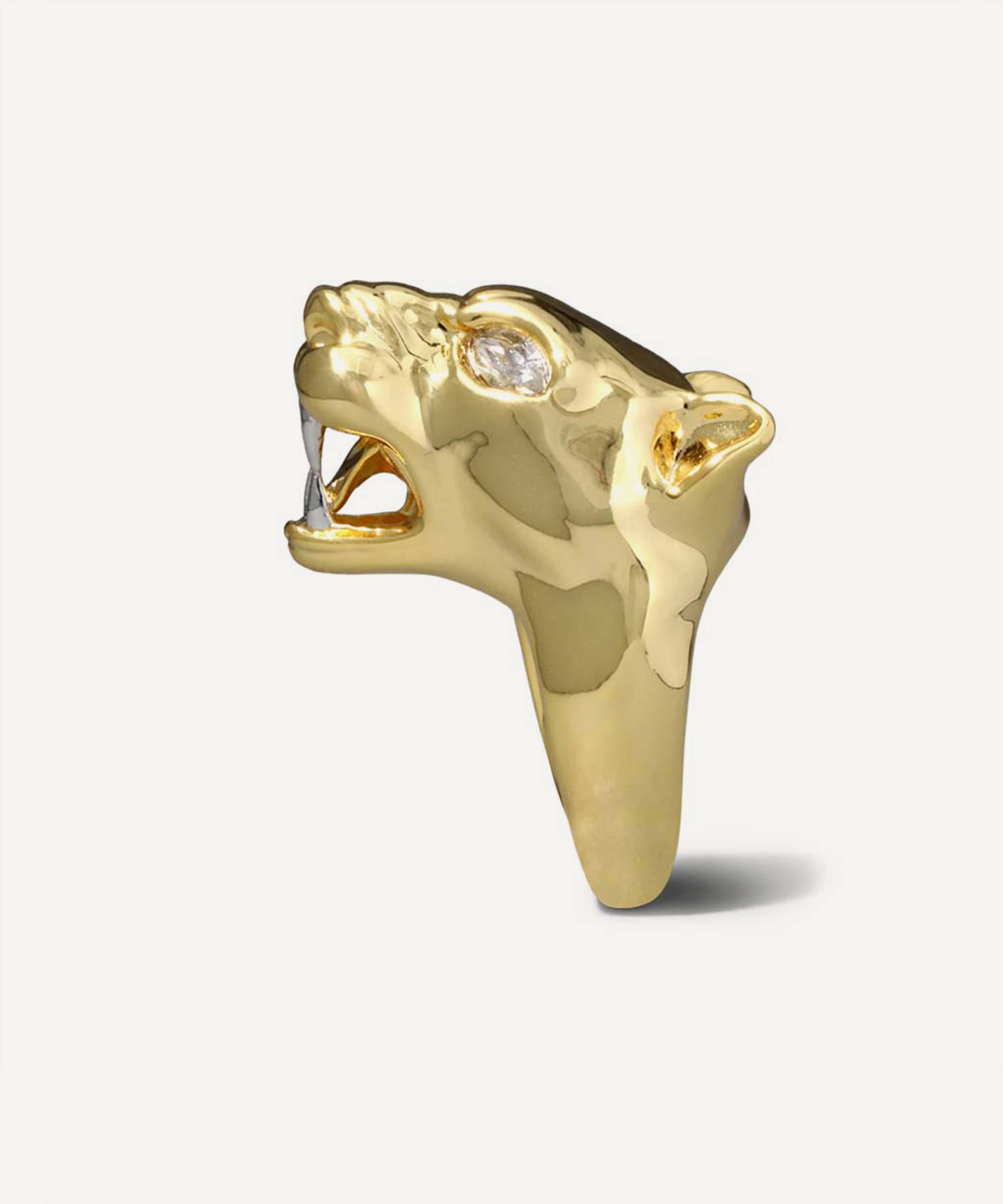 Exemplifying the brand’s bold and artistic aesthetic, it’s crafted from 14ct gold-plated brass, featuring a highly sculpted panther head, adorned with fierce silver-tone fangs and custom-cut crystal eyes. Let it take centre stage or pair with other cocktail rings and stacking bands.