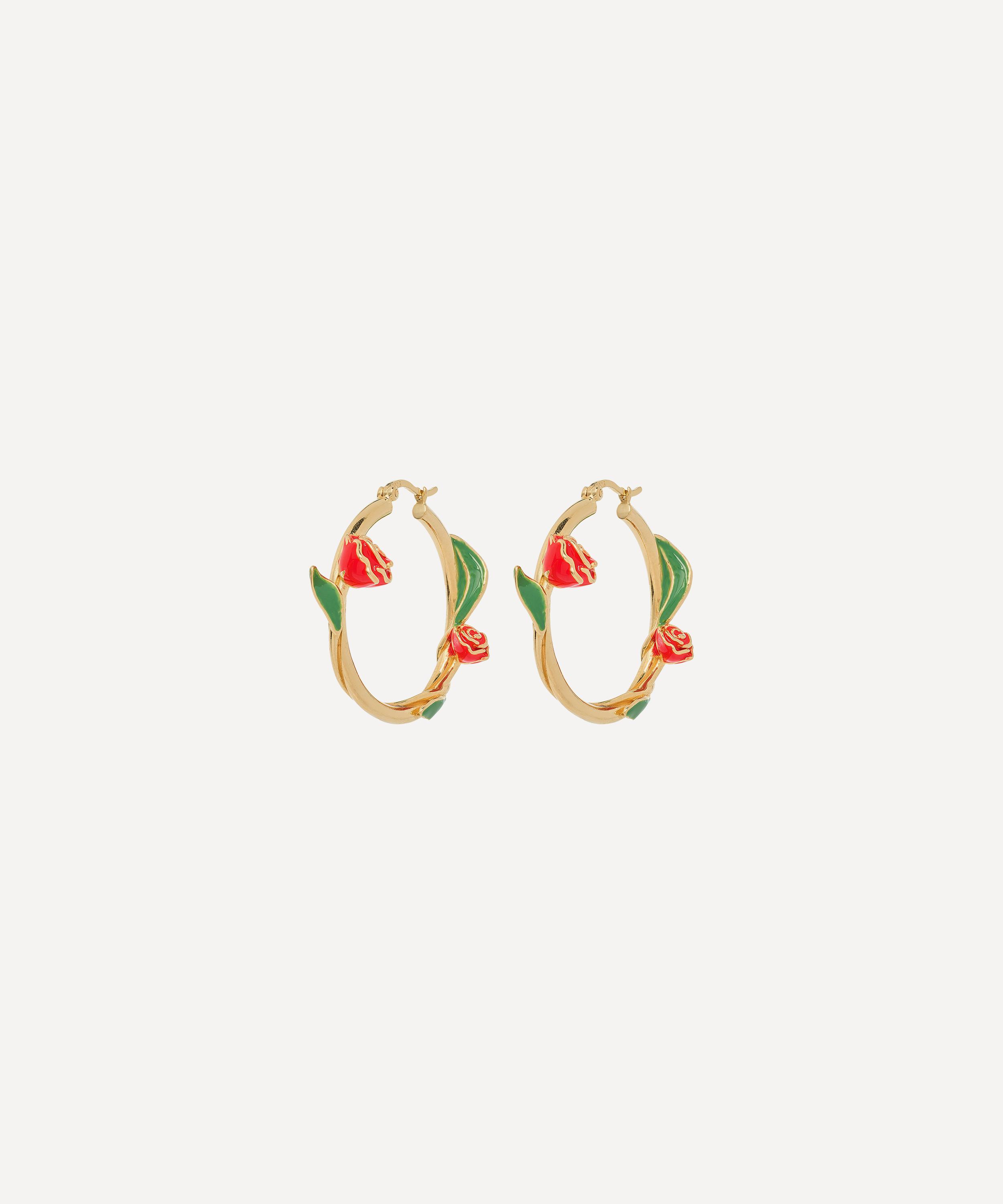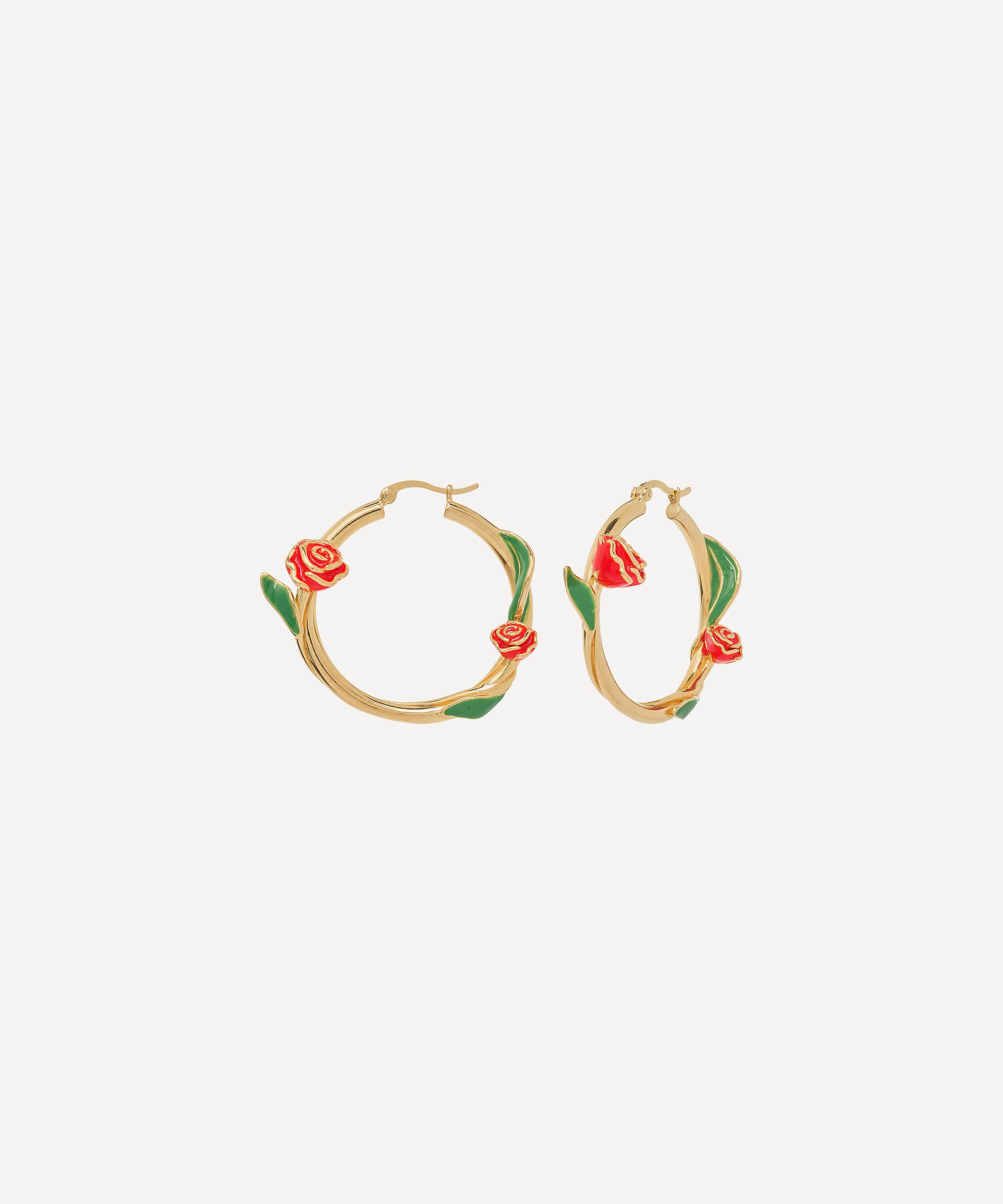 Crafted from 14ct gold-plated silver, this charming pair are characterised by the duo of roses that entwine the hoops, and are complete with enamelled detailing for a statement finish – incorporate them into a mixed ear stack for a trend-led finish, or style solo to showcase their eye-catching design.