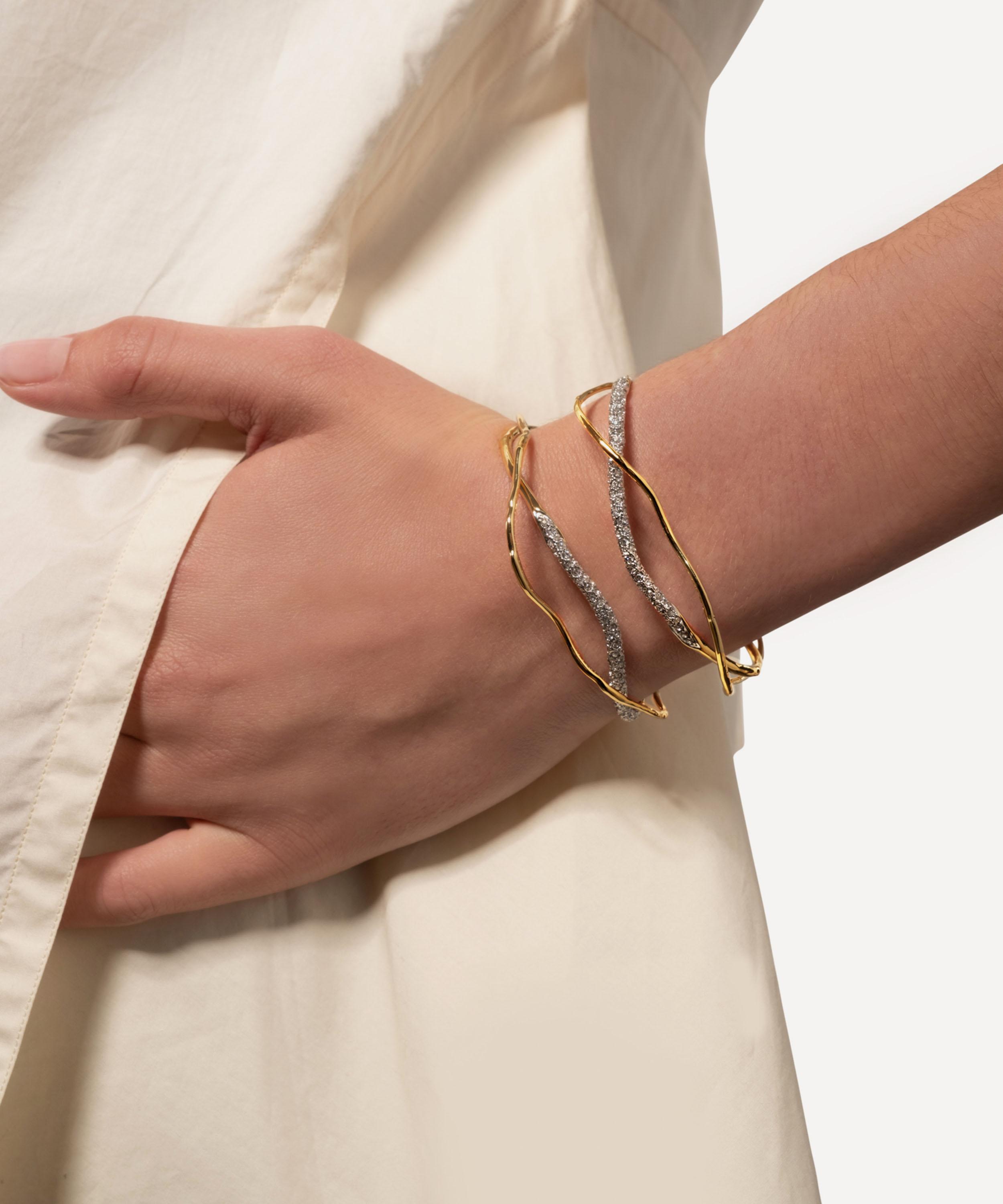 Exemplifying the brand’s bold and artistic aesthetic, Alexis Bittar presents the Solanales crystal cuff bracelet. Crafted from 14ct gold-plated brass, this bracelet features a molten cuff silhouette adorned with champagne-coloured pavé crystals. Pull it over your wrist and embellish your regular wrist stack with a statement piece.
