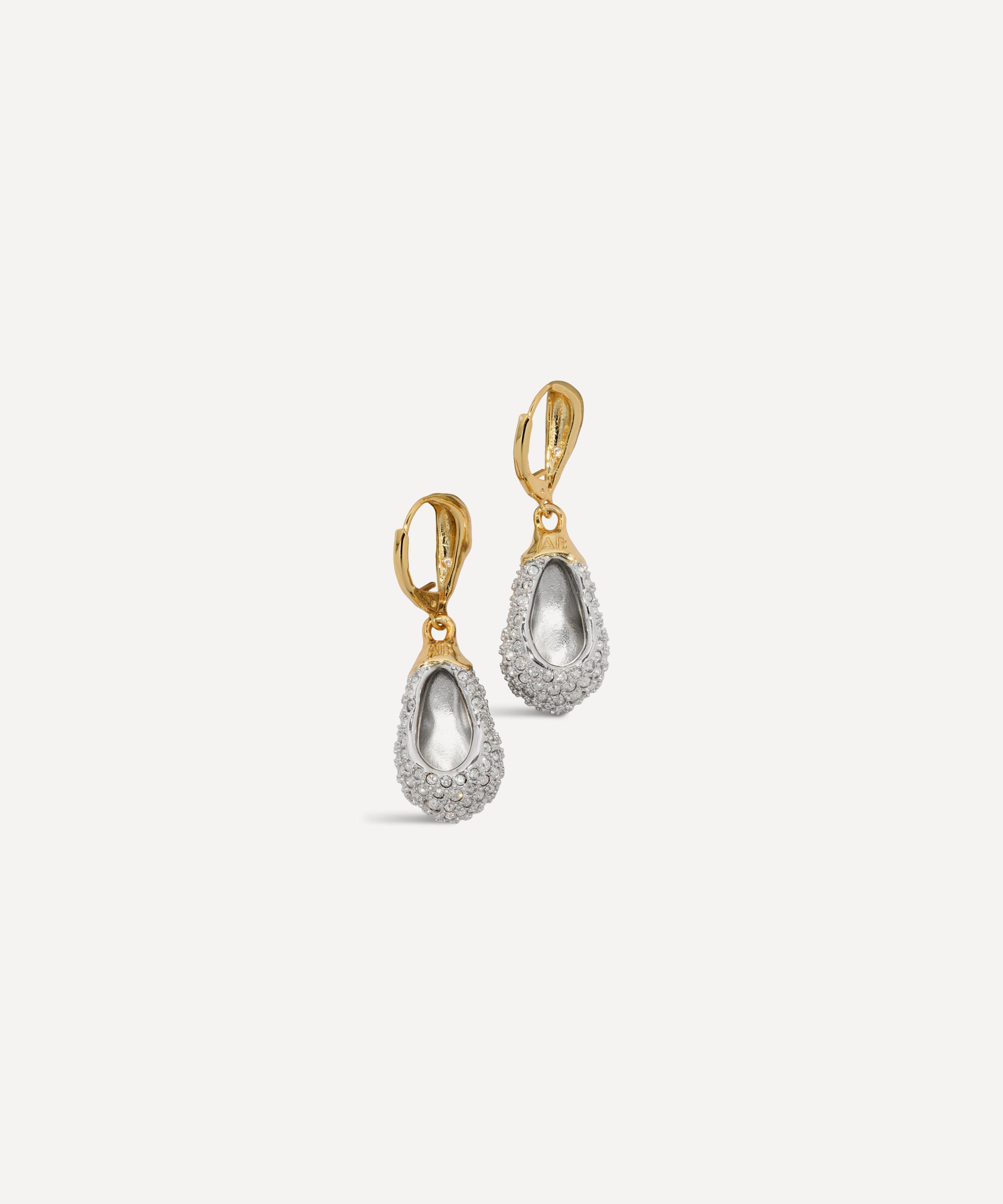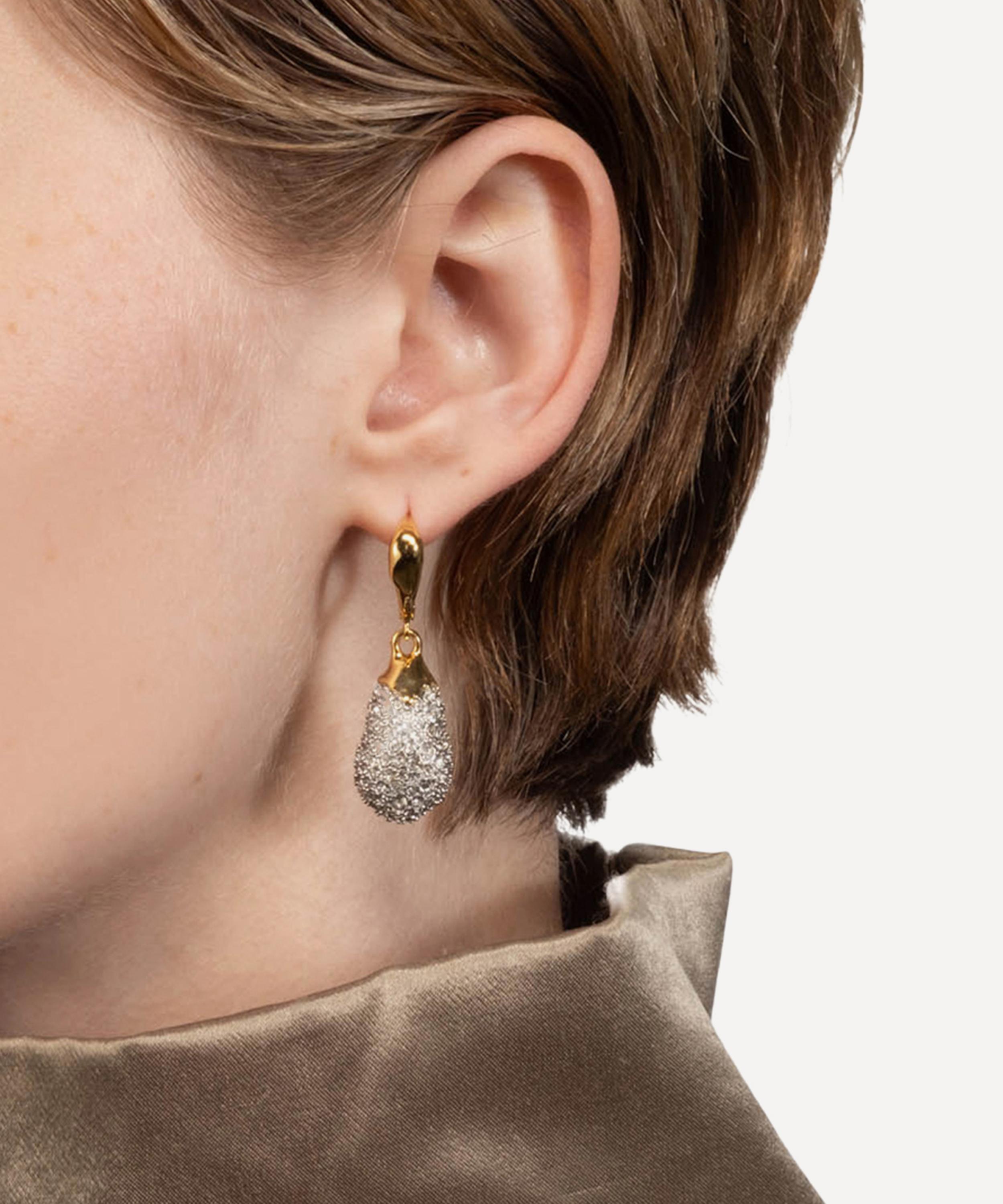 Exemplifying the brand’s bold and artistic aesthetic, each earring is crafted from 14ct gold-plated brass, featuring molten metalwork glistening with a crystal pavé atop imitation rhodium. Let these vintage-inspired earrings shine on their own or team them with studs and small hoops for a curated stack.