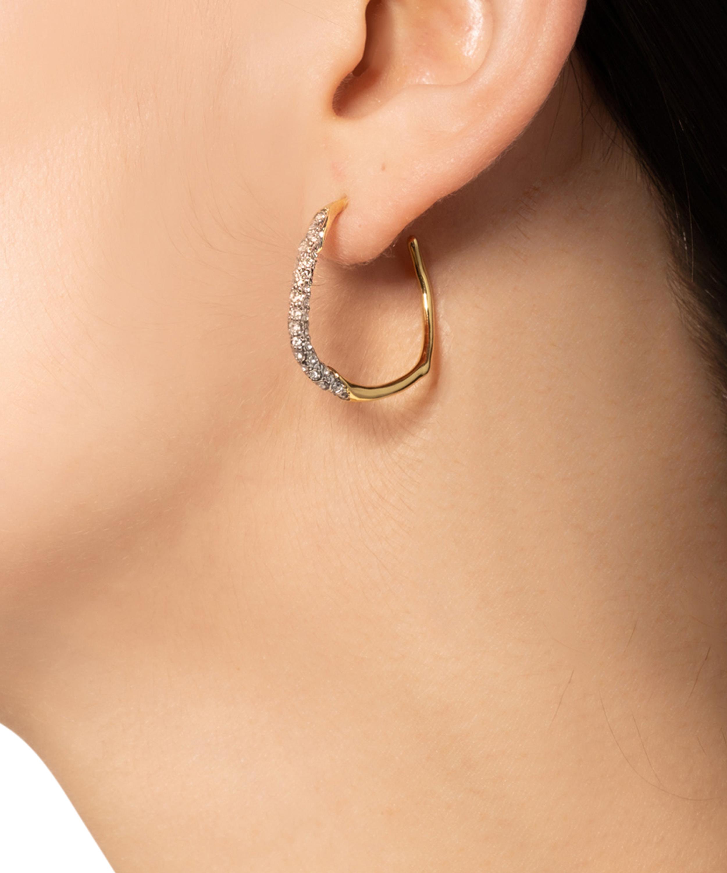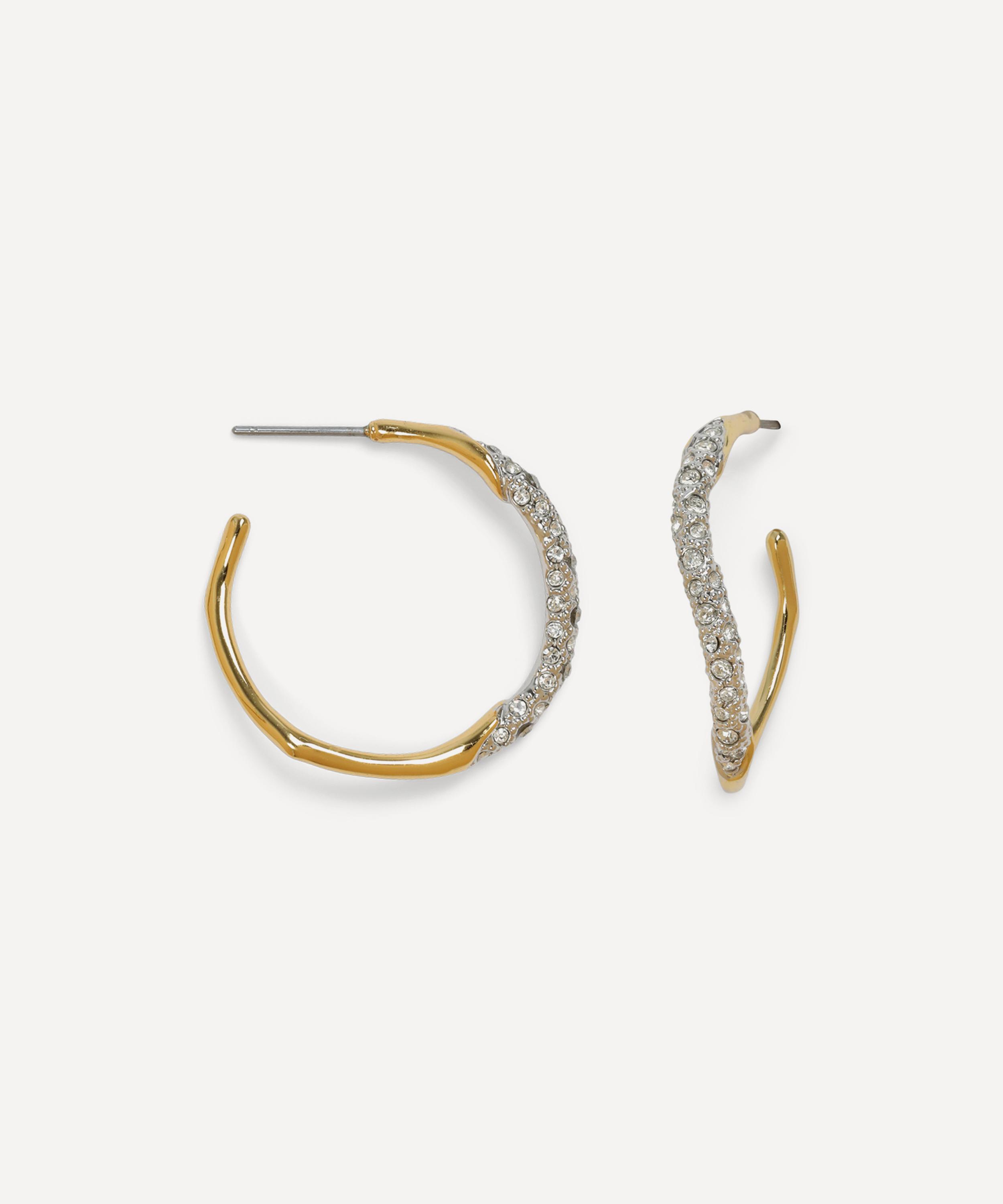 Exemplifying the brand’s bold and artistic aesthetic, Alexis Bittar presents these Two Tone hoop earrings. Crafted from 14ct gold-plated brass, each earring features a molten hoop adorned with champagne-coloured pavé crystals. Wear them on their own, or stack them with other piercings and graduating hoops for a trend-led take.