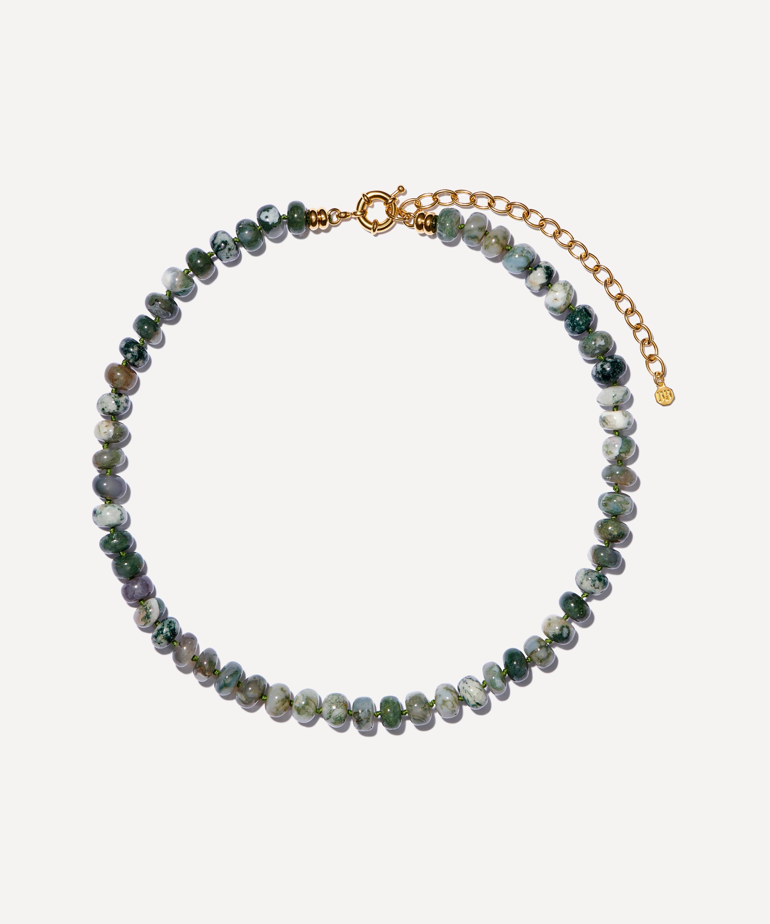 Bring a unique touch to your outfit with this uplifting bead necklace from Bon Bon Jewellery Club. Handcrafted from brass plated in 14ct gold vermeil, it is strung with moss agate – an earthy gemstone said to help flowers bloom brighter, referred to as the ‘Stone of Gardeners’, it reflects nature and encourages a sense of tranquillity. Style it solo as a statement piece or layer it with other beaded designs from the brand's collections.