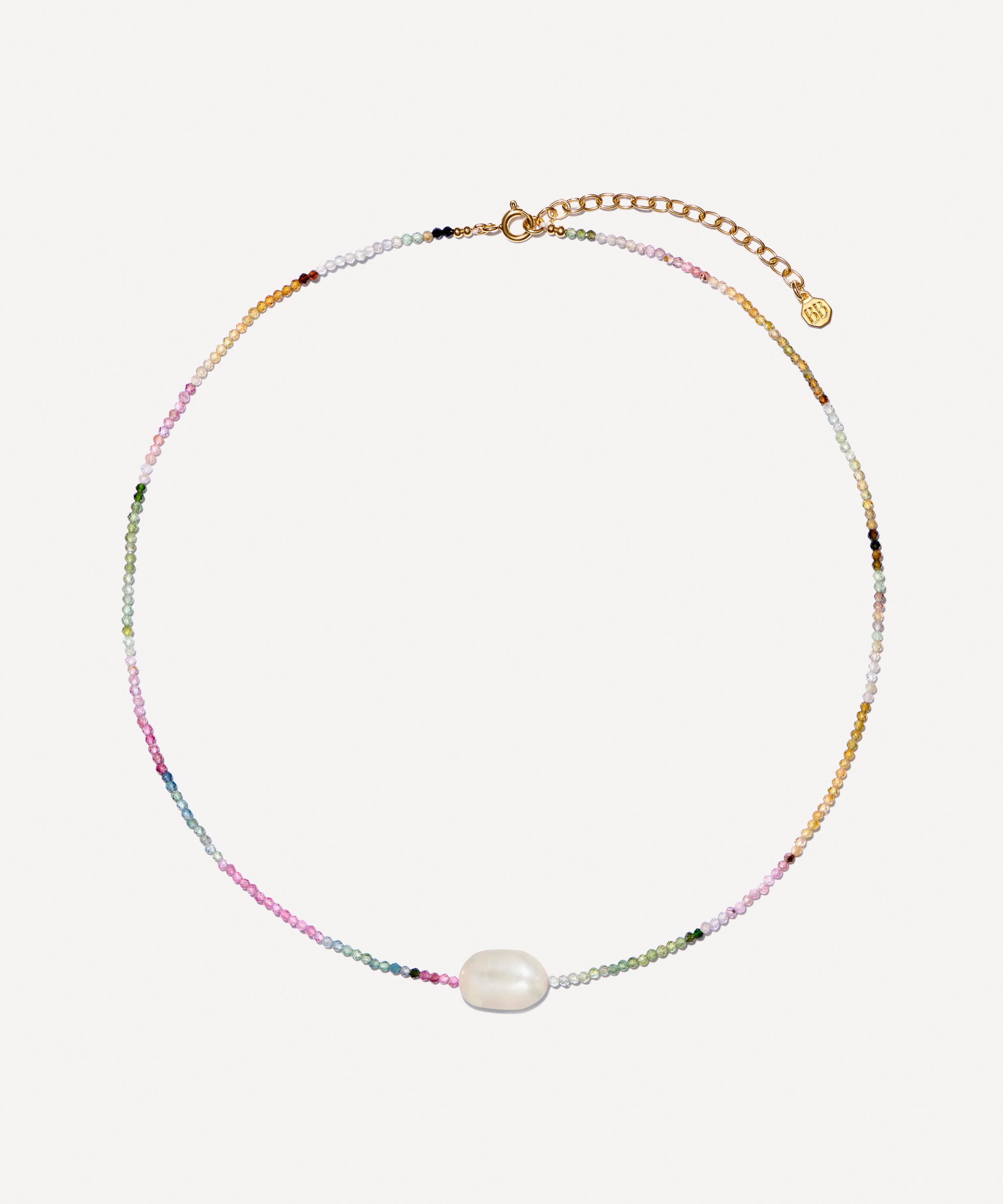 Add a playful pop of colour to your outfit and draw all eyes on you with this mood-boosting bead necklace from Bon Bon Jewellery Club. Handcrafted from brass plated in 14ct gold vermeil, it features a single thread knotted with a lustrous freshwater pearl and watermelon tourmaline beads – a gemstone linked to love and joy. Style it as a solo piece, stack it with contrasting gold chains and pendant necklaces or layer it with other beaded designs from the brand for a unique take on dopamine dressing.