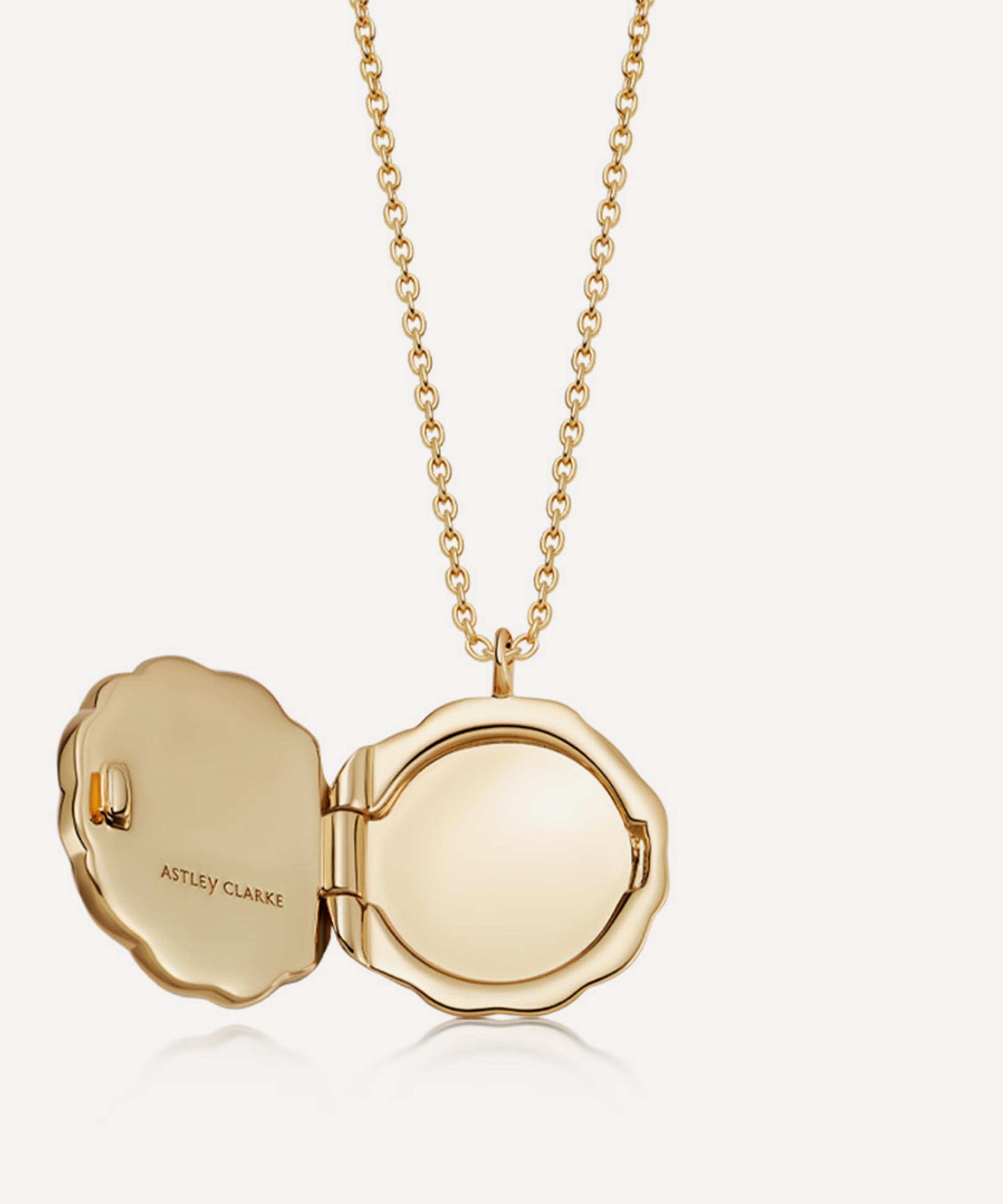 Crafted from sterling silver plated in 14 carat gold vermeil, this diamond locket necklace is part of Astley Clarke’s Asteri collection – a fine-jewellery compilation of kinetic pieces with shimmering diamonds.
