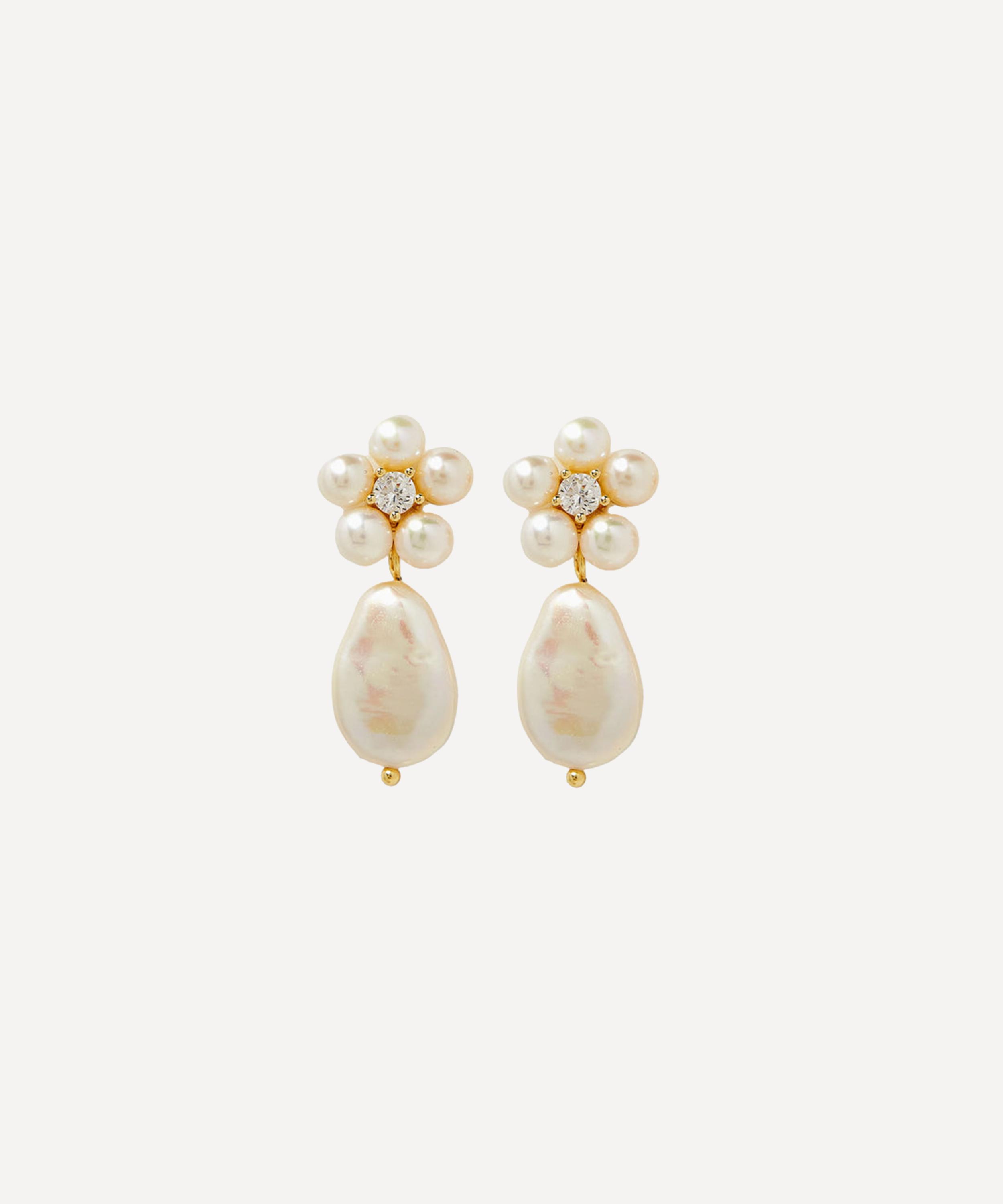 The perfect blend of sophistication and playful femininity, liven up your look with SHASHI’s Daisy pearl drop earrings. Crafted from sterling silver plated in 14ct gold vermeil, each earring features five freshwater pearls shaped into a dainty daisy flower, accented with a central cubic zirconia and an opulent baroque pearl drop. Complete with a classic post fastening, they’re perfect for special occasions and everyday wear, whether solo or stacked.