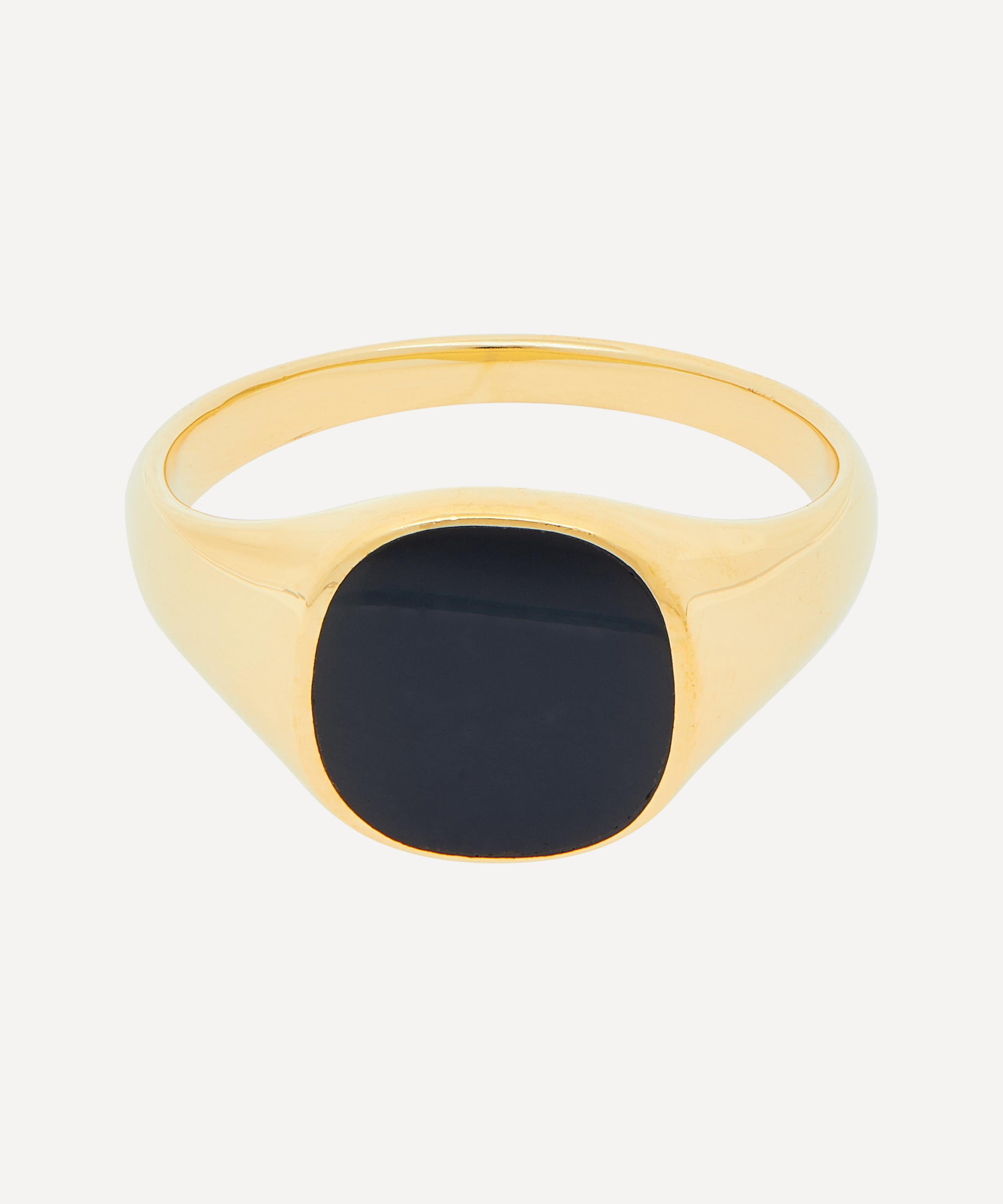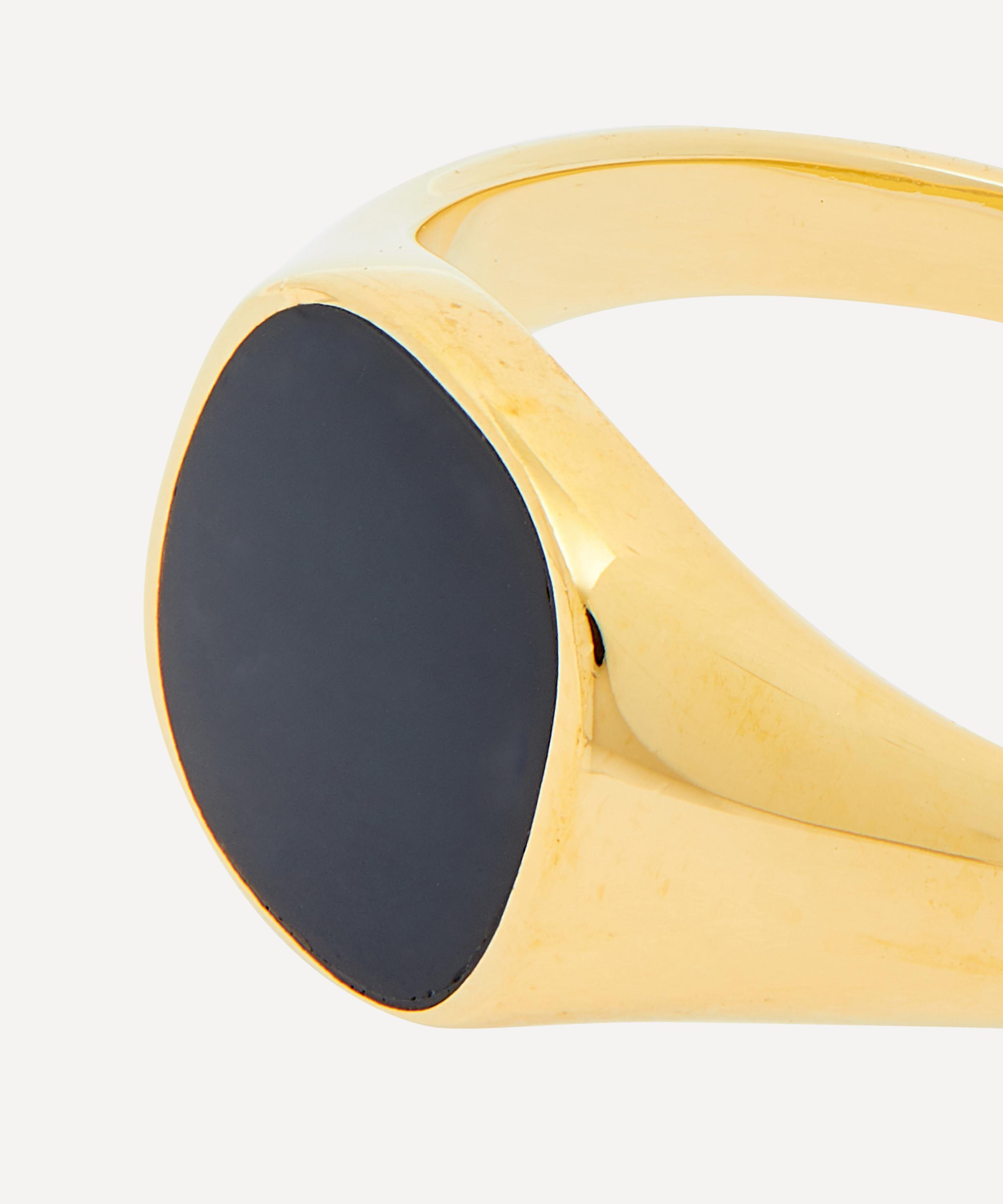 Handcrafted from 14ct gold plated vermeil silver, this signet ring oozes modernity, featuring a simple round face with a black enamelled design to provide a bold, eye-catching contrast to the classic silhouette and is complete with a gleaming high-polished finish.