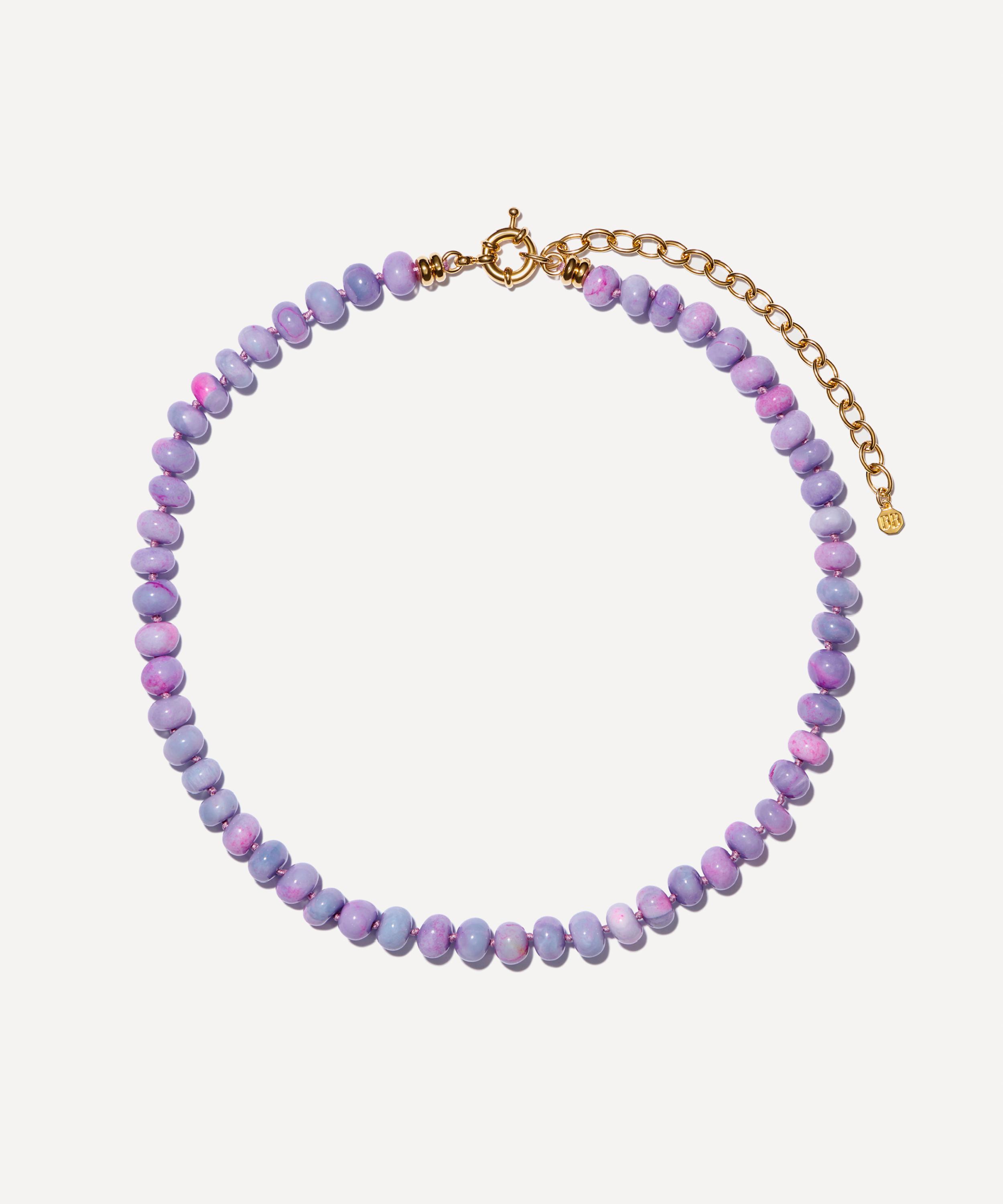 Add a playful pop of colour to your outfit and draw all eyes on you with this mood-boosting bead necklace from Bon Bon Jewellery Club. Handcrafted from sterling silver plated in 14ct gold vermeil, it features a single thread knotted with delectable, lilac opal beads – a gemstone known to amplify vibrational energy and inspire hope, optimism and positivity. Style it as a solo piece, stack it with contrasting gold chains and pendant necklaces or layer it with other beaded designs from the brand for a unique take on dopamine dressing.
