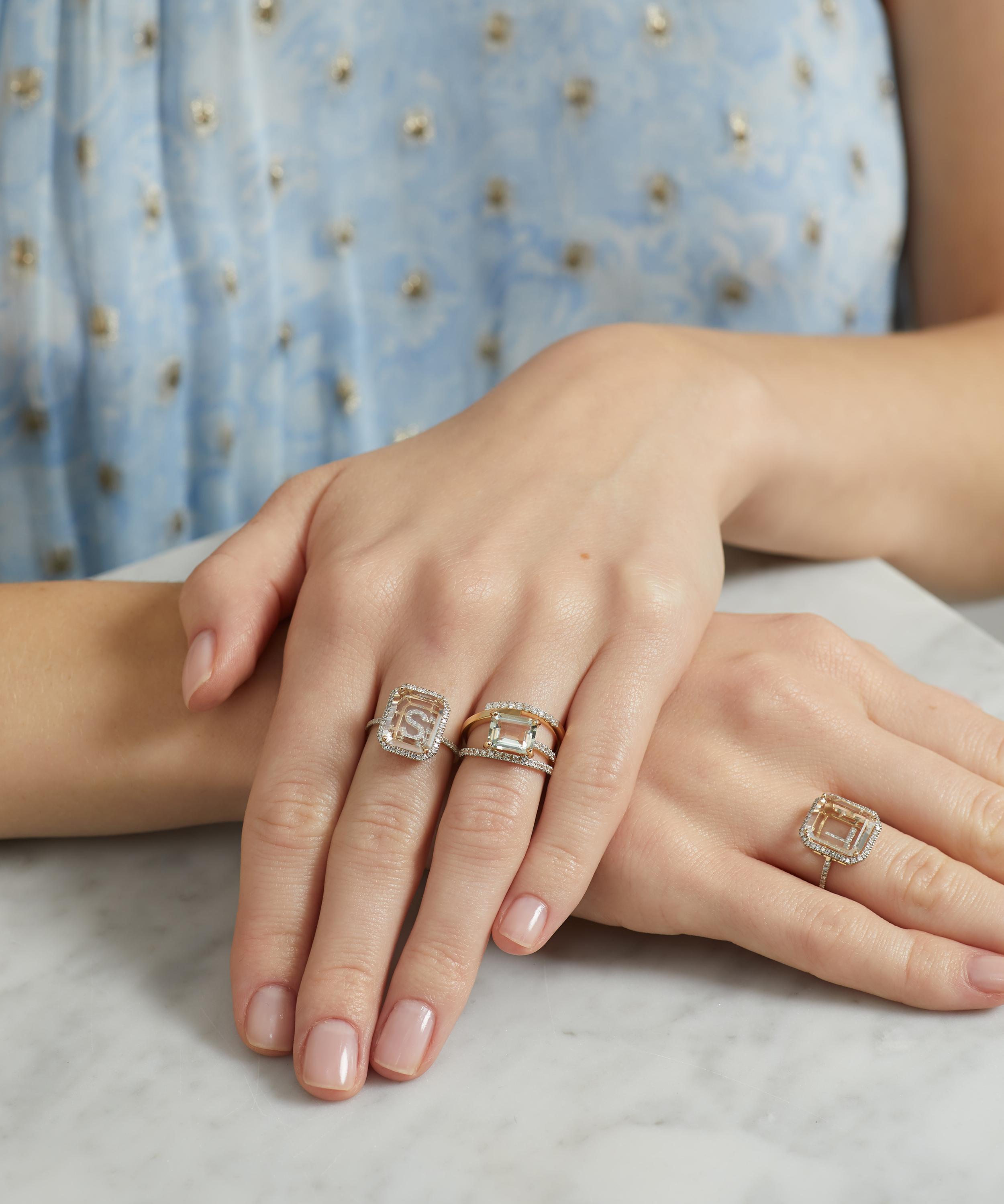 A striking addition to your ring stack, this band ring from Mateo embodies everyday luxury. Crafted from 14ct solid gold, this ring is characterised by an irregular, offset band adorned with sparkling diamonds and a green amethyst centre stone.