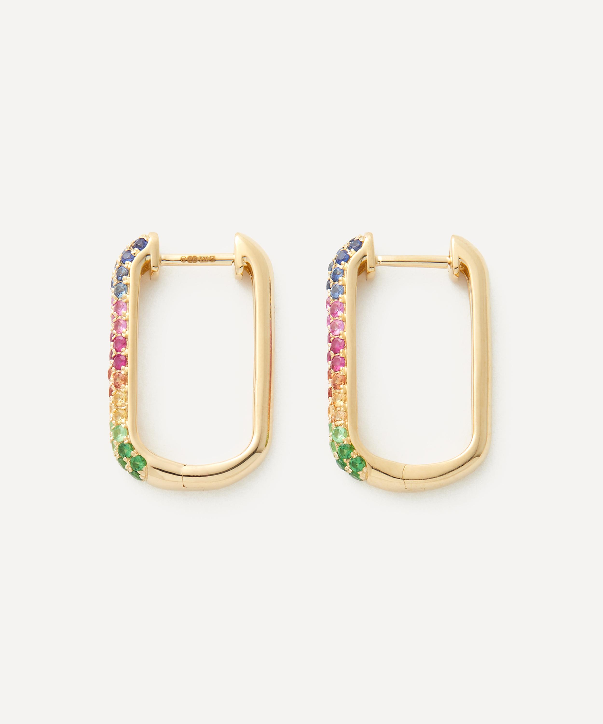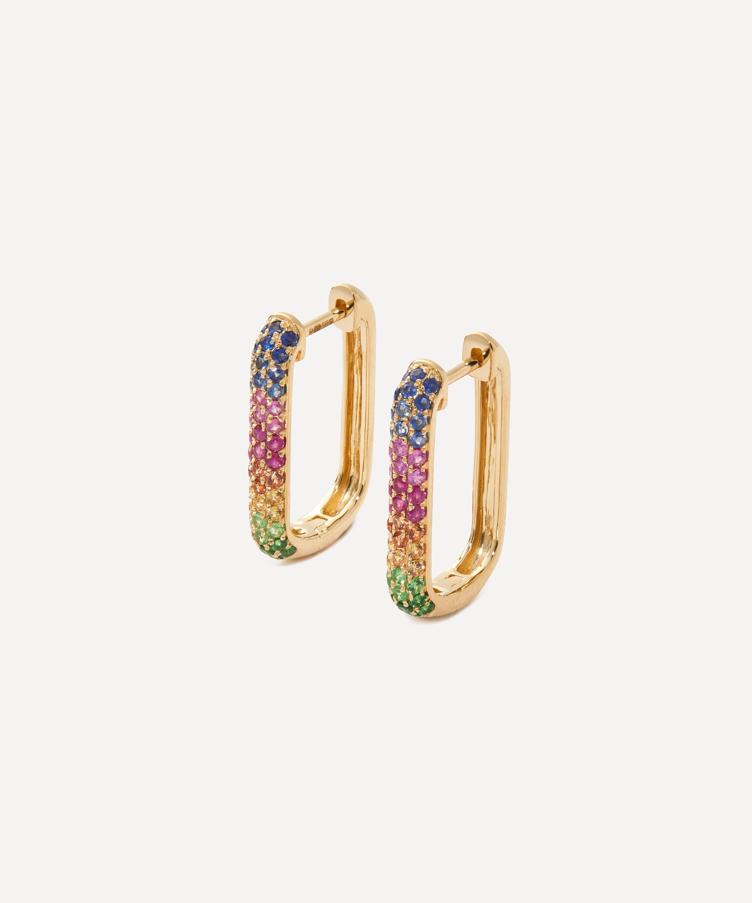 Bring good luck and playfulness to your ear stack with the Rainbow Ombré Oval hoop earrings by Roxanne First. Crafted from 14ct gold, each earring features an oval silhouette embellished with pavé-set rainbow sapphires. Style them on their own, or team with small studs and other gemstone hoops for a layered look.