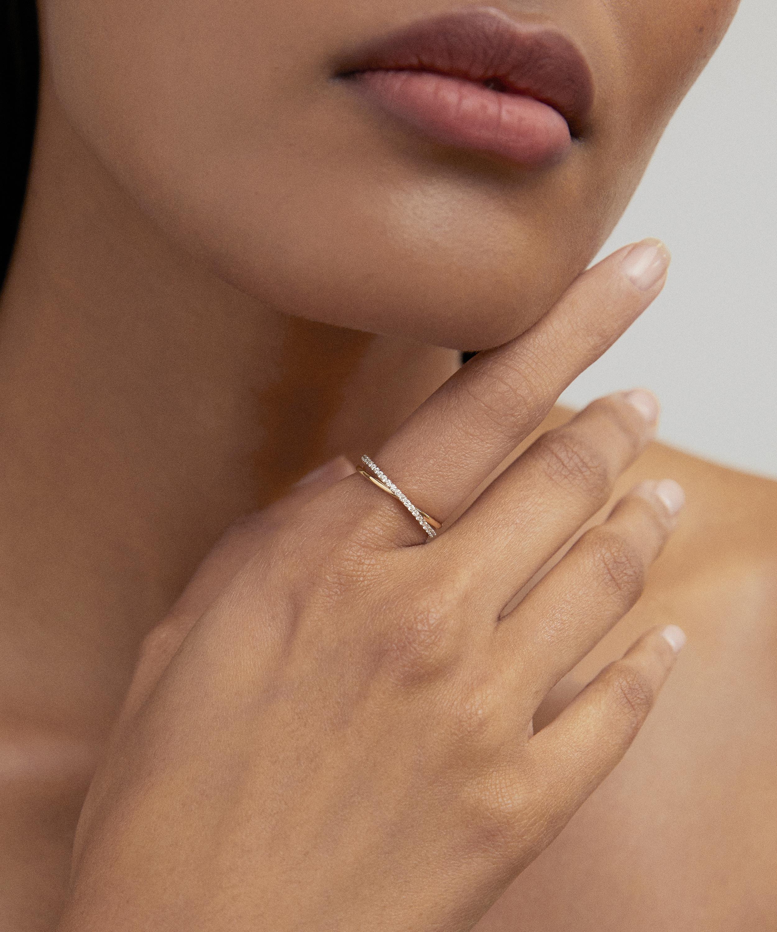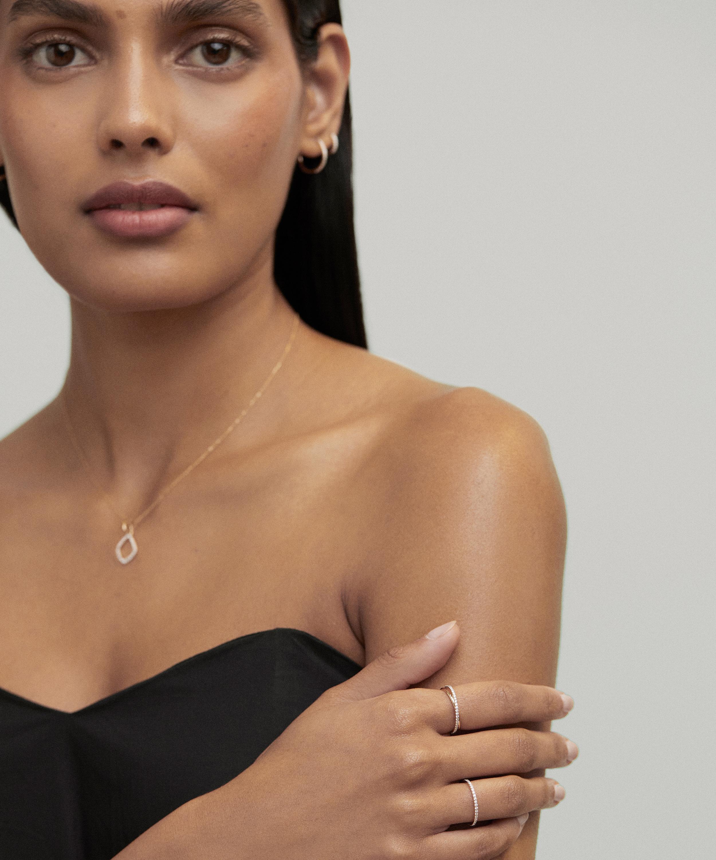 This ring is characterised by a crossed, subtly irregular silhouette that epitomises the organic aesthetic of the collection. Adorned with a glittering white diamond pave’, it’s perfect for both day and night dressing. Style it with the matching Riva hoops for a coordinating look, or mix and match with other styles from the brand for a carefully curated evening look.