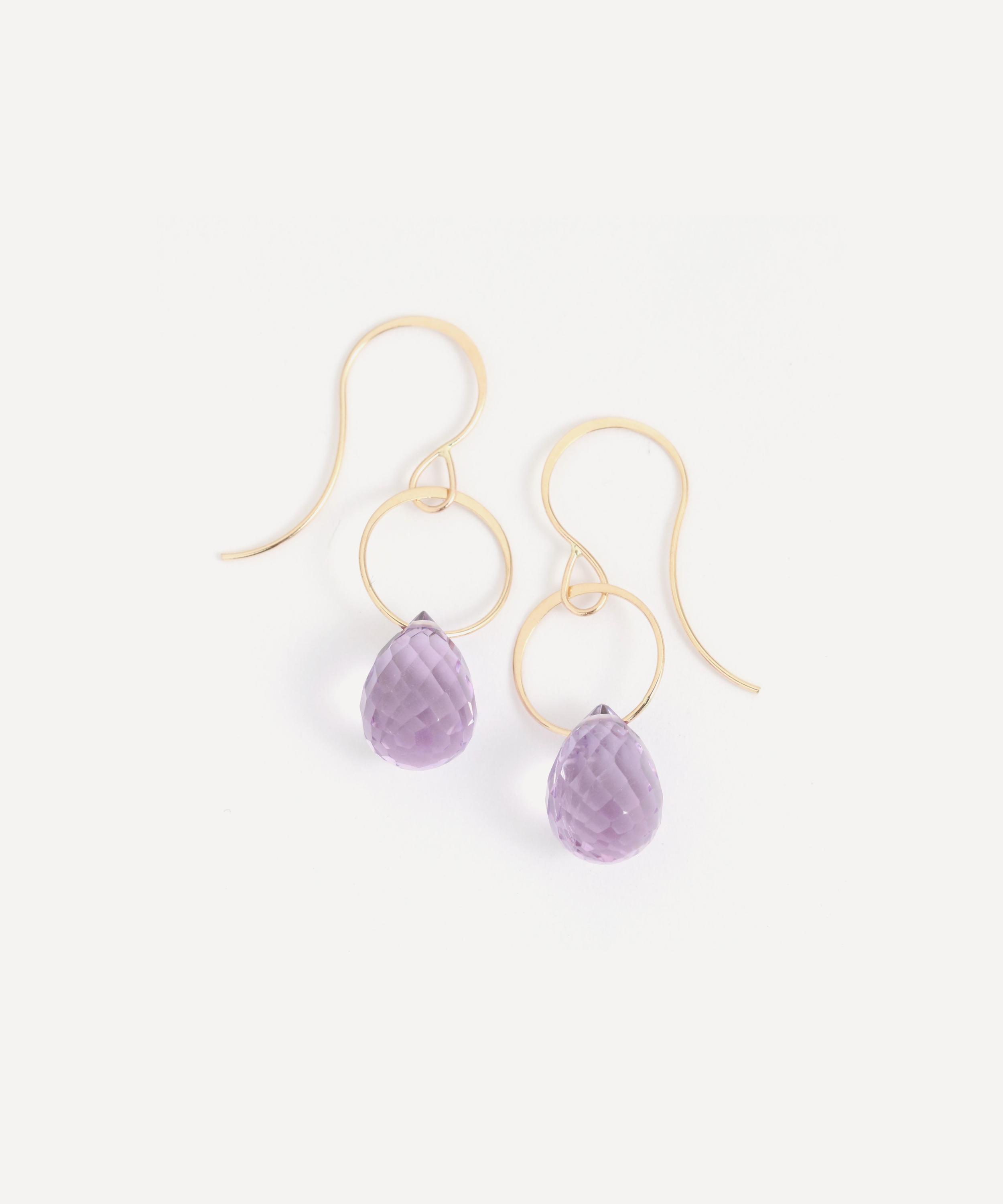 The amethyst drop earrings by Melissa Joy Manning exemplify the designer’s expert eye for intricate metalwork. Each earring features an easy-to-wear wire hook that’s been hammered flat and punctuated by a circle link and faceted amethyst drop.