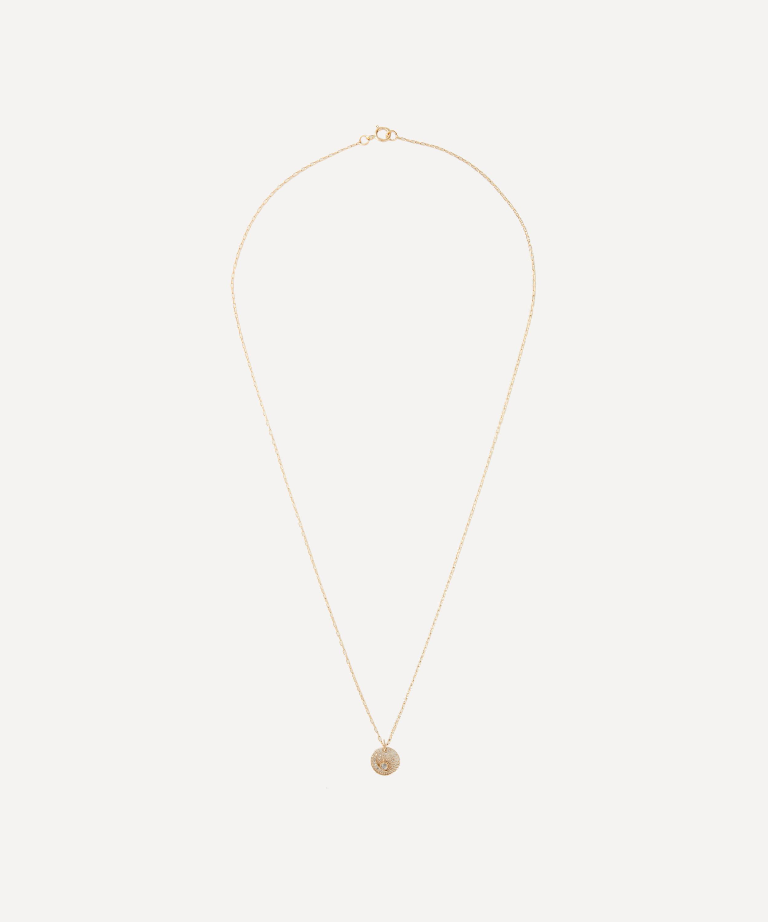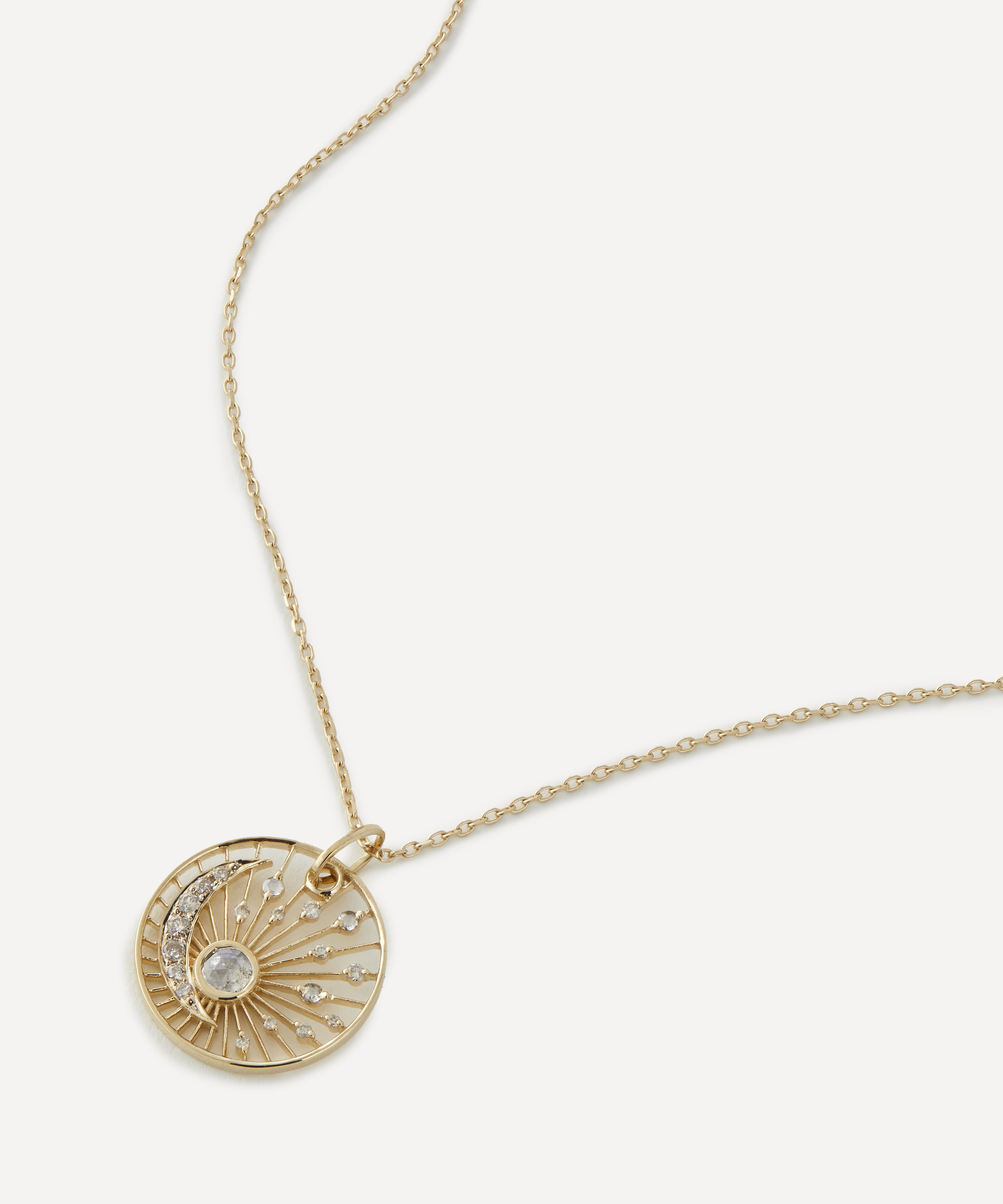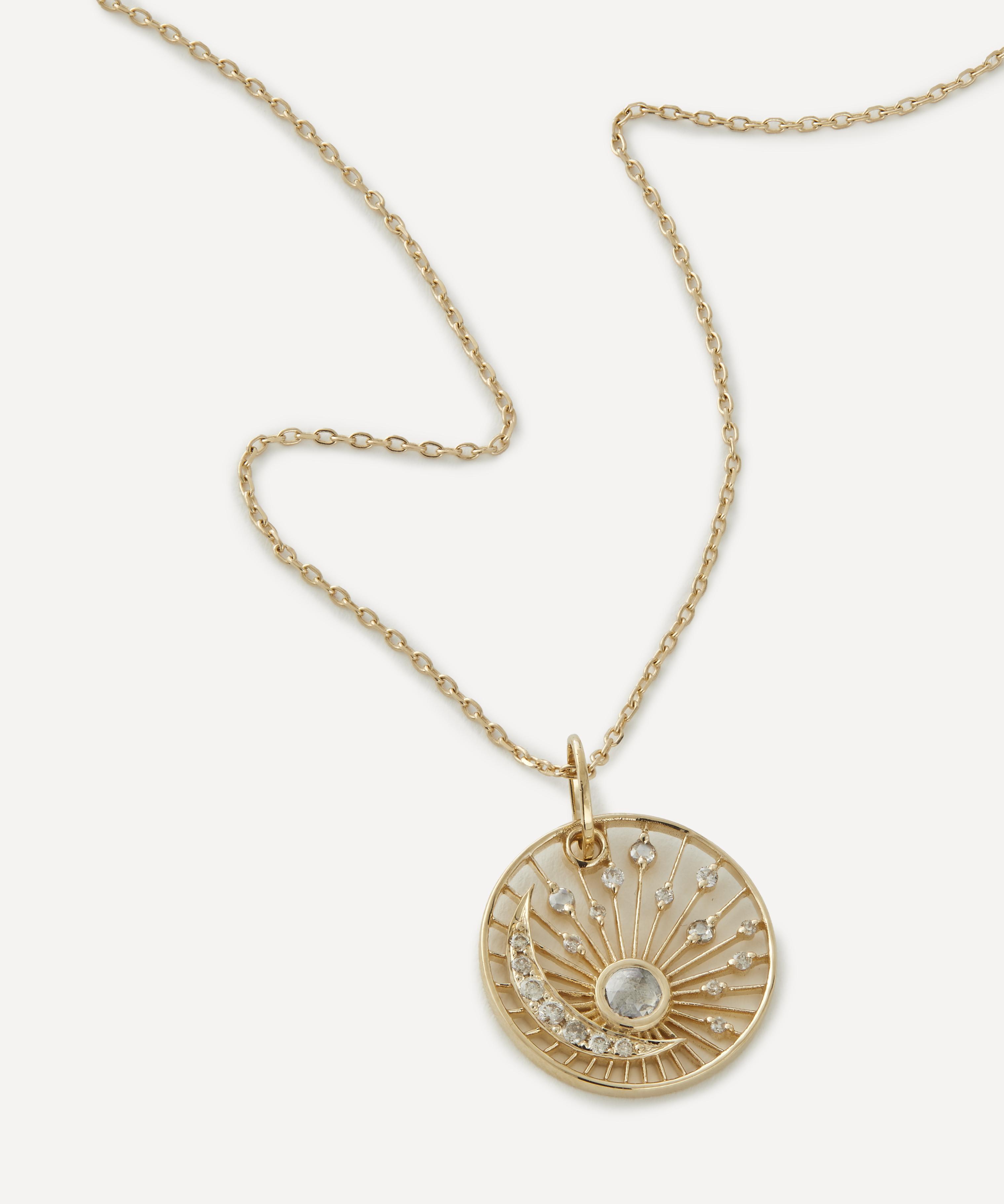 Amplify the impact of your outfit and draw on the spiritual energy of gemstones through this unique and symbolic pendant necklace by Celine Daoust. Meticulously crafted from solid 14ct gold, it features a fine cable chain and ‘dream catcher’ pendant, intricately ornate with a diamond set open sun and crescent moon motif, including scattered diamonds reminiscent of tiny dewdrops. With its openwork design, it allows light to pass through, eliminating negative energy and keep dreams intact to make them a reality. Radiating with totemic energy, this stunning talisman can be worn solo or stacked.