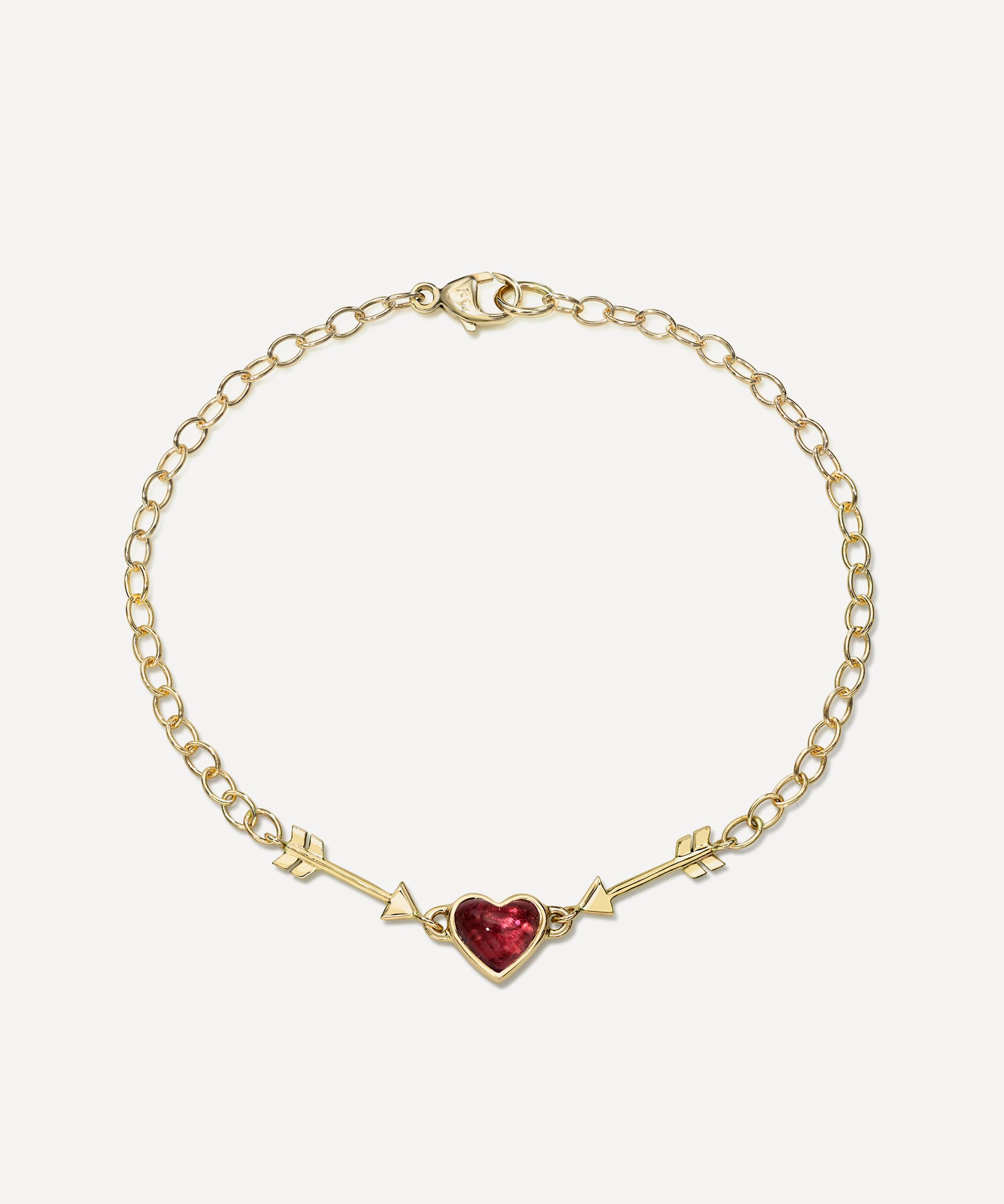 Presented on a 14ct gold chain, this bracelet features a juicy pink tourmaline heart to the centre, flanked by gold arrows. Handmade in Rachel Quinn's LA studio, try styling it with a pair of the designer's whimsically creative drop earrings for a dreamy curation of wearable works of art.