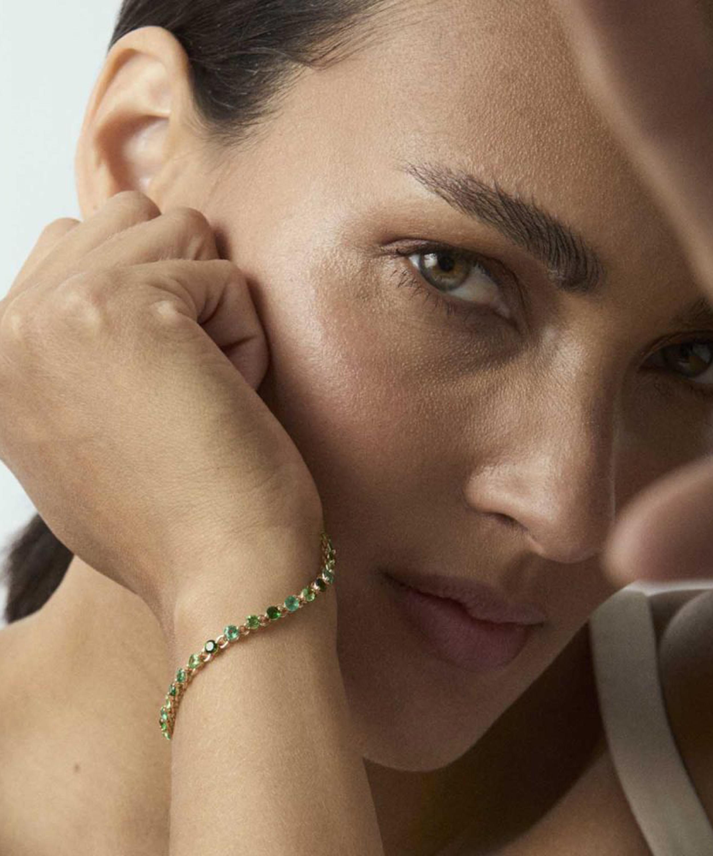 Inspired by classic tennis bracelets, it’s rendered in 14ct gold, featuring vibrant gemstones in lushes green tones, including emerald and tsavorite, with a sprinkling of diamonds adorning the box clasp. Wear it solo with a pair of elegant drop earrings, or incorporate into a layered wrist curation for more impact.
