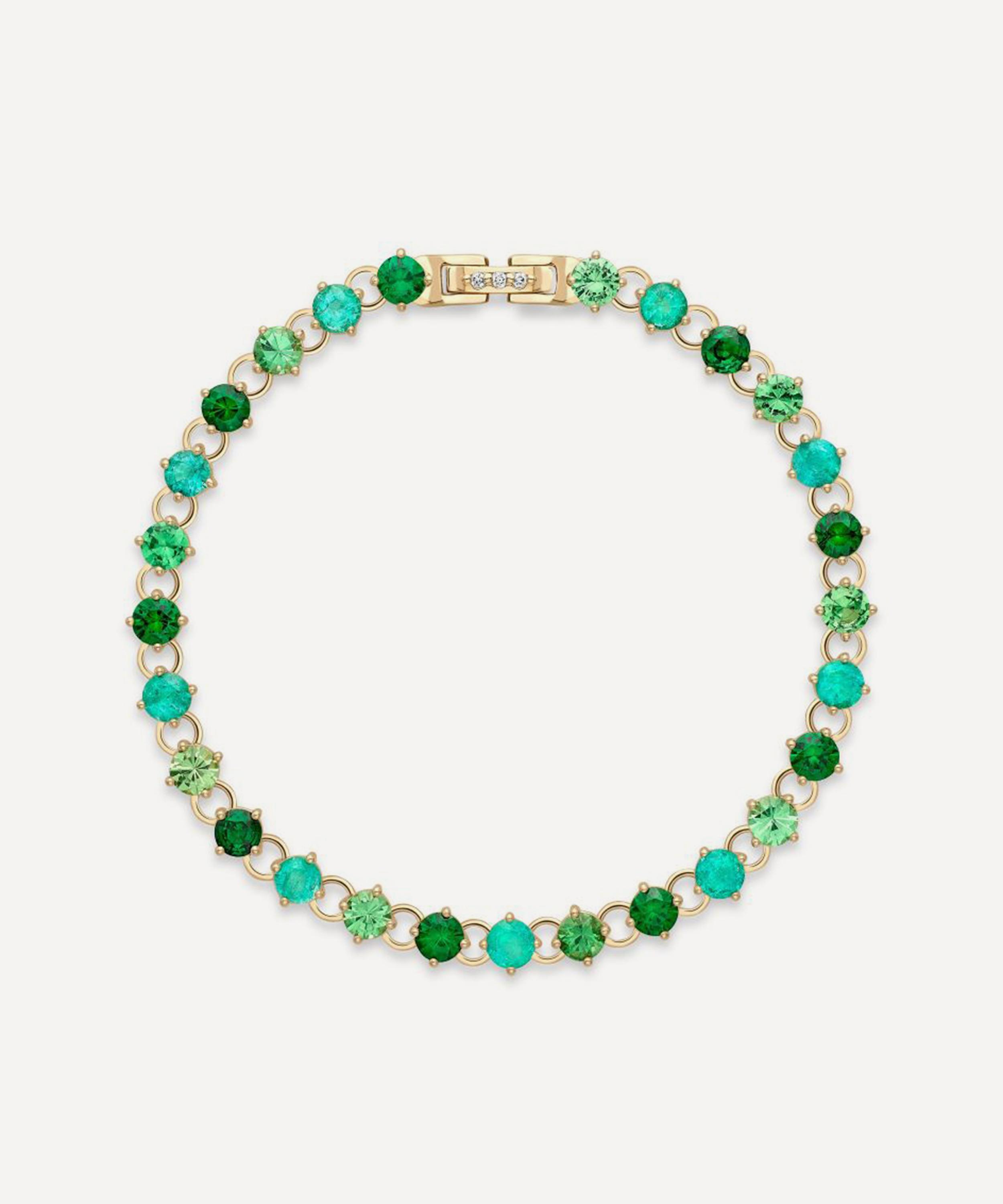 Inspired by classic tennis bracelets, it’s rendered in 14ct gold, featuring vibrant gemstones in lushes green tones, including emerald and tsavorite, with a sprinkling of diamonds adorning the box clasp. Wear it solo with a pair of elegant drop earrings, or incorporate into a layered wrist curation for more impact.