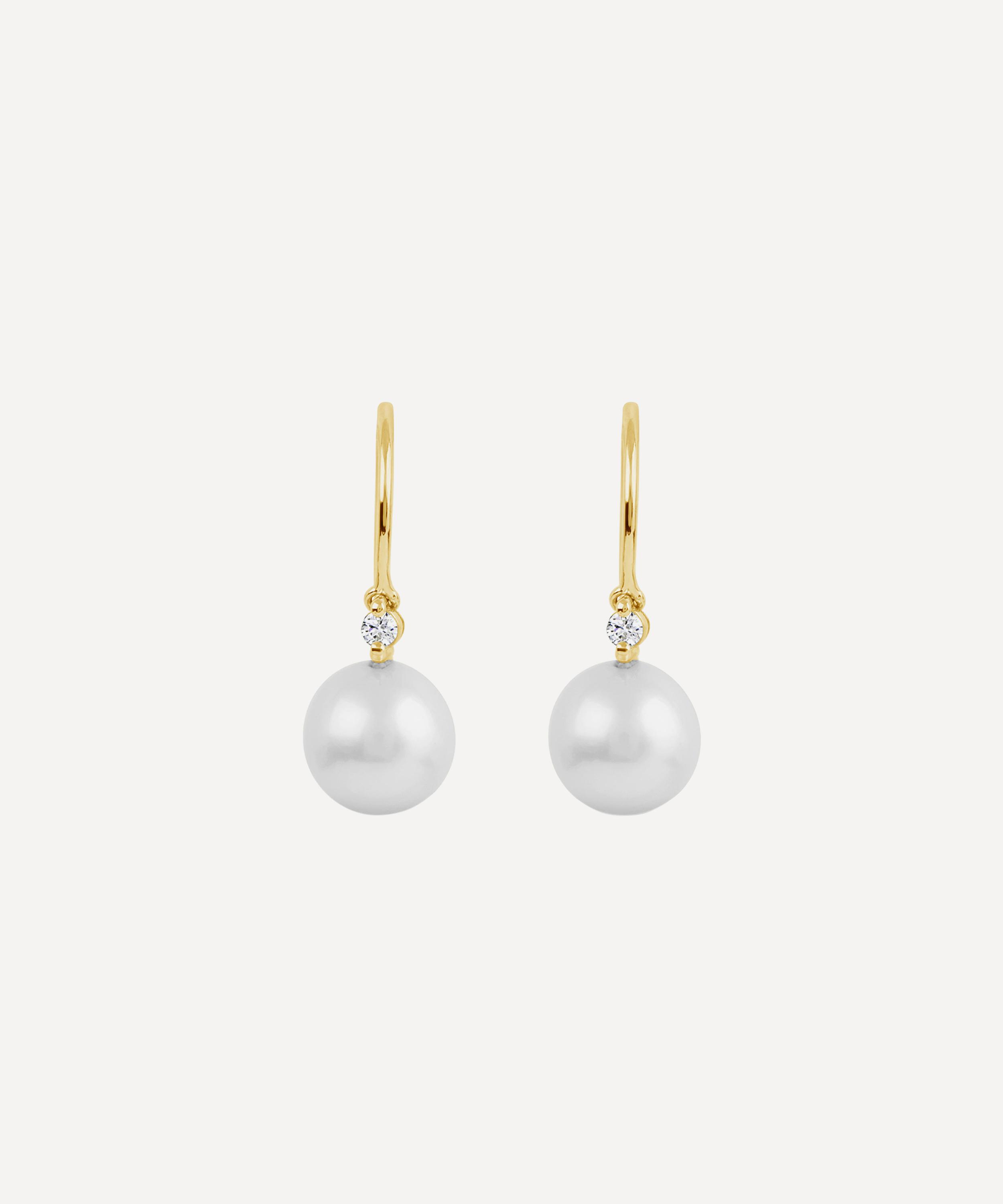 Inspired by the colourful jewelled costumes worn by traditional Sri Lankan dancers, Dinny Hall's Shuga collection showcases a myriad of vibrant gems, glittering diamonds and lustrous pearls. Each of these petite drop earrings features a perfectly rounded pearl topped with a tiny brilliant cut diamond and a polished 14 carat gold wire hook. Wear them alone or with an array of luminous, diamond-encrusted earrings for a light-catching, opulent finish.