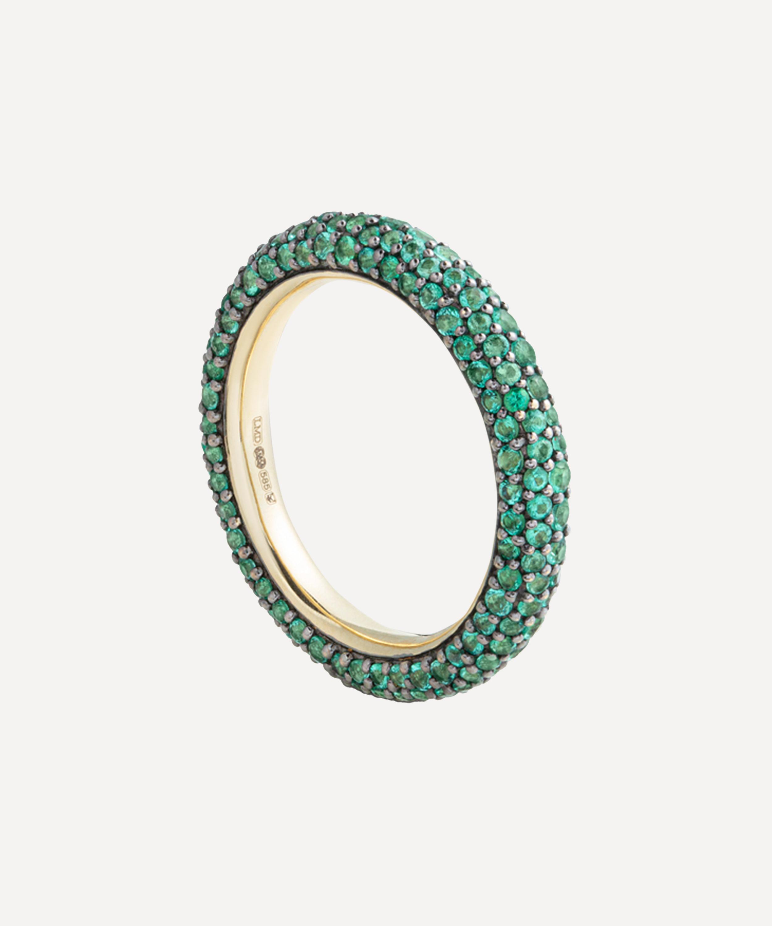 Crafted from 14ct gold, this ring features a sleek band adorned with a vibrant emerald pavé atop black rhodium. Referencing a vintage silhouette with a modern sentiment, it makes for a versatile addition to any jewellery collection. Weather worn alone or layered, it will instantly draw attention to both casual and formal looks with its subtle allure.