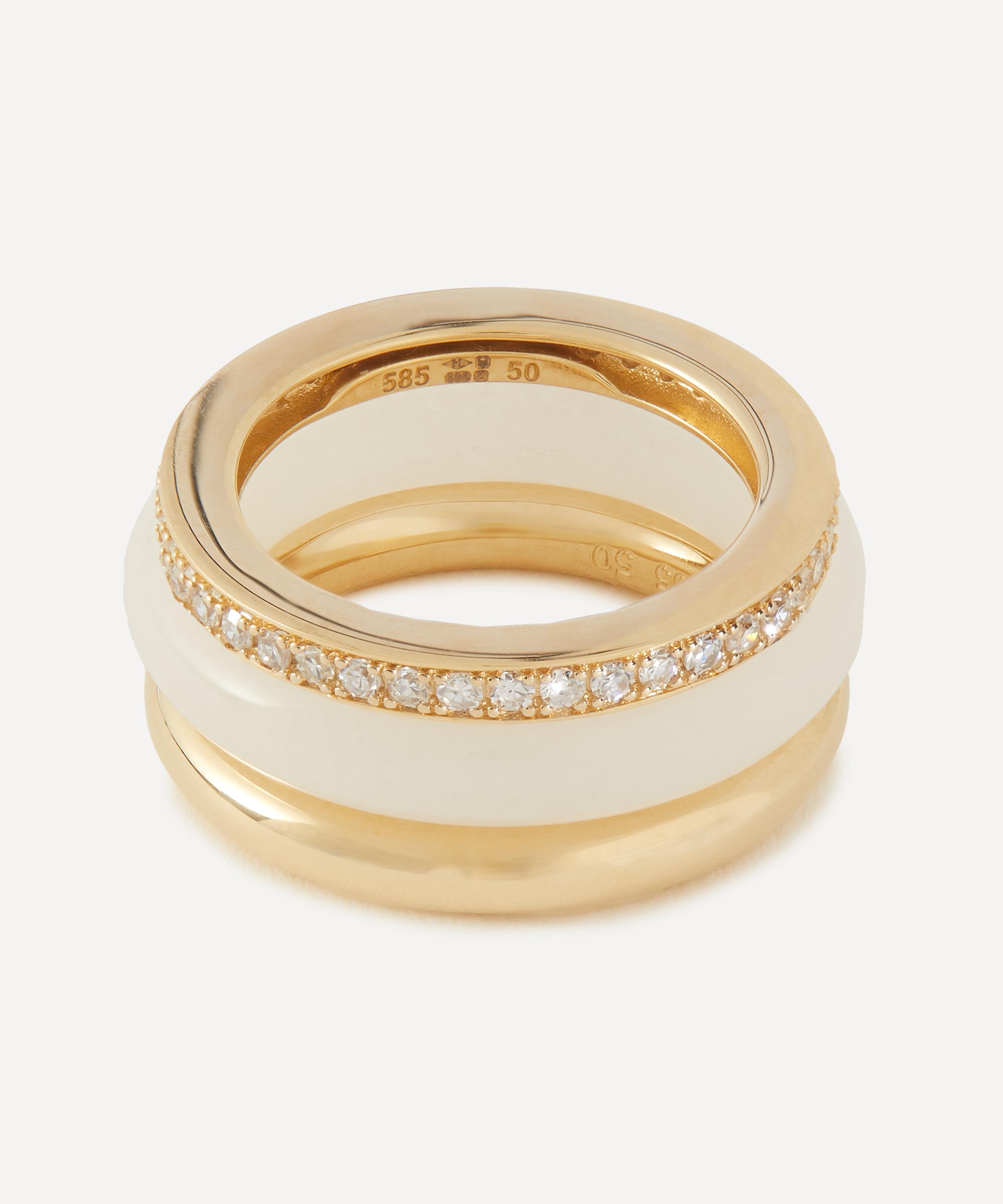 By Pariah shines a spotlight on the natural beauty of raw, untouched materials with this stacked ring. Epitomising elevated elegance, it features a three-band stack composed of a diamond embellished, 14ct gold band, a hand-carved white jasper band, a polished 14ct gold ring. Style them as a ring stack, wear them on separate fingers, or try wearing one as a subtle statement piece, alternating between them.
