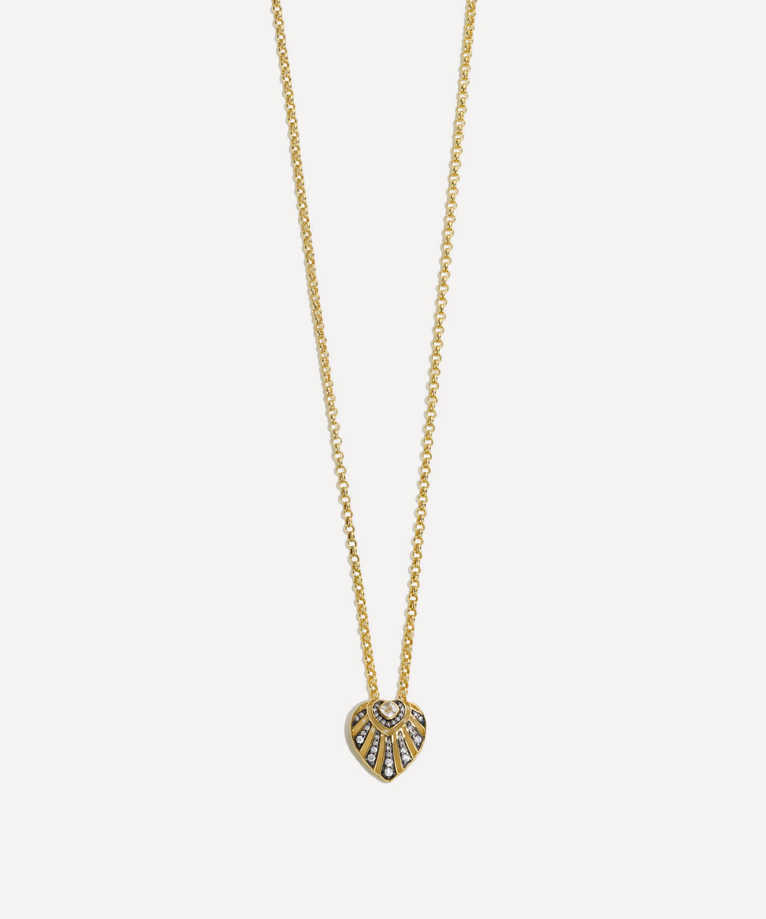 Epitomising elevated elegance, it features a heart-shaped pedant in 14ct gold, intricately decorated with open metal work, a central white sapphire and sparkling pavé diamonds set on black rhodium – radiating like piercing sun rays. Suspended from a luxurious belcher chain, style it solo and let it become the focal point or wear it with a selection of gold necklaces to create a bespoke stack.