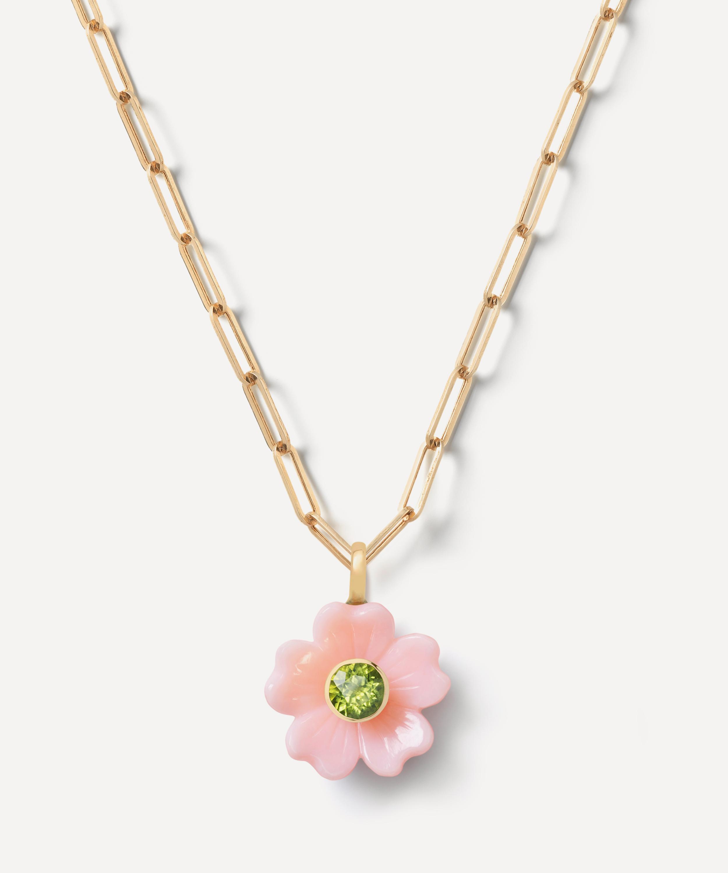 Inspired by the works of Hilma af Klint and Andy Warhol, it features a blossoming forget-me-not design composed of hand-carved pink opal petals and a brilliant cut peridot at the centre – a representation of positive energy, joy, and happiness. Suspended from a 14ct gold clasp, the pendant shimmers in a delectable colourway, perfect for pairing with Sophie Joanne’s Time To Bloom Necklace or Flat Link Chain Necklace – try teaming it with matching pieces from the brand for a truly efflorescent curation.