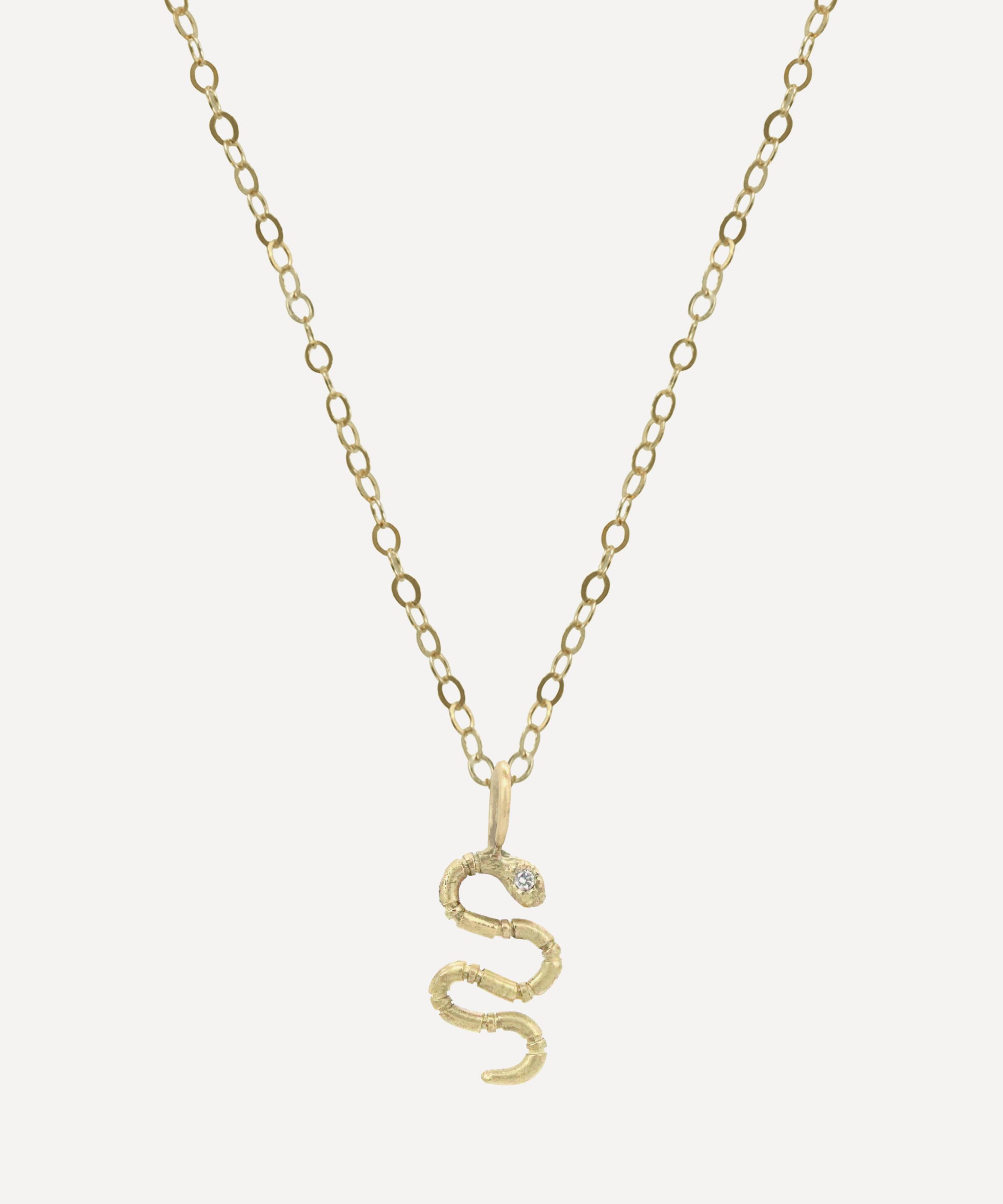 Meticulously crafted from solid 14ct gold, it features a classic link chain with a diamond set snake pendant – a symbol of renewal. Style it as a solo piece, or layer it with several of the brand’s amulet necklaces to create a meaningful curation that is personal to you.