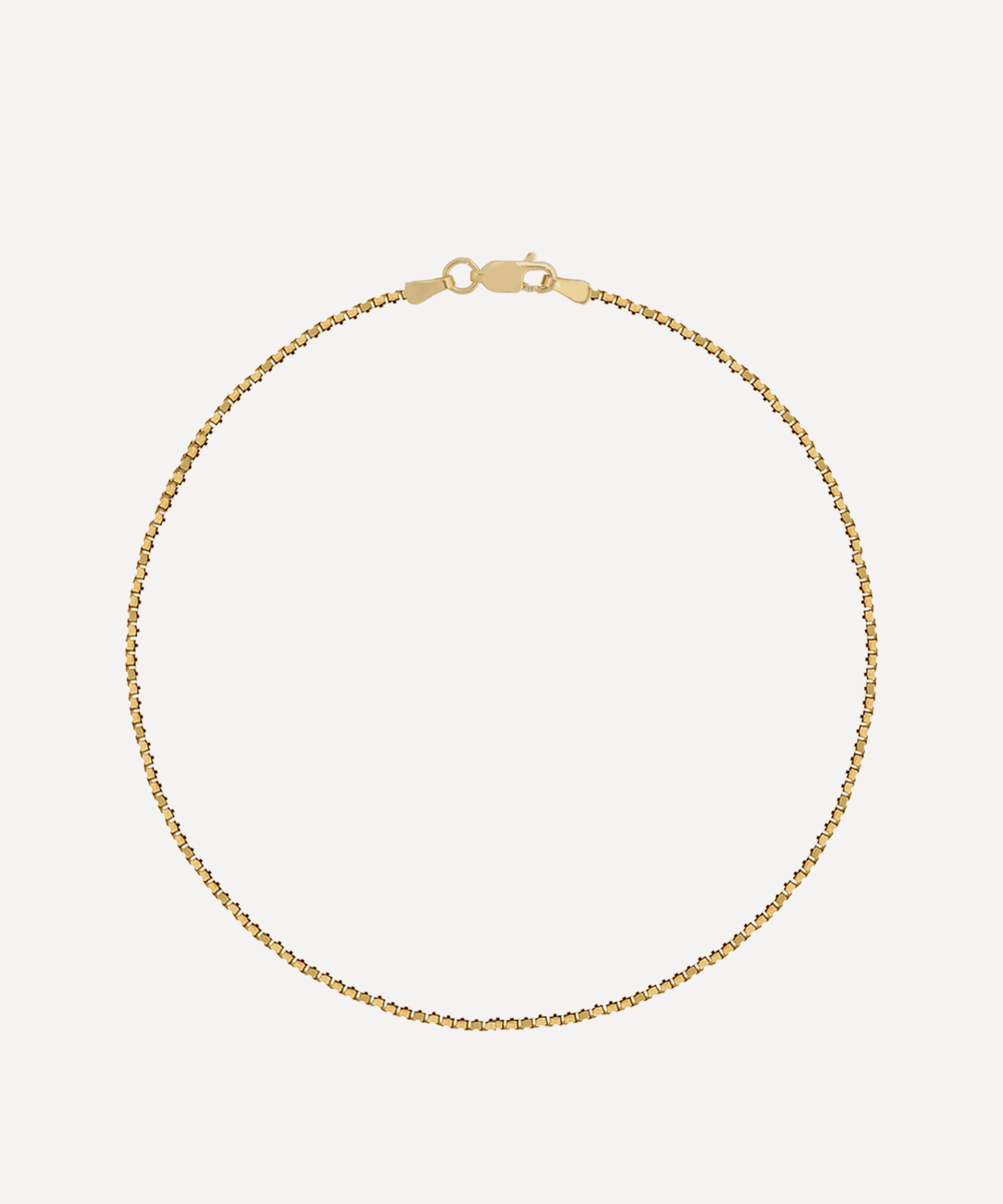 Handmade from 14 carat gold, this elegant piece features a fine box chain in a polished finish, and is complete with a lobster clap closure – style it alone, or layer with other bangles and chain bracelets for an on-trend wrist stack.