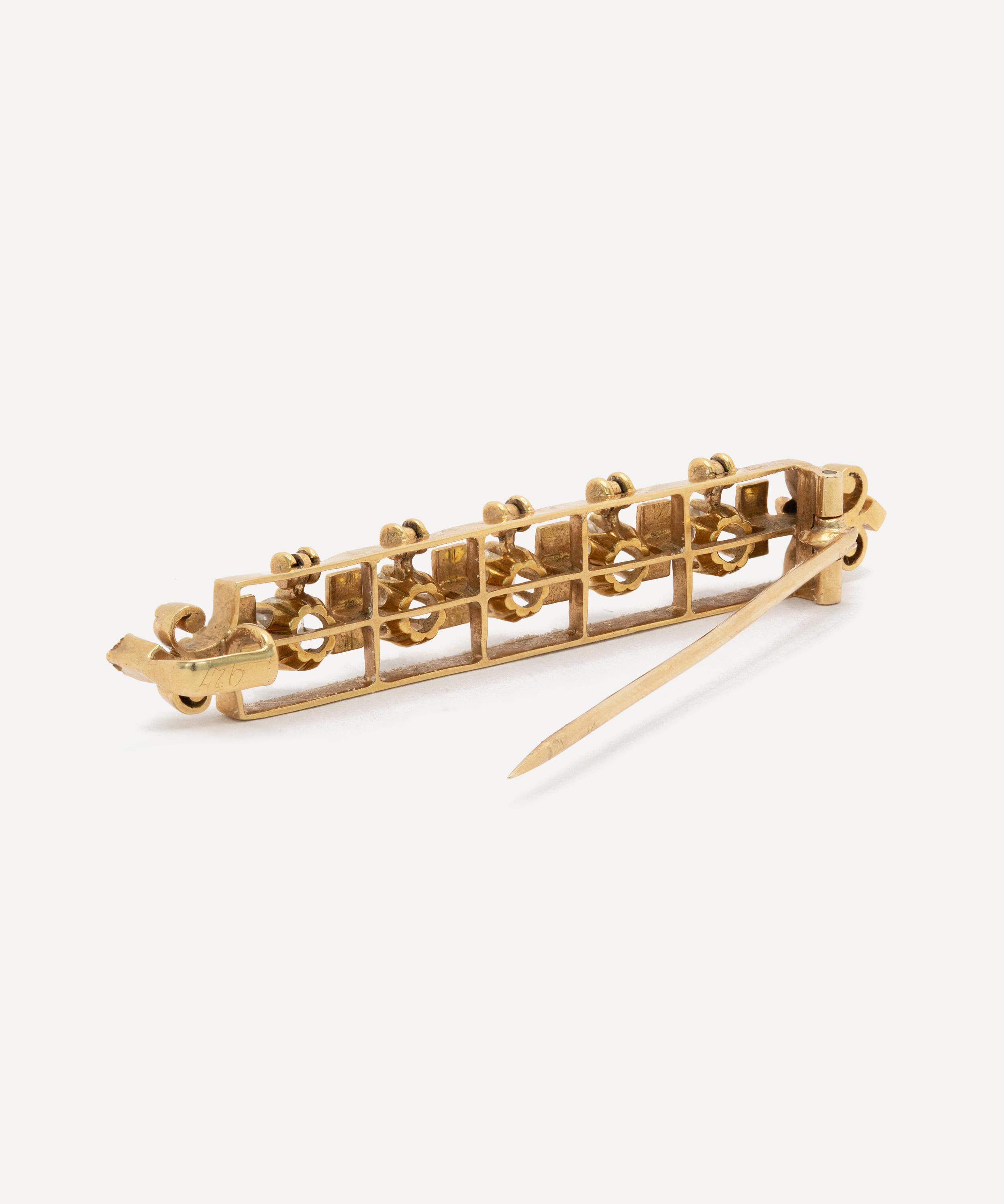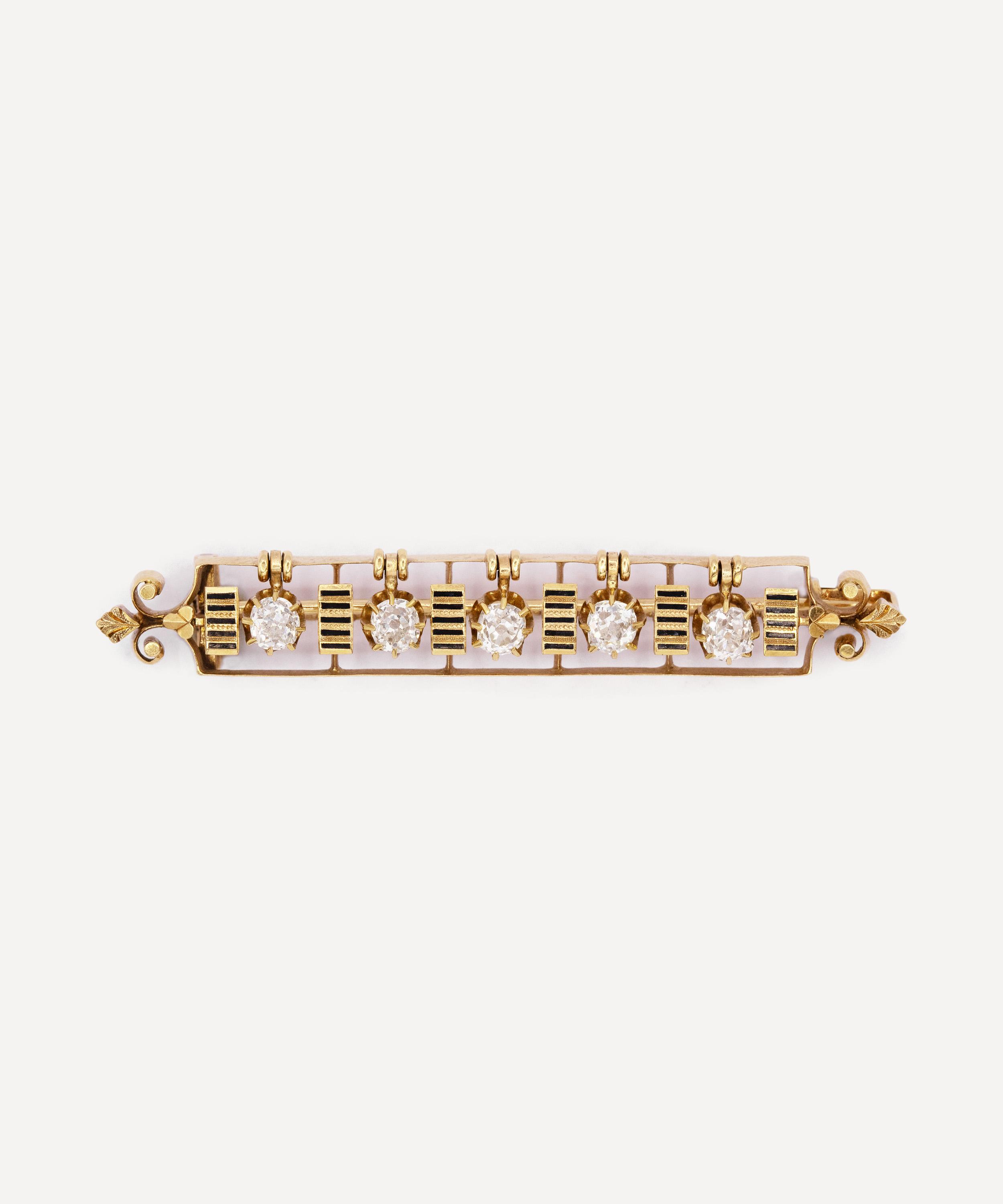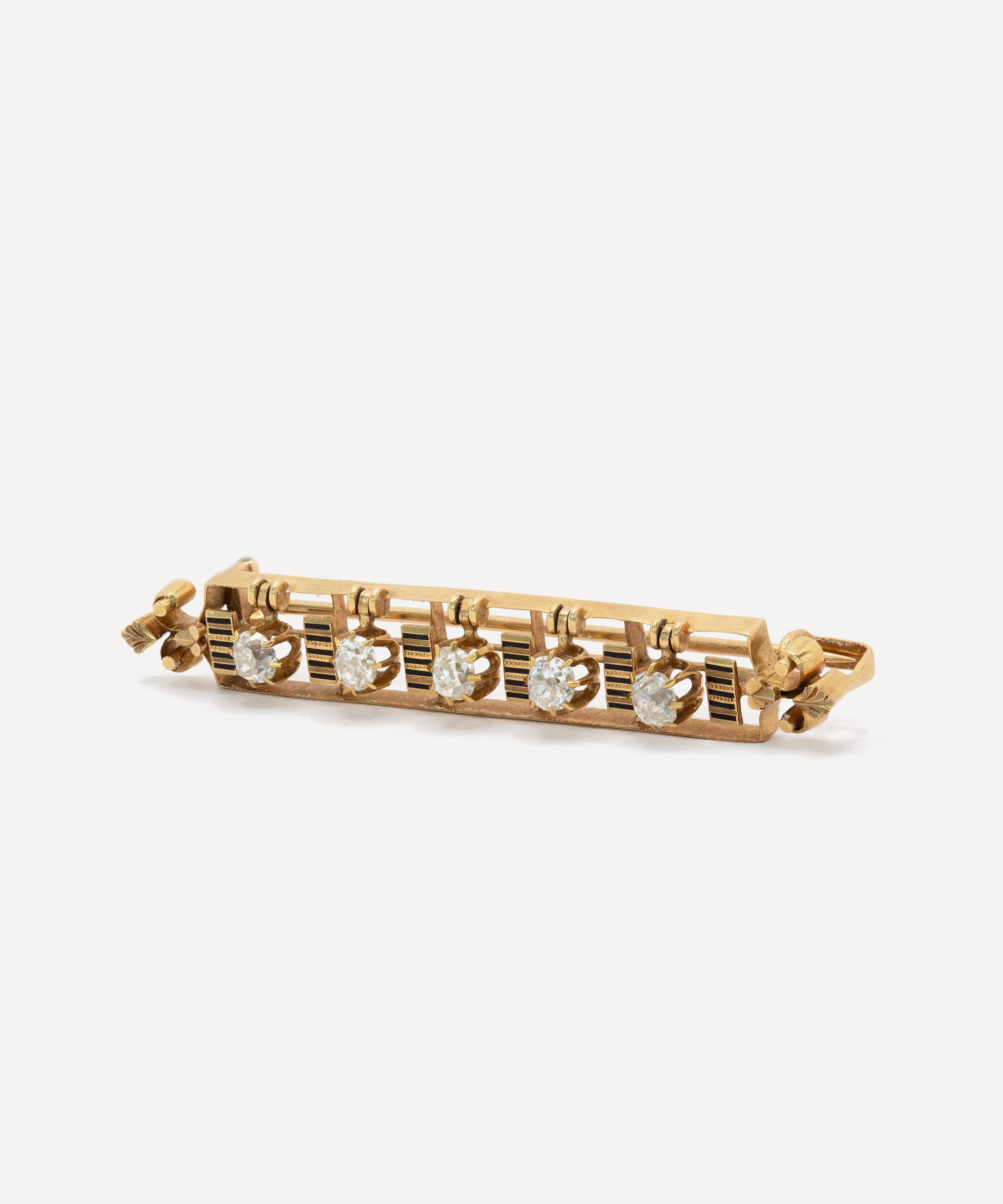 Brimming with character, this Victorian brooch boasts a standout piece from antique purveyor Kojis. Crafted from 14ct gold, it features a bar design with five old European cut diamonds suspended from articulated fittings, allowing them to hang freely and move gently within the frame of the brooch. Between each articulated diamond is a fixed vertical panel, decorated with five fine lines of black enamel, bordered by a square yellow metal outline and enhanced with delicate scrollwork detailing to either side, typical of the period’s decorative aesthetic. Wear it on the lapels of your favourite blazer or blouse - try teaming it with several other artisanal brooches and pins for a maximalist take on traditional formalwear.