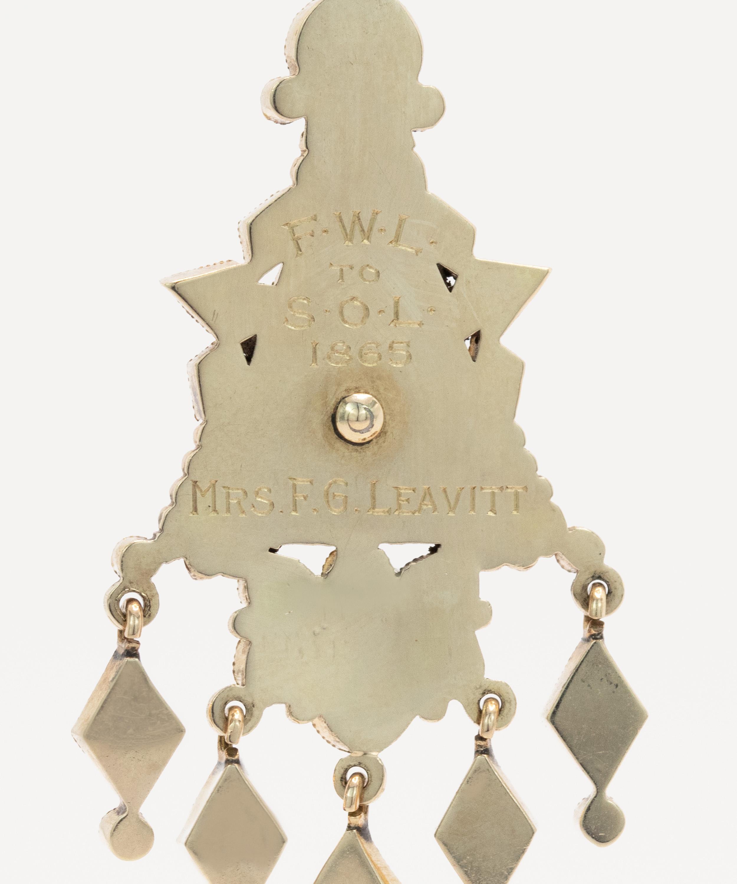 Meticulously crafted from 14ct gold, each earring centres around a large triangular onyx plaque, set with a recessed triangular insert and three seed pearls. Surrounding the central motif is an arrangement of decorative onyx plaques and additional seed pearls, incorporating symbolic forms including triangles, fleur-de-lys, and crescent moon motifs. Five articulated drops hang from the base of each earring: four comprising diamond-shaped onyx plaques with a single seed pearl drop, and a central drop that includes a further curved onyx motif for added movement and detail. The reverse of the earrings bears an engraved inscription reading: ‘F.W.L TO S.O.L 1865 MRS. F. G. LEAVITT’ - a touching personal dedication typical of high Victorian mourning jewellery.