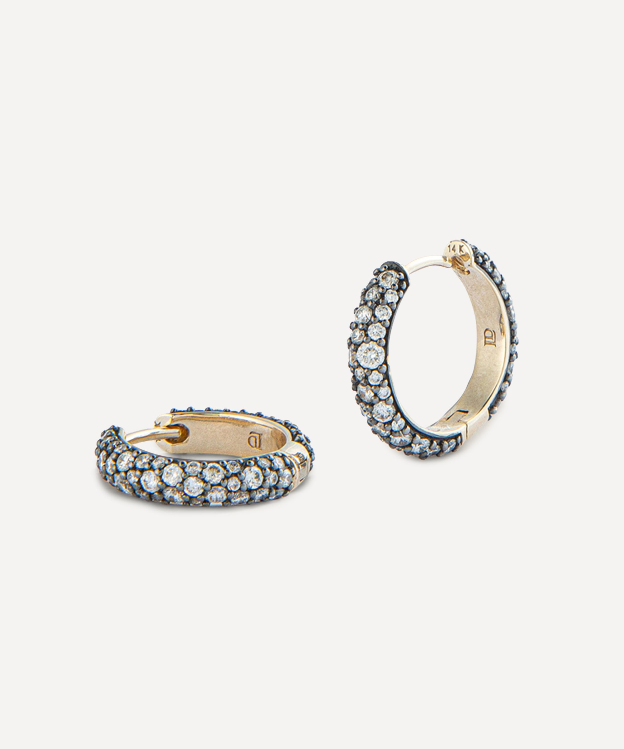 Crafted from 14ct gold, this pair exude a sense of luxury and durability, while maintaining a refined, understated aesthetic. Their classic design, characterised by a Victorian set diamond pavé atop antique finish black rhodium, reference and celebrates a vintage silhouette with a modern sentiment, making them a versatile addition to any jewellery collection. Weather worn alone or layered, they will instantly draw attention to both casual and formal looks with a subtle allure.