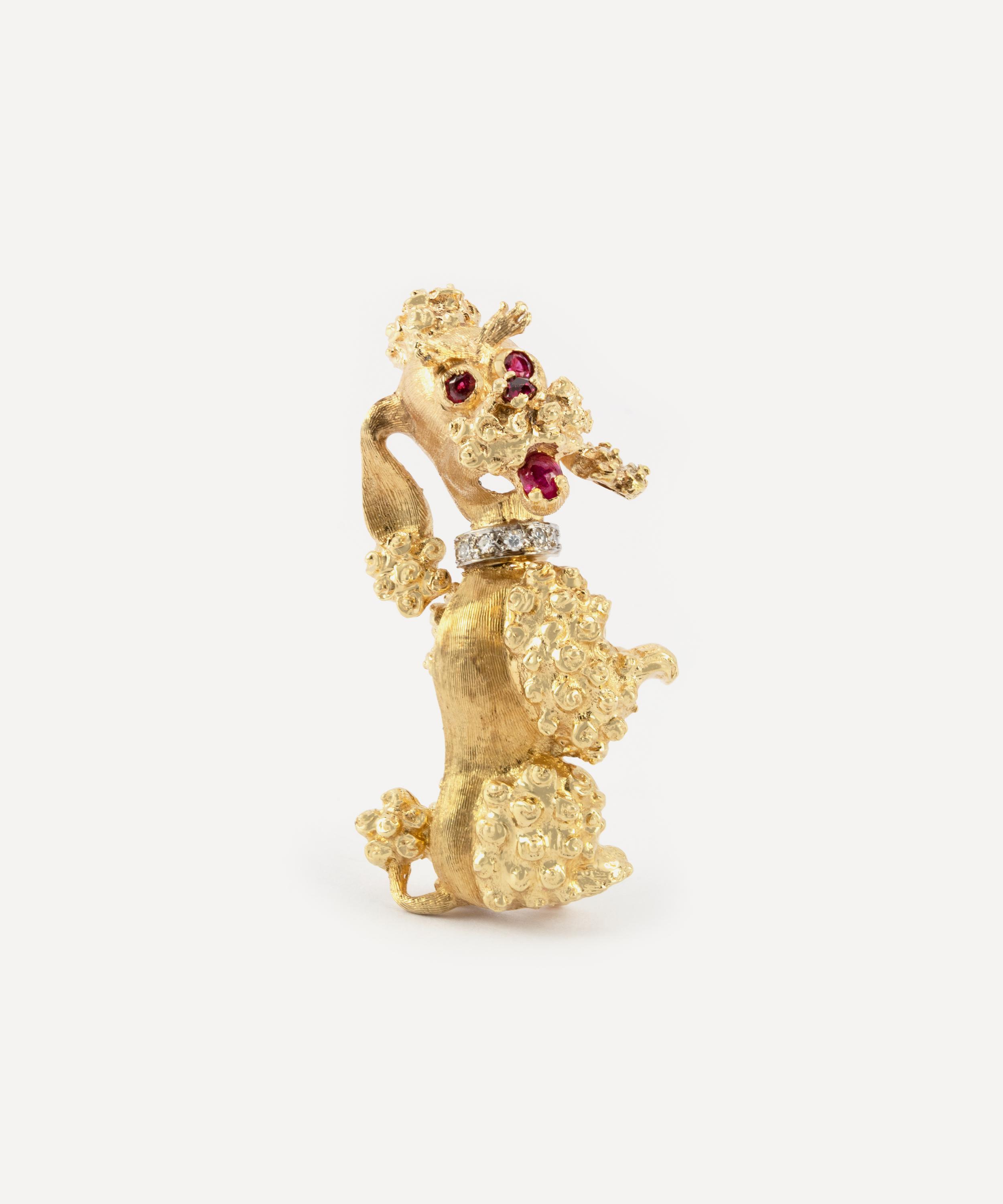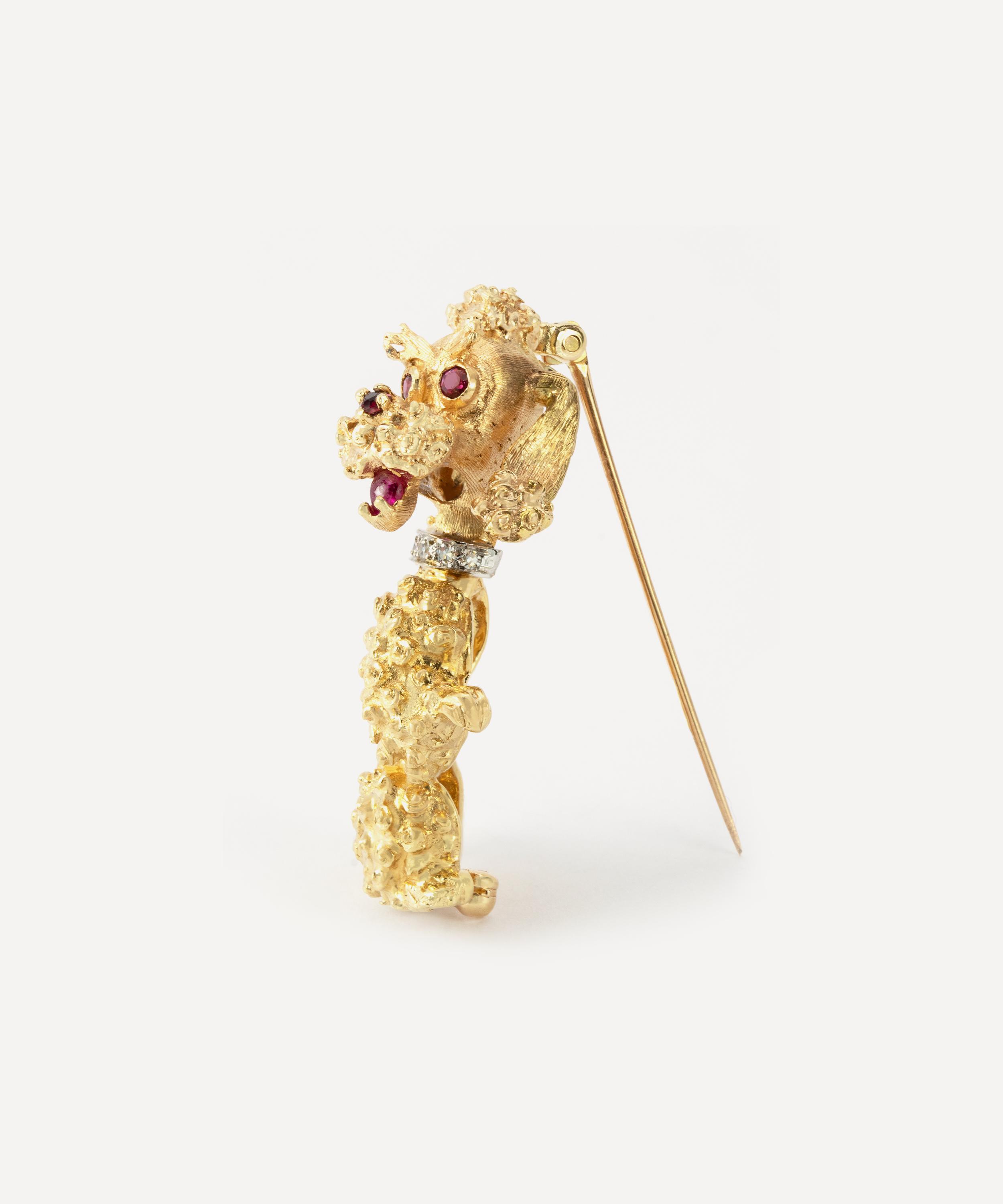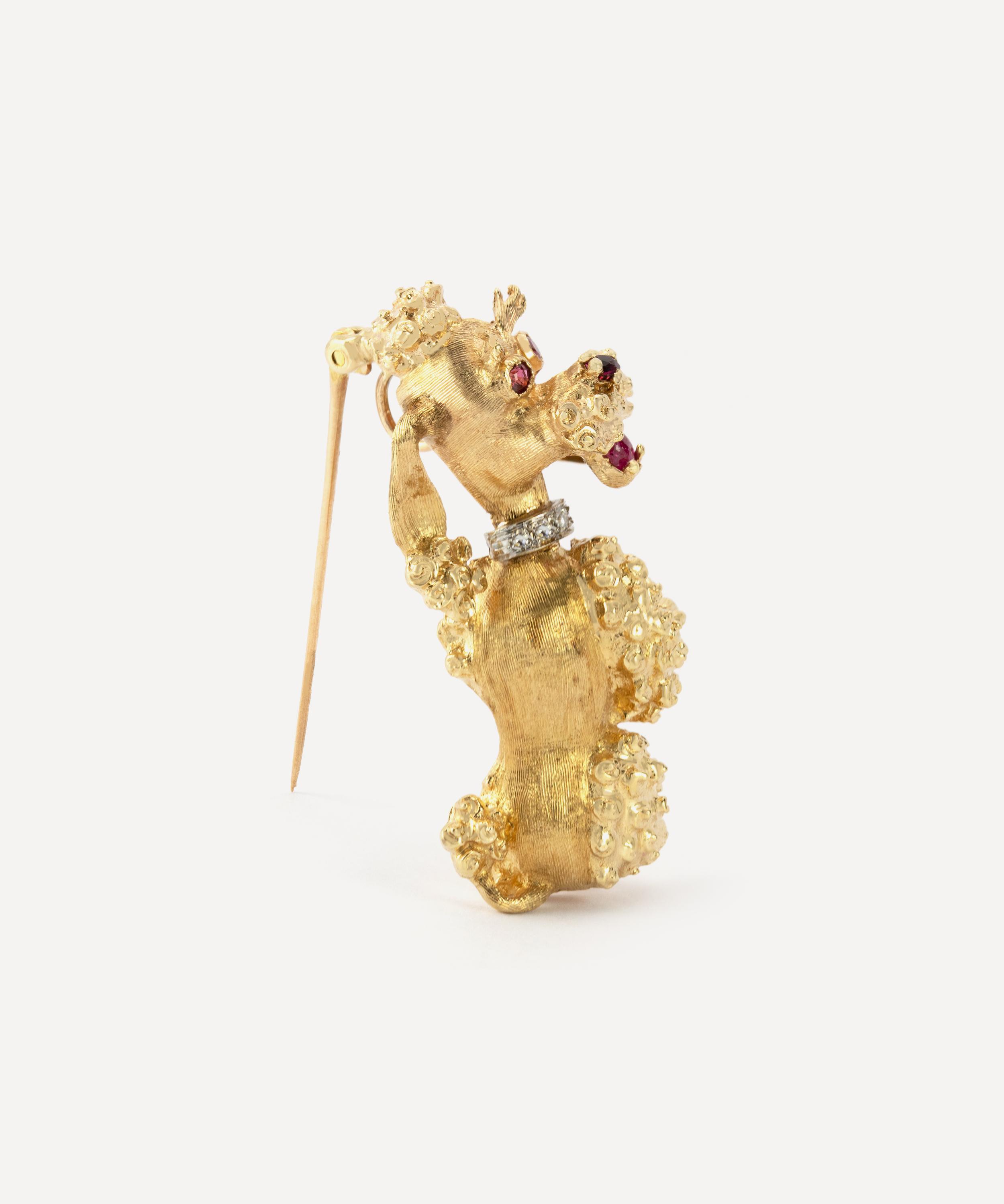 Crafted from solid 14 carat gold, this brooch depicts a French poodle standing on its hind legs. The poodle wears a diamond collar, made of five round, brilliant cut white diamonds and its eyes, nose and mouth are set with vivid red rubies for a striking contrast. An elegant example of timeless vintage jewellery, wear it alone to showcase its delightfully novel appeal, or team it with several other playfully designed brooches and pins for a light-hearted take on traditional formalwear.