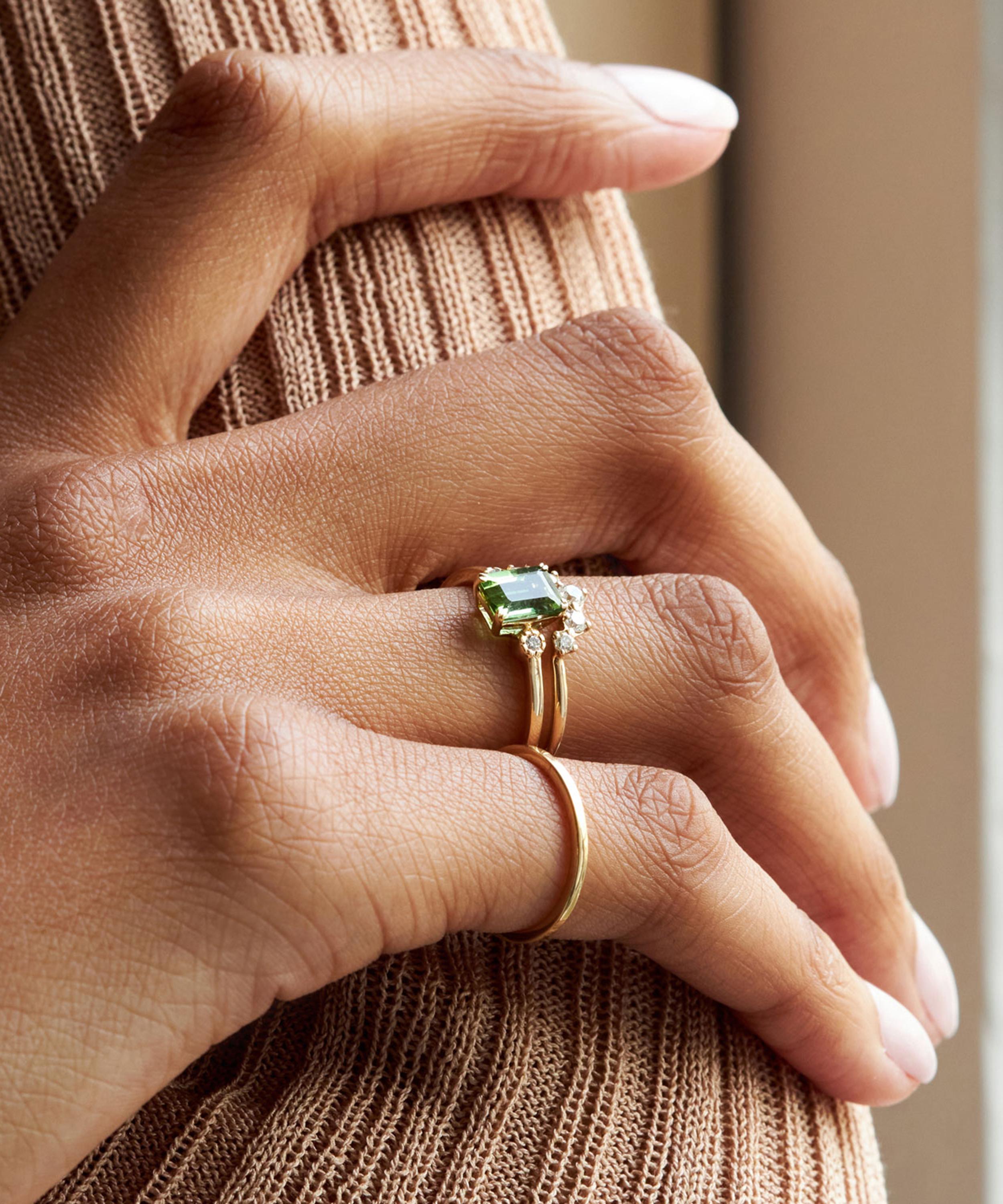 Heighten the impact of your ring curation with Dinny Hall’s unique Violet ring – inspired by the British flower meadow. Crafted from 14ct gold, its beautiful design emanates Spring all year round, composed of a mesmerising, emerald-cut green tourmaline, flanked by a brilliant-cut diamond on each shoulder.