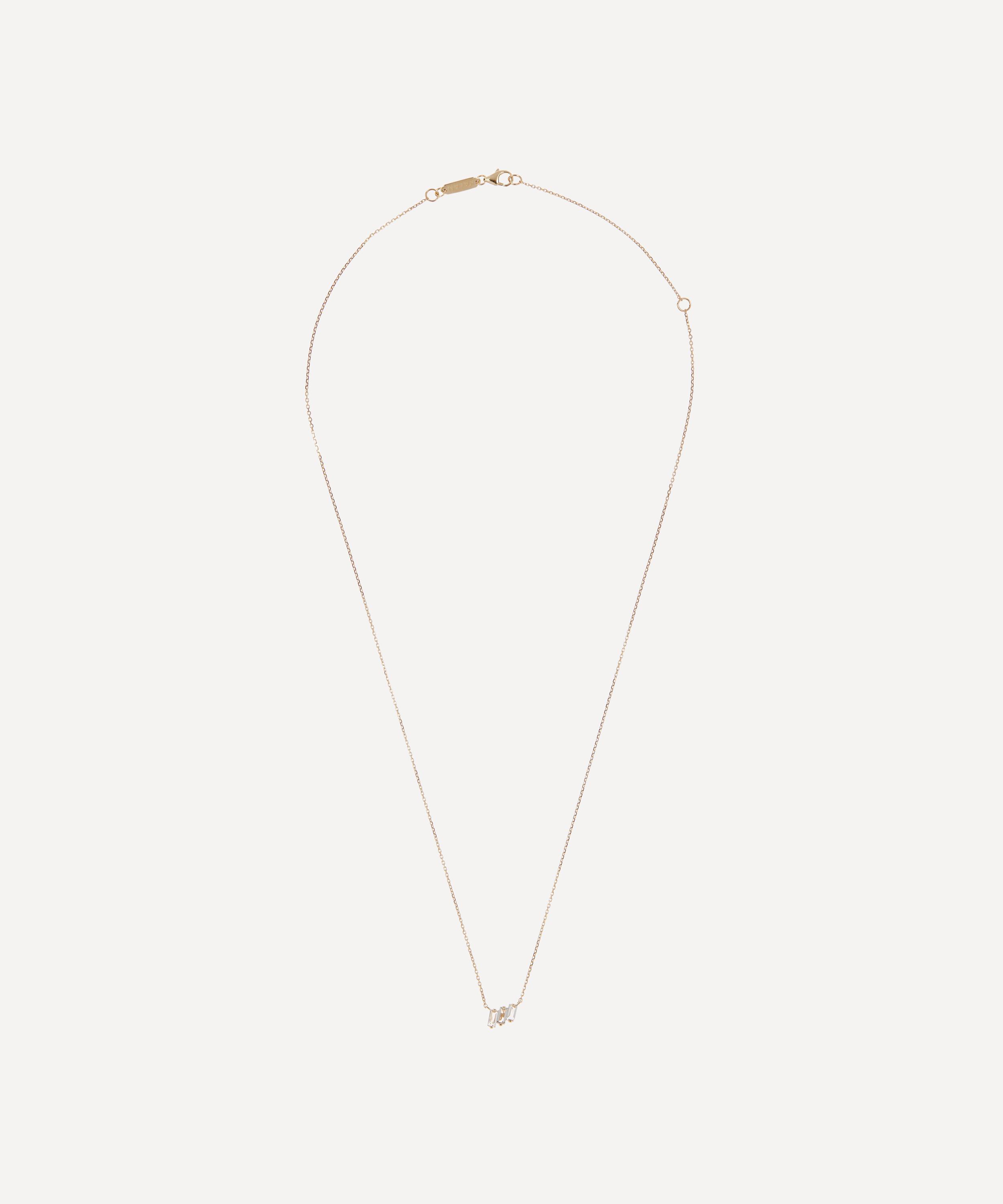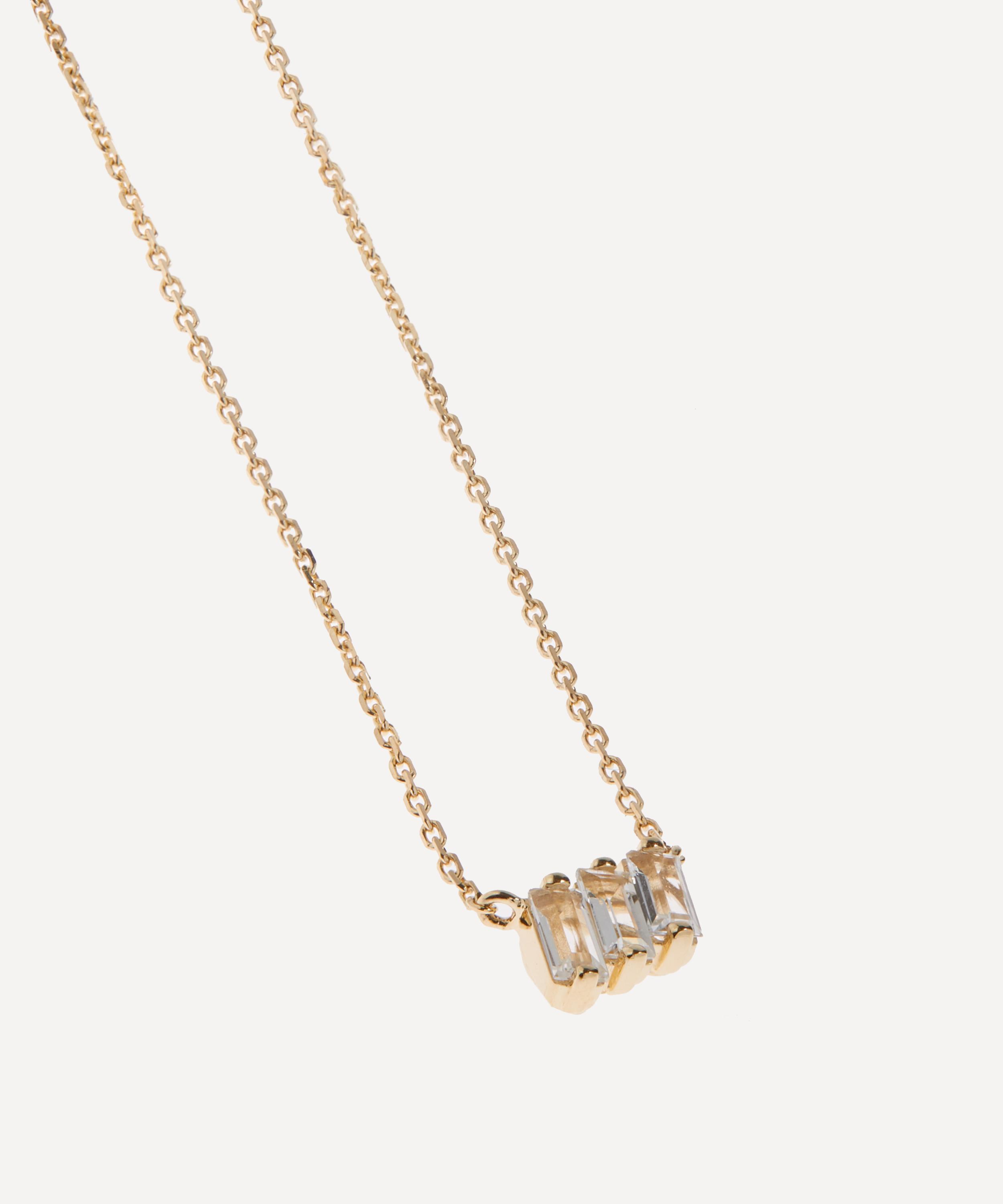 Exemplifying the designer's contemporary approach to traditional fine jewellery design, Suzanne Kalan presents this pendant necklace. Crafted from 14ct gold, it’s characterised by a delicate chain and a small irregular bar pendant composed of a trio of baguette-cut white topaz stones. Style it solo against bare décolletage for a minimal everyday look, or add it to your go-to chain stack.