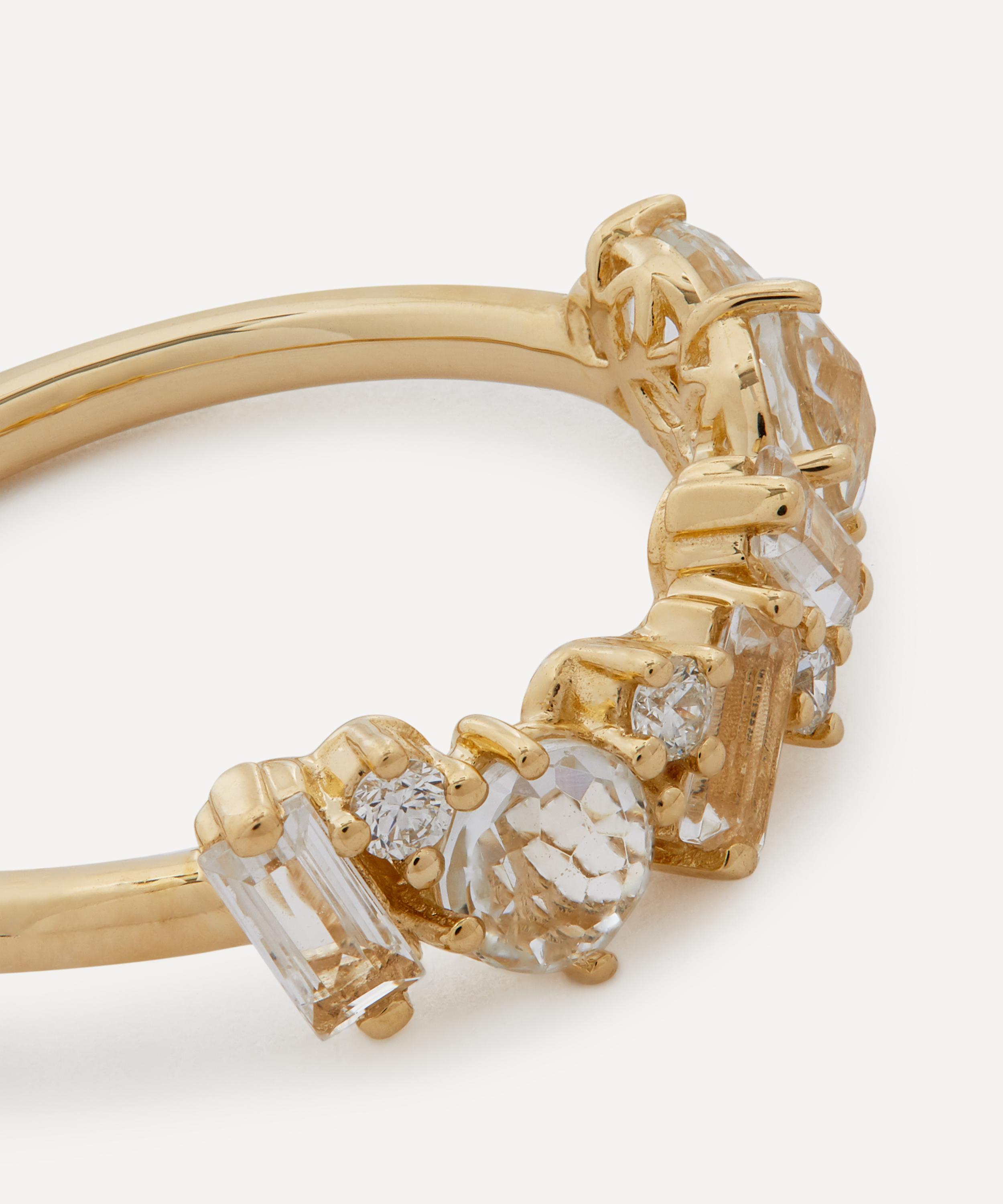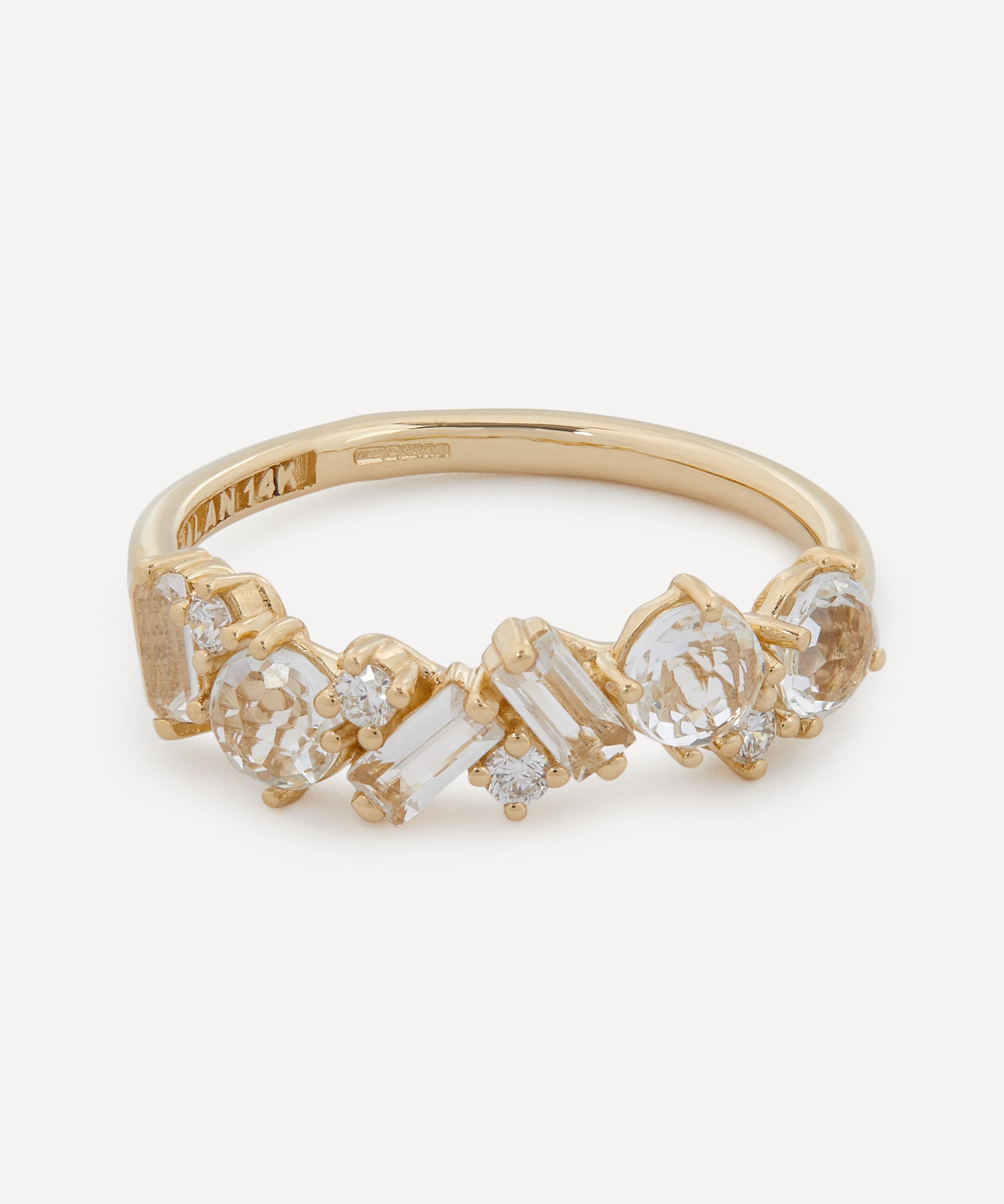 Exemplifying the designer’s contemporary approach to traditional jewellery designs, Suzanne Kalan presents this White Mix Diamond band ring. Crafted from solid 14ct gold, it features a slim, polished band, embellished with an assortment of mix-cut white topaz stones interspersed with sparkling diamond accents. Style this piece solo for a burst of colour day-to-day or stack it with several of the designer's other glittering gemstone rings for an unforgettable cocktail hour curation.