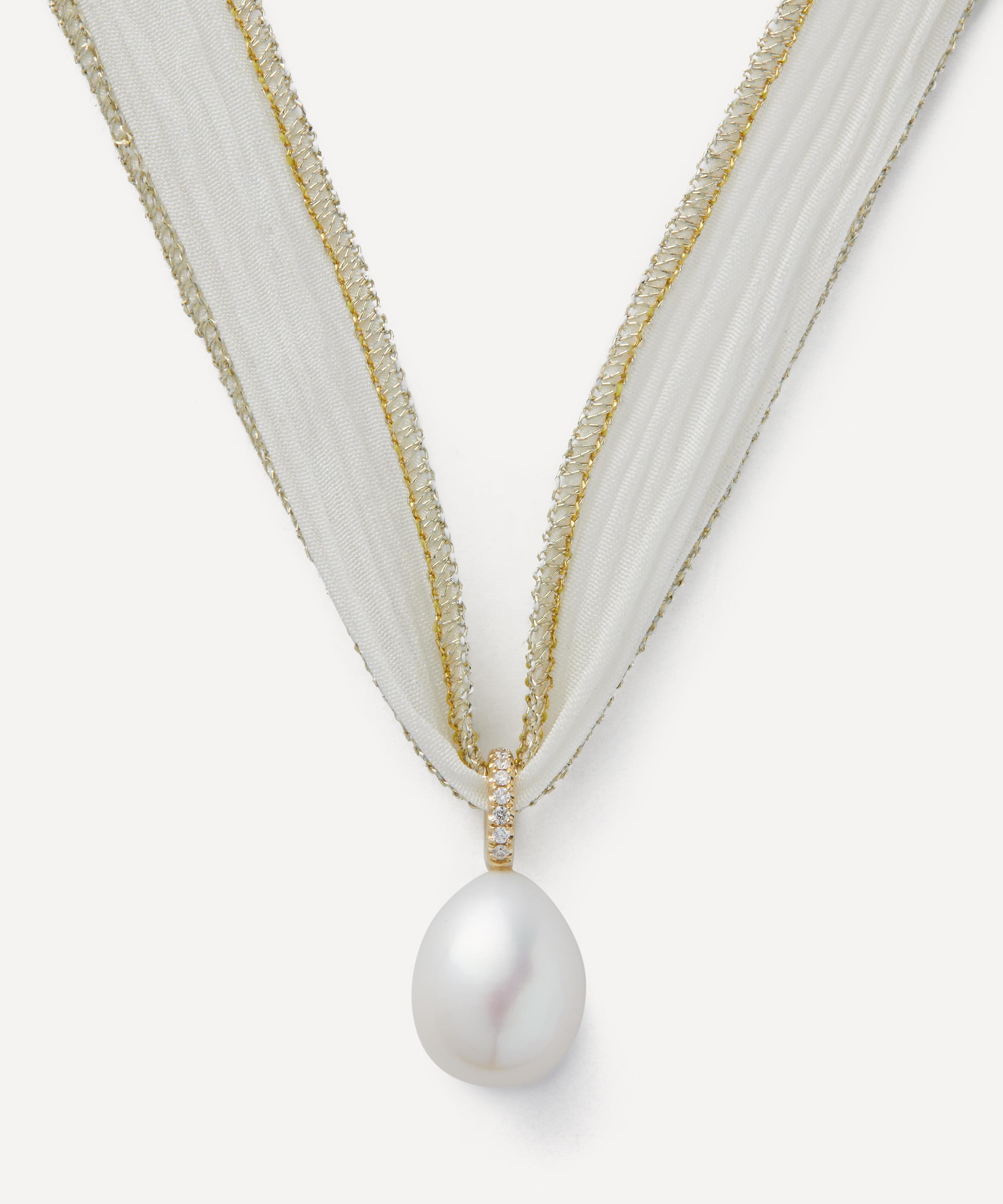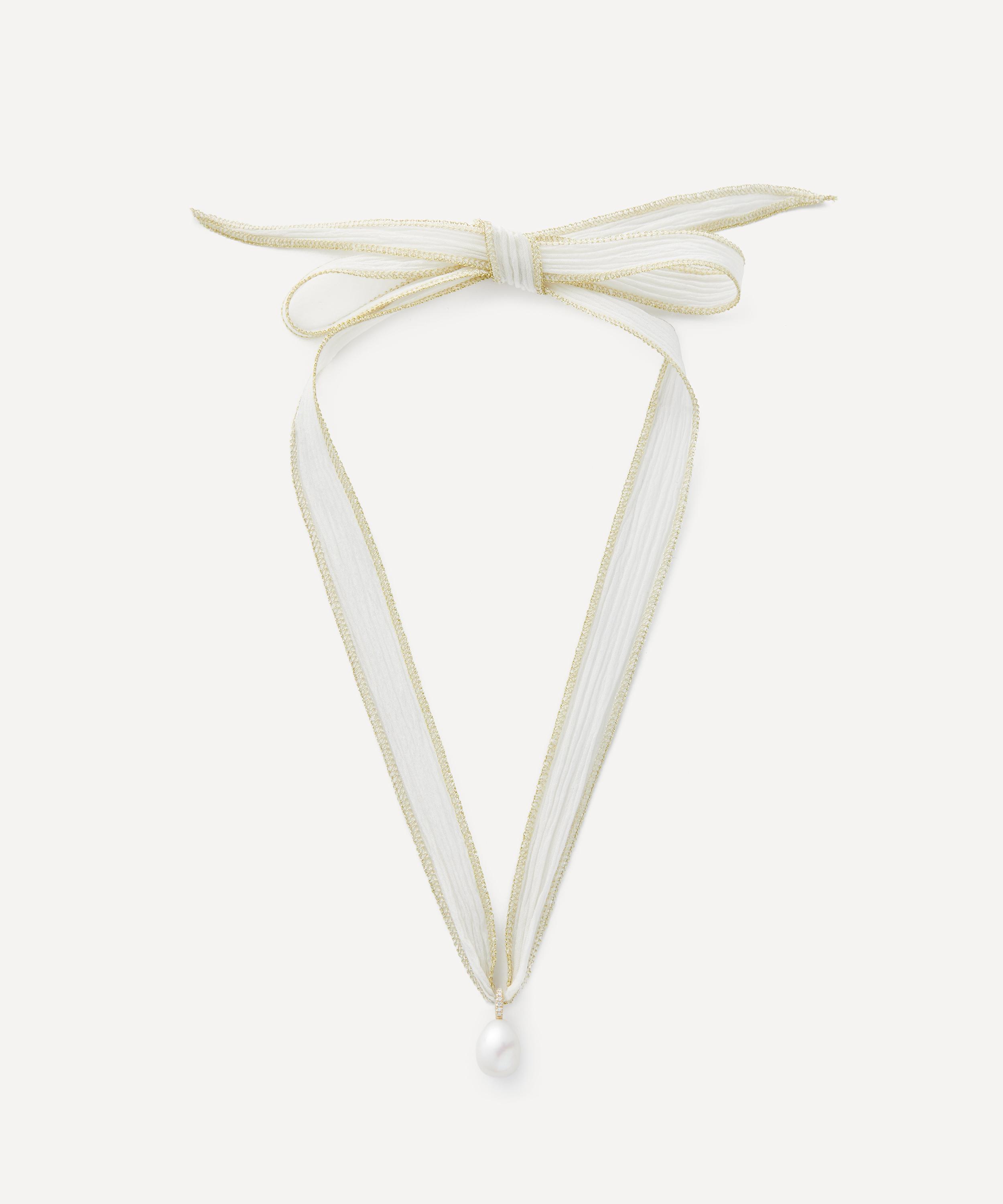 Everyday elegance encapsulated, this necklace by Mizuki is the minimal statement piece you will reach for again and again. Fashioned from white silk with a gold trim, it’s finished with a freshwater pearl pendant, suspended from a 14ct gold, diamond set bail clasp – style as a necklace for bracelet.