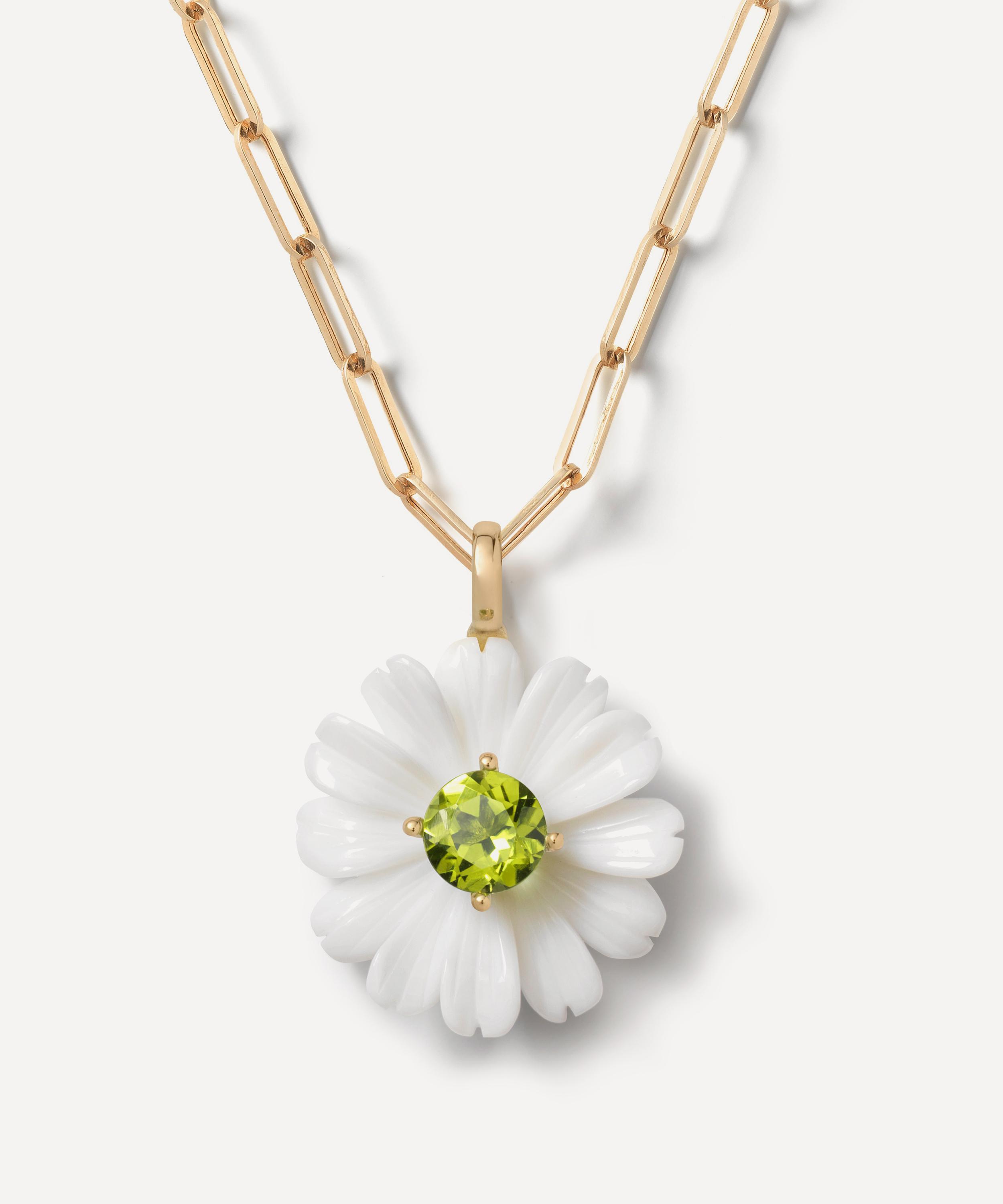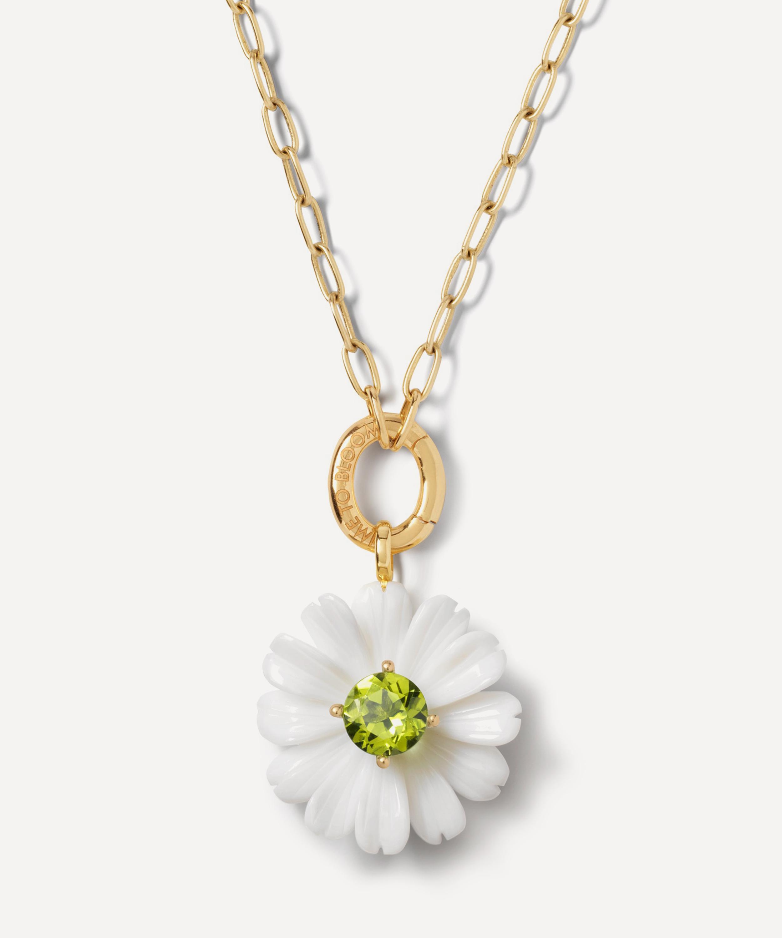 Drawing inspiration from various contemporary artists, it features a blossoming floral design composed of hand-carved white opal petals and a brilliant cut peridot at the centre – a representation of positive energy, joy, and happiness. Suspended from a 14ct gold clasp, the pendant shimmers in a delectable colourway, perfect for pairing with Sophie Joanne’s Time To Bloom Necklace – try teaming it with matching pieces from the brand for a truly efflorescent curation.