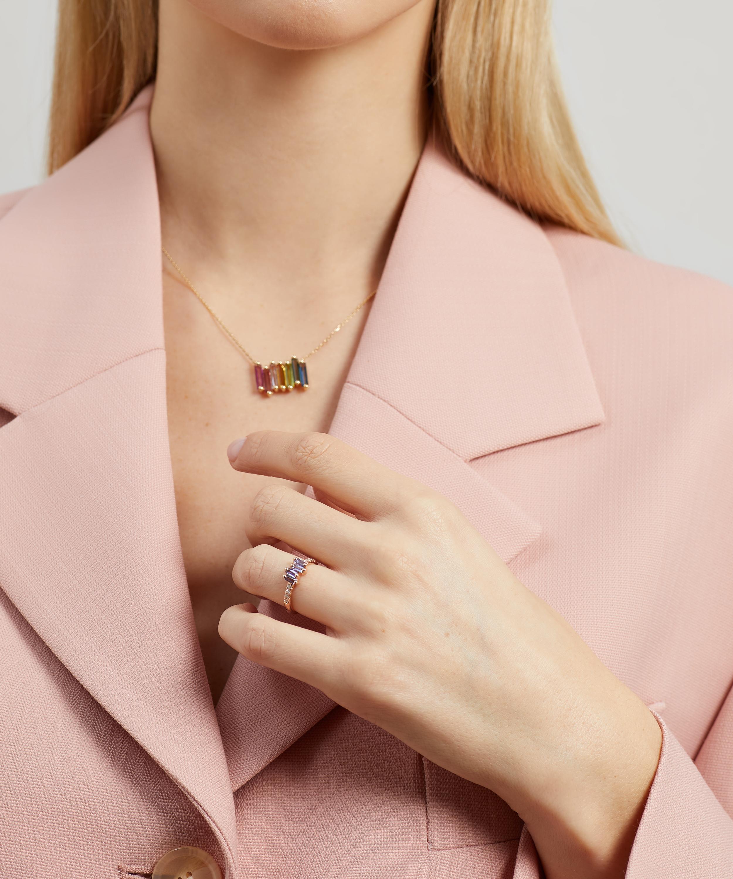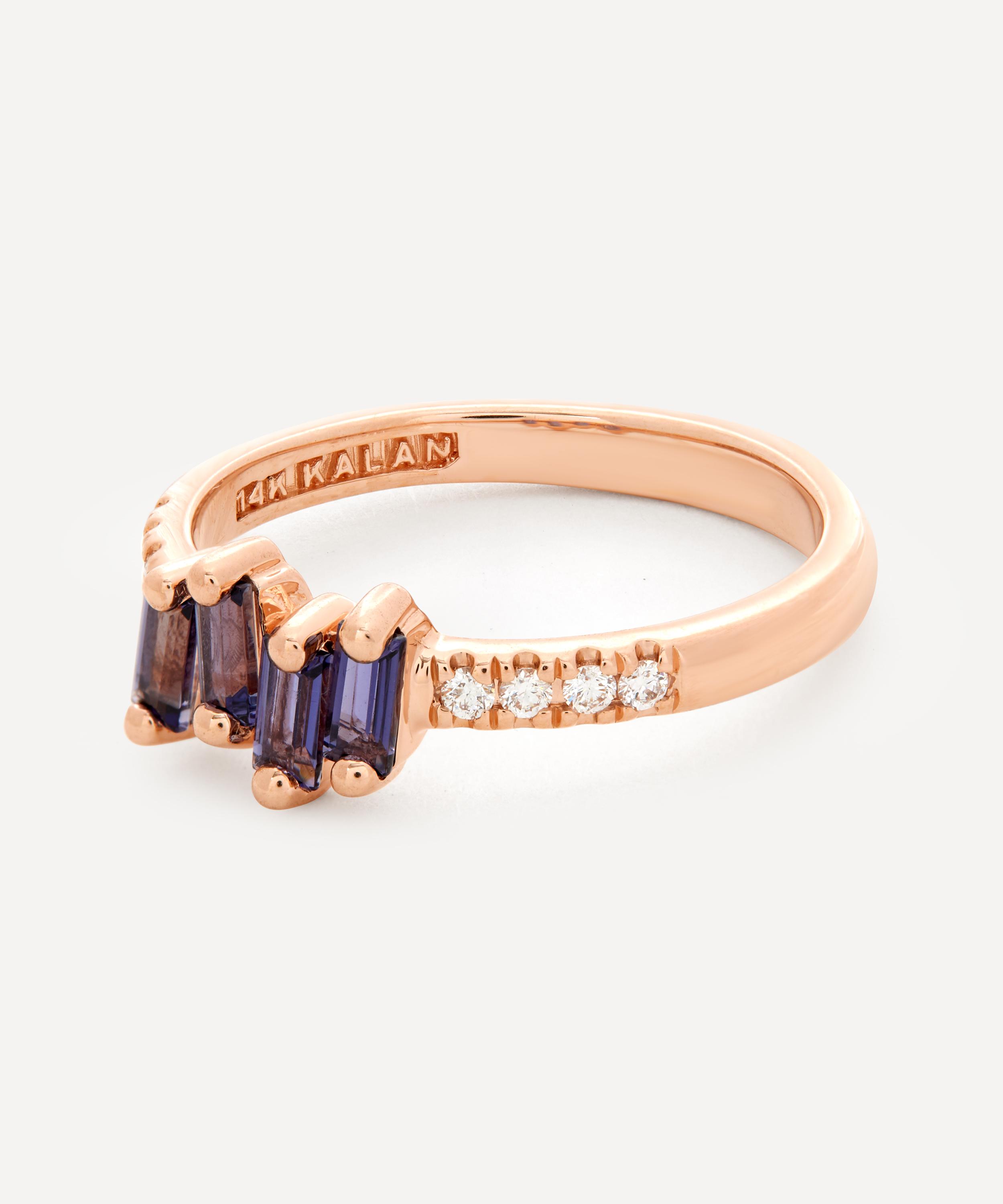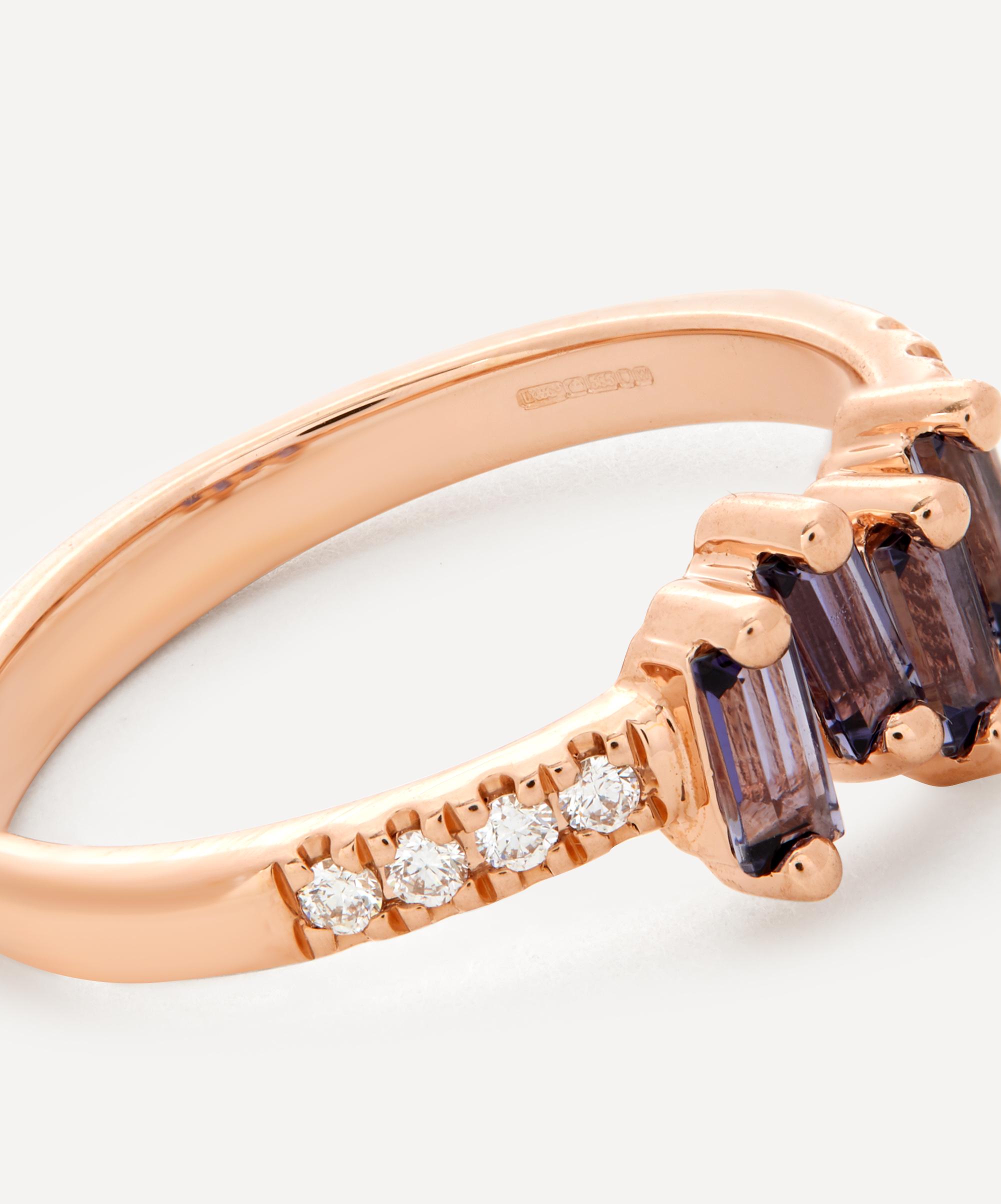 Crafted from solid 14 carat rose gold, this ring features a subtly irregular row of four baguette cut iolite stones, presented on a slim, polished band with glittering pavé diamond shoulders. Style it solo for a pop of colour day-to-day, or stack it with several of the designer's other glittering gemstone rings for a dazzling, evening-ready approach.