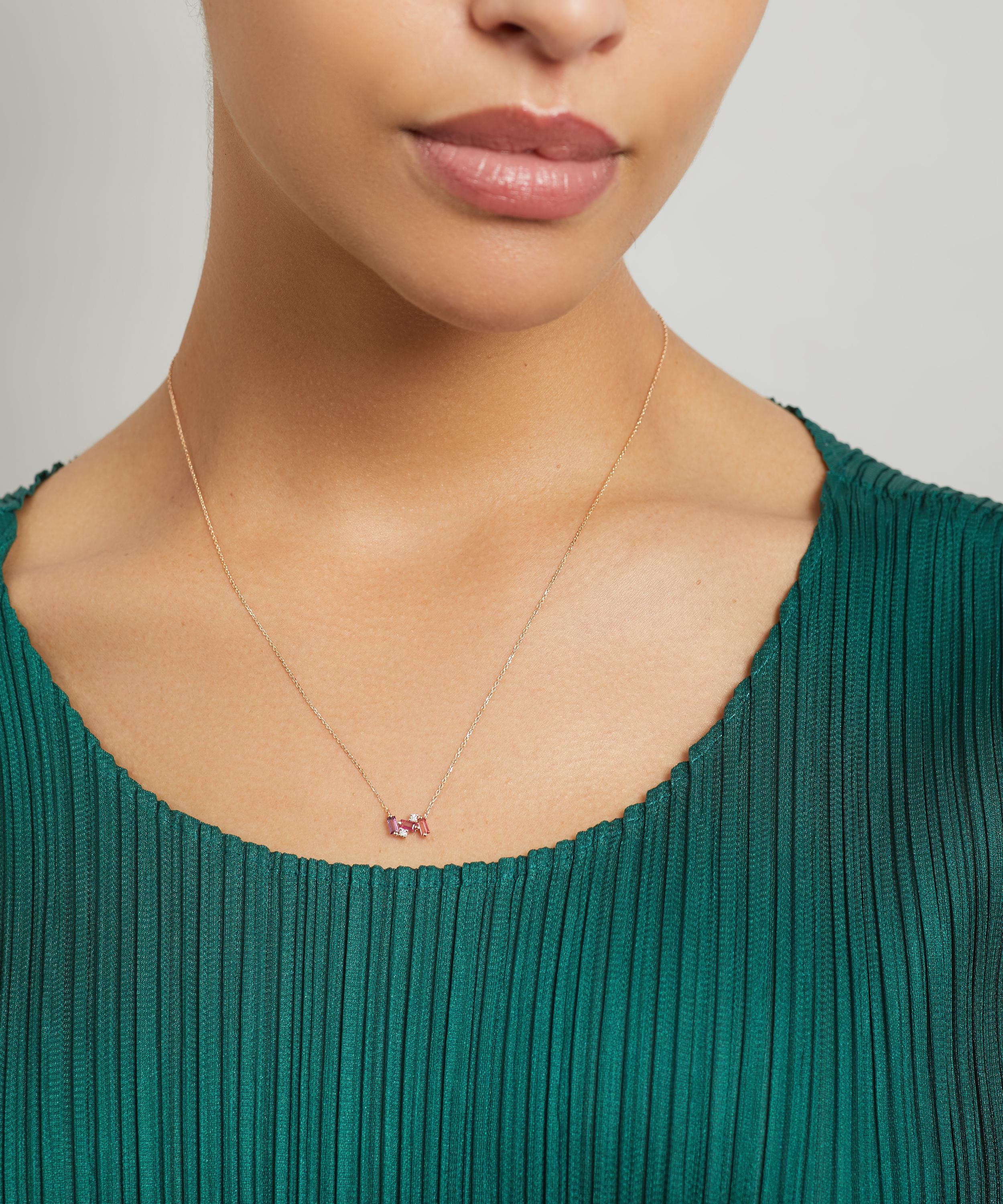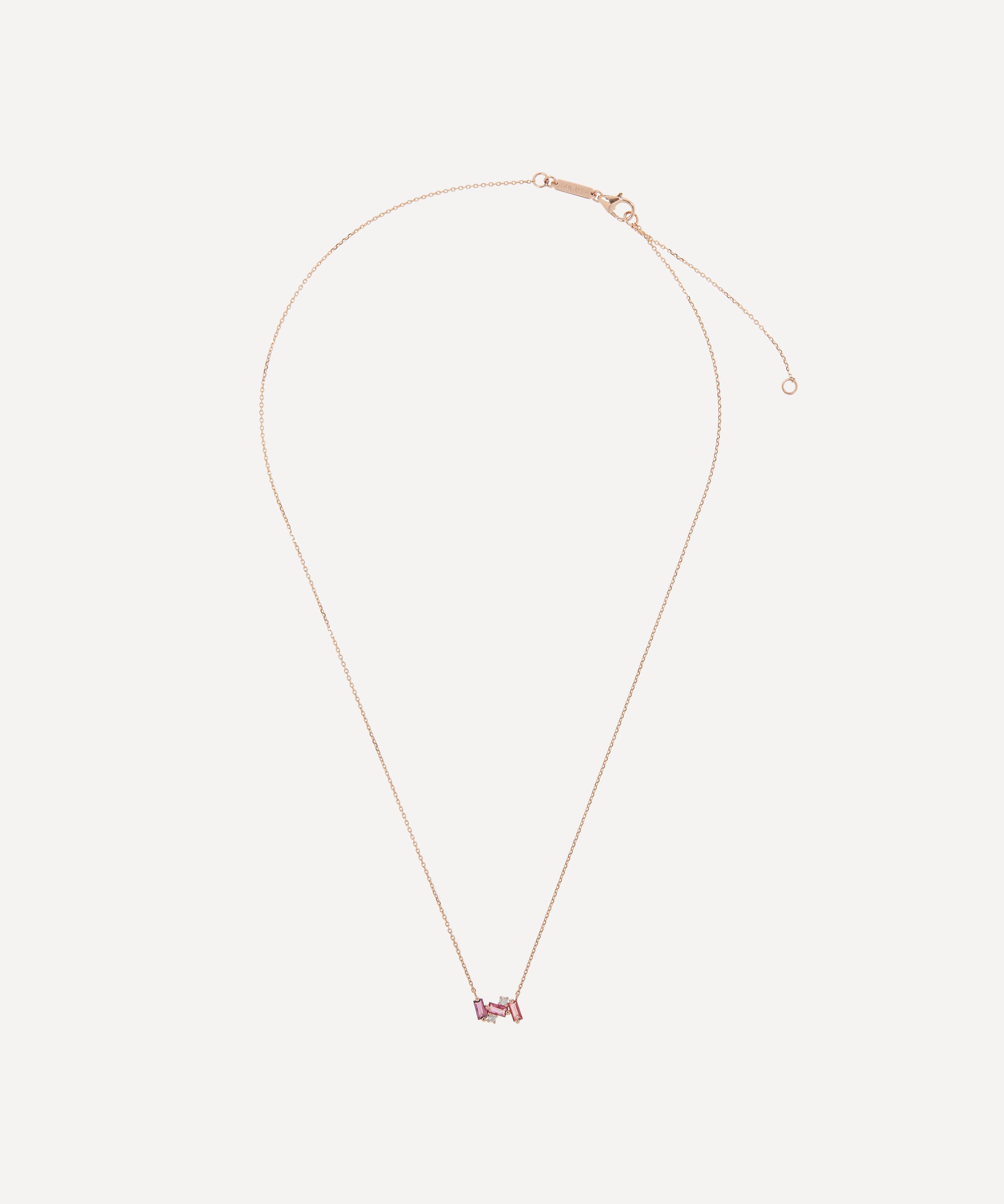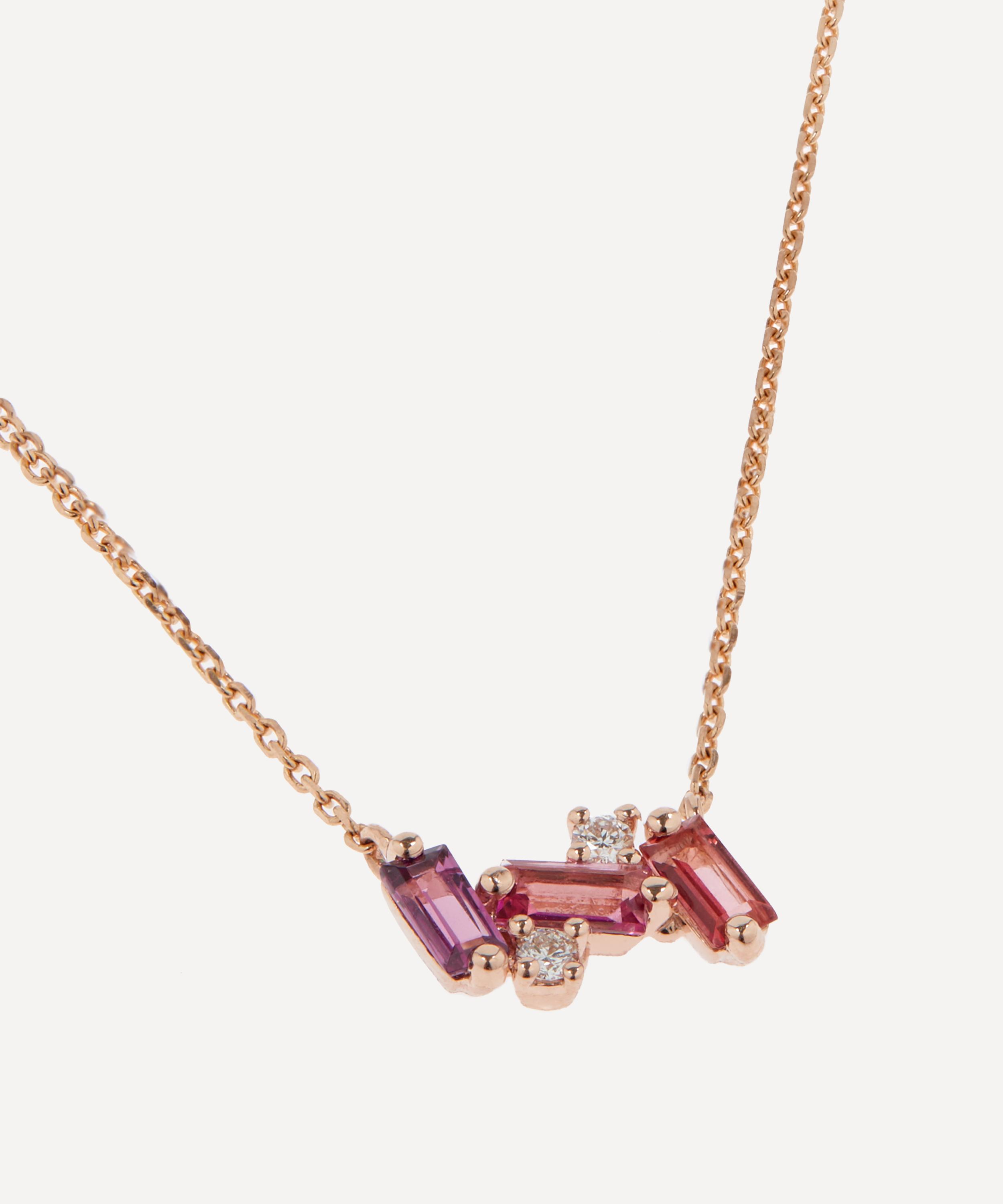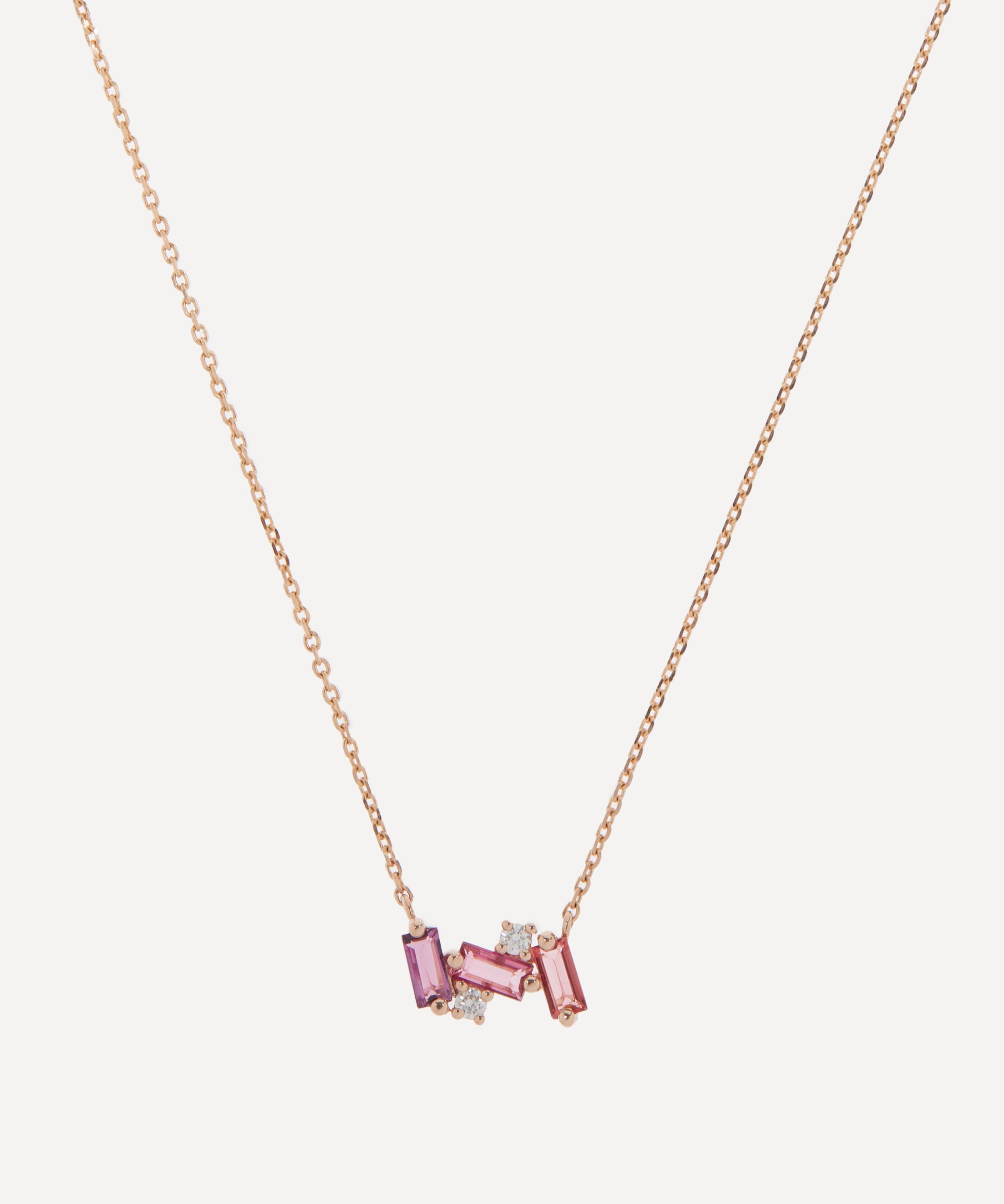 Crafted from solid 14ct rose gold, this necklace features a subtly irregular stack of three baguette cut rhodolite, pink topaz and salmon topaz, interspersed with two round cut sparkling diamonds. Style it solo against a bare decolletage for a minimal everyday look, or team it with pulled-back hair and a pair of the designer’s glittering gemstone drop earrings for a glamourous cocktail hour curation.