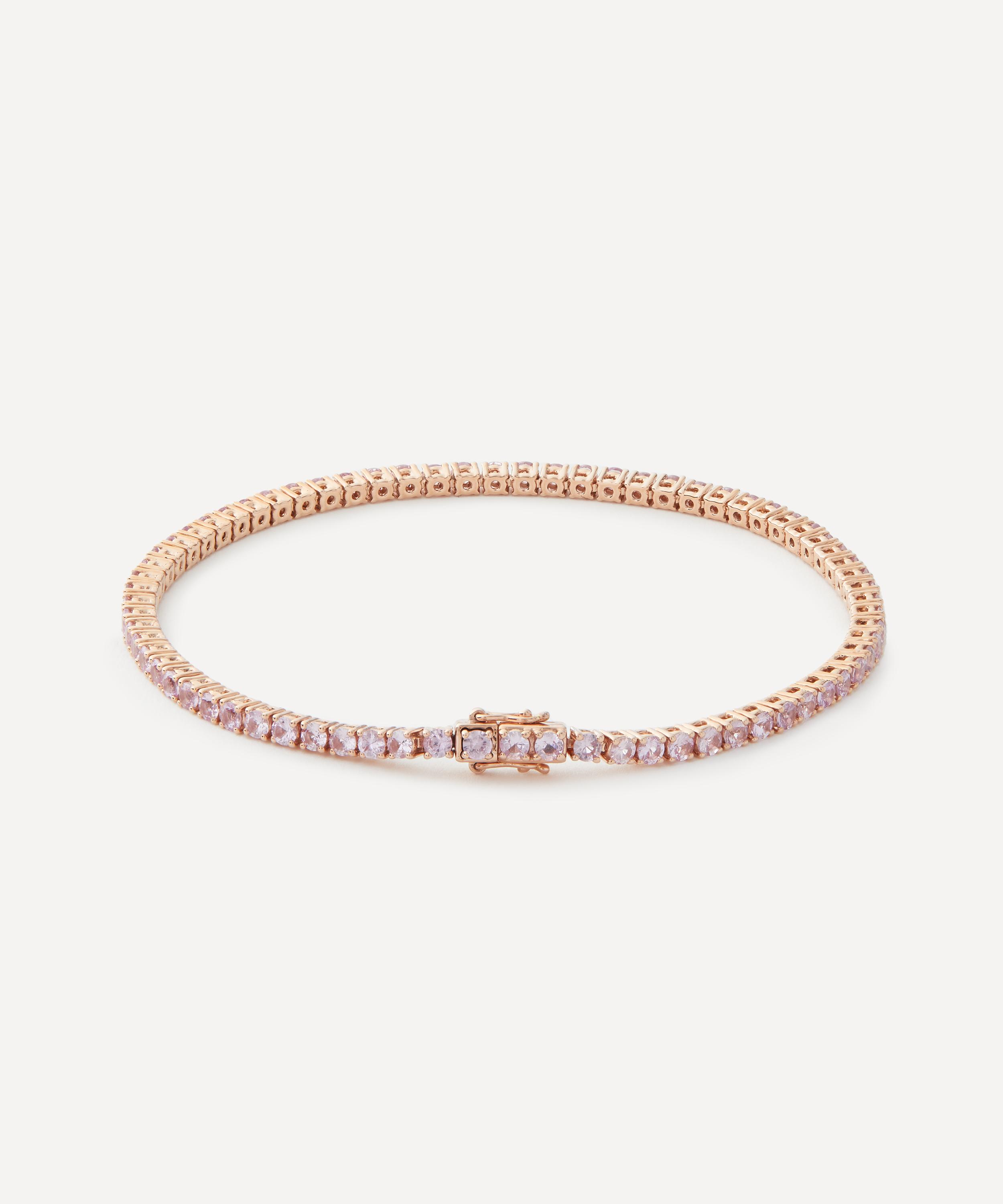 This brightly coloured tennis bracelet from Roxanne First takes a playful approach to a classic style. Designed for endless mixing and matching, it’s crafted from 14ct rose gold adorned with pink sapphires and an elegant tongue clasp.