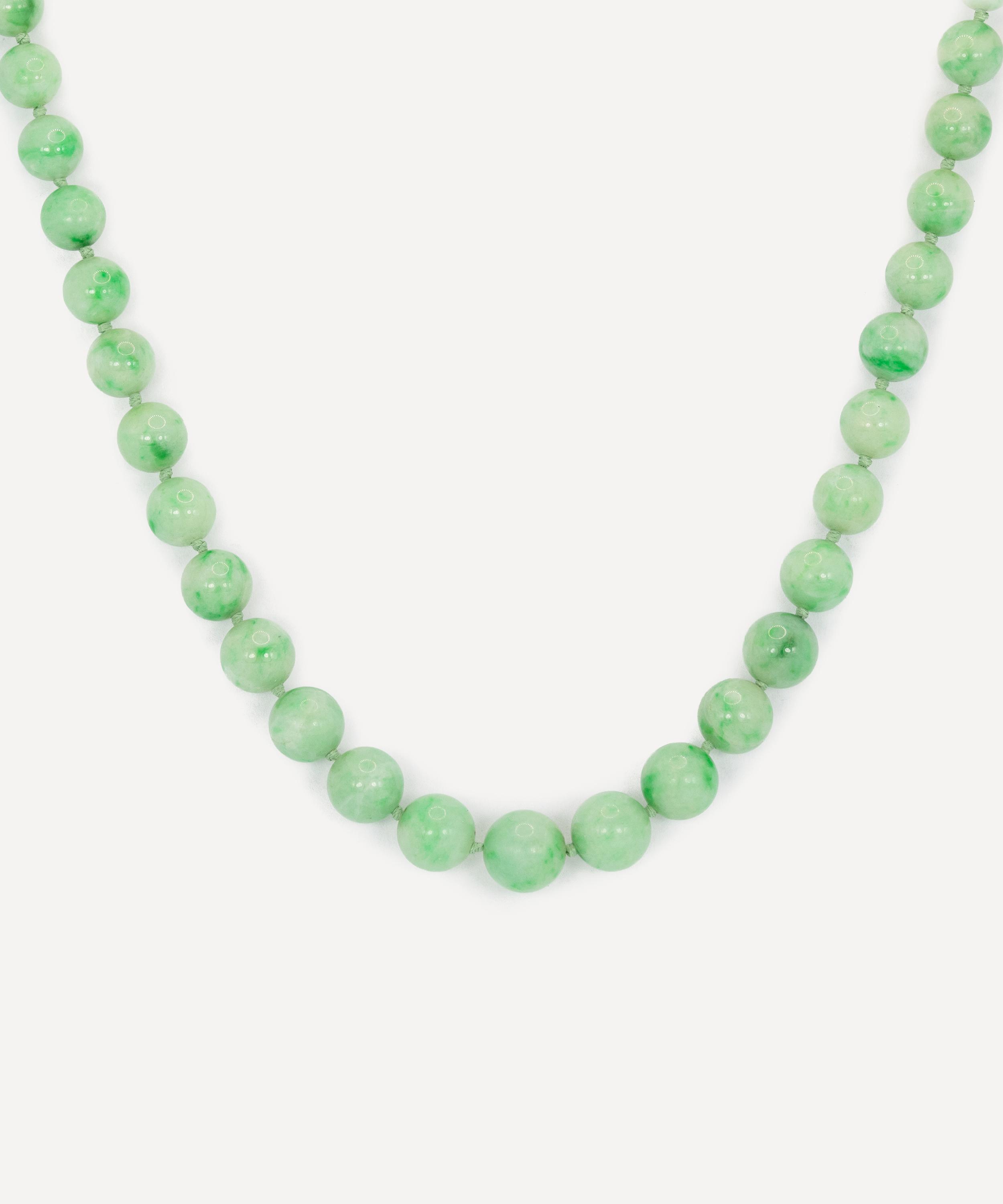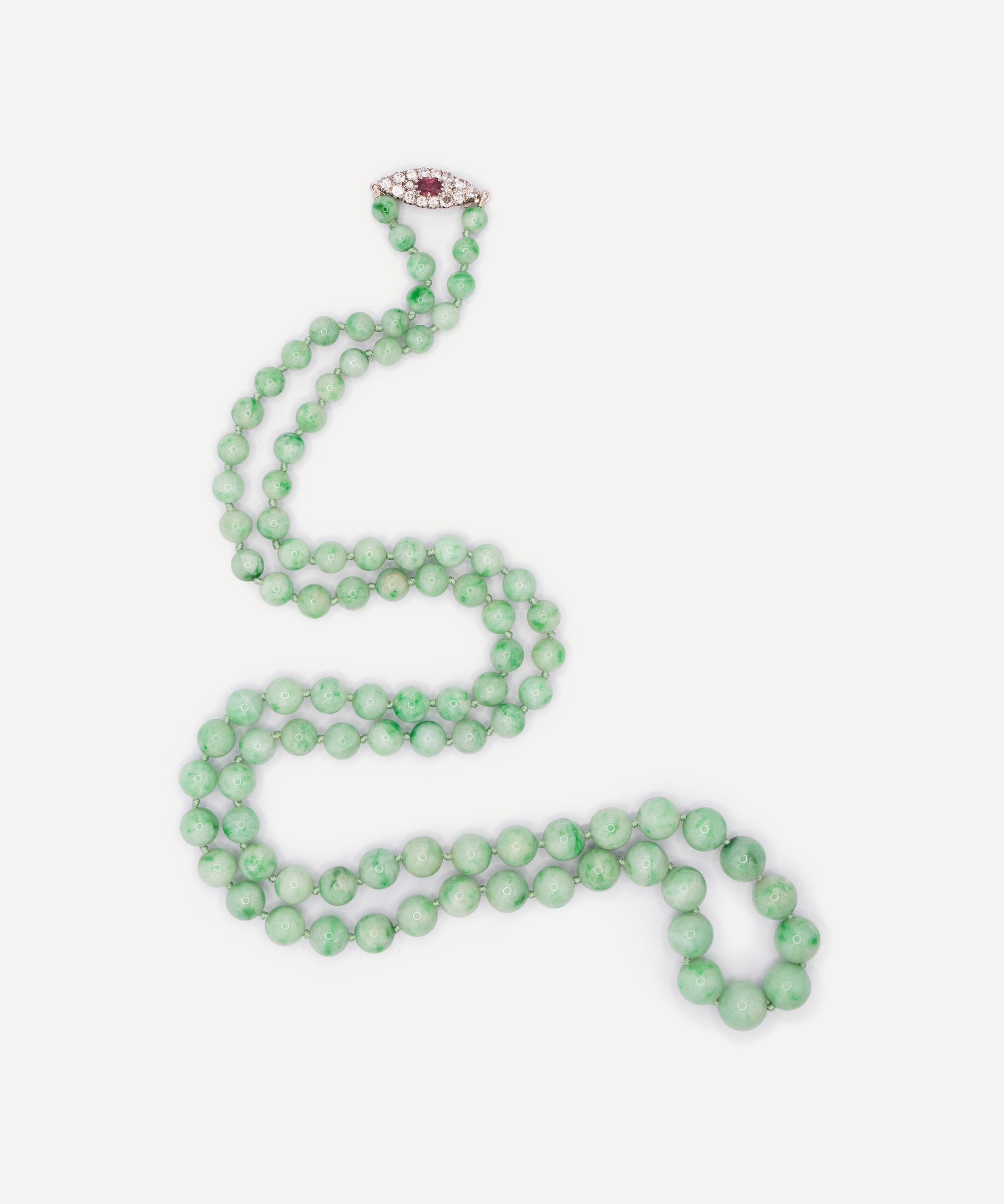 Bound to infuse your look with elegance, this necklace is a one-of-a-kind piece from antique purveyor Kojis. Featuring a strand of graduated, round jade beads, each individually knotted on green silk thread, it’s complete with a marquise-shaped clasp in silver-topped 14ct white gold, set with old cut diamonds and an oval cut centre ruby.