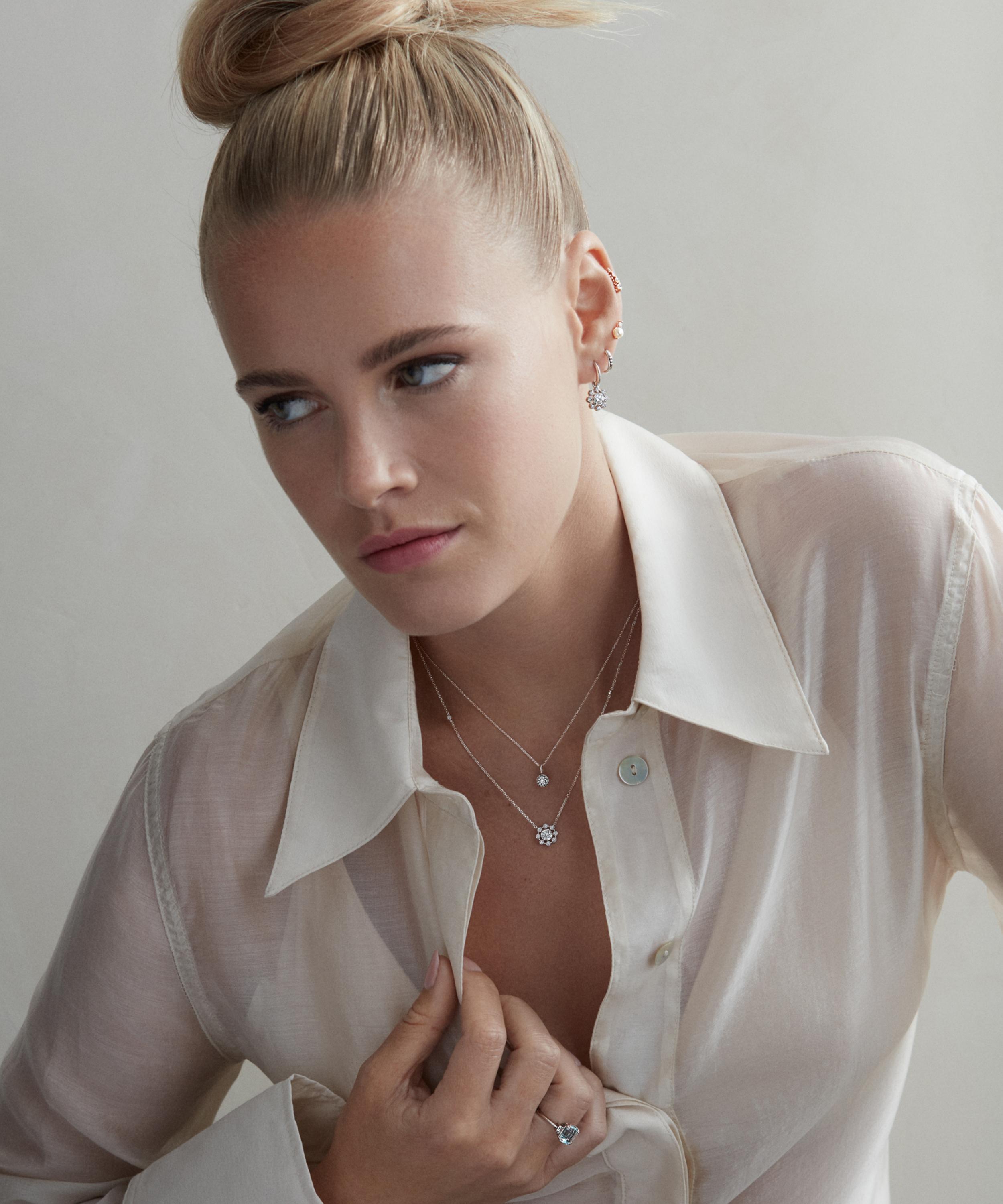 Heighten the impact of your jewellery line-up with Dinny Hall’s unique Celandine pendant necklace – inspired by the British flower meadow. Crafted from 14ct white gold, it features a fine cable chain adorned with brilliant cut diamonds arranged in a beautiful flower design. Style it as a statement piece, team with additional necklaces, or wear it with the matching earrings from the Wildflower collection.