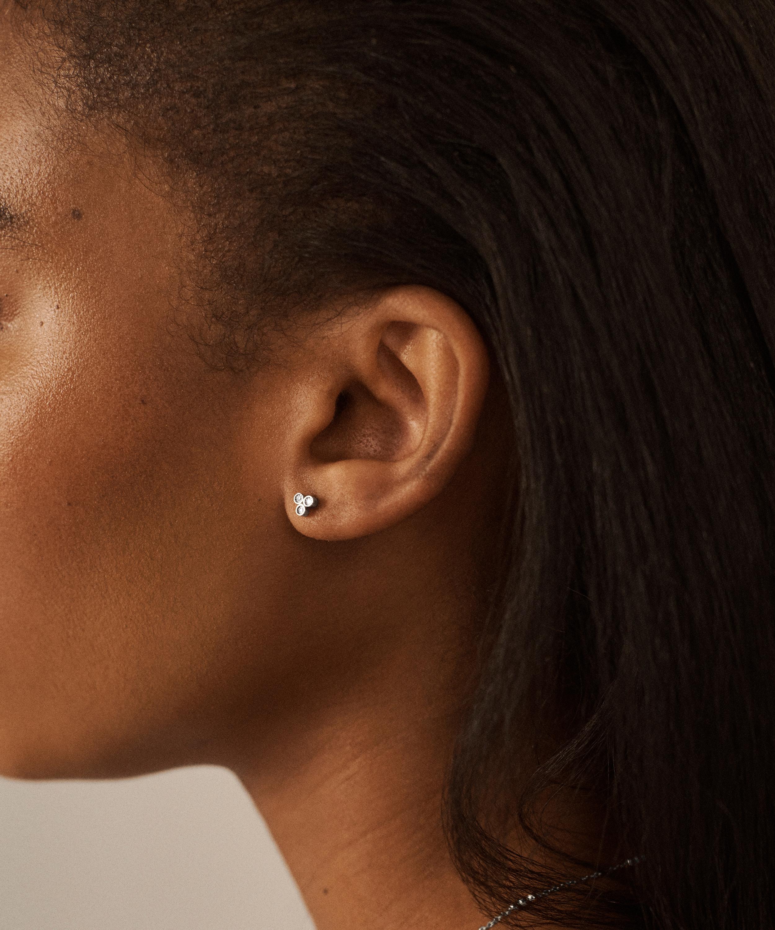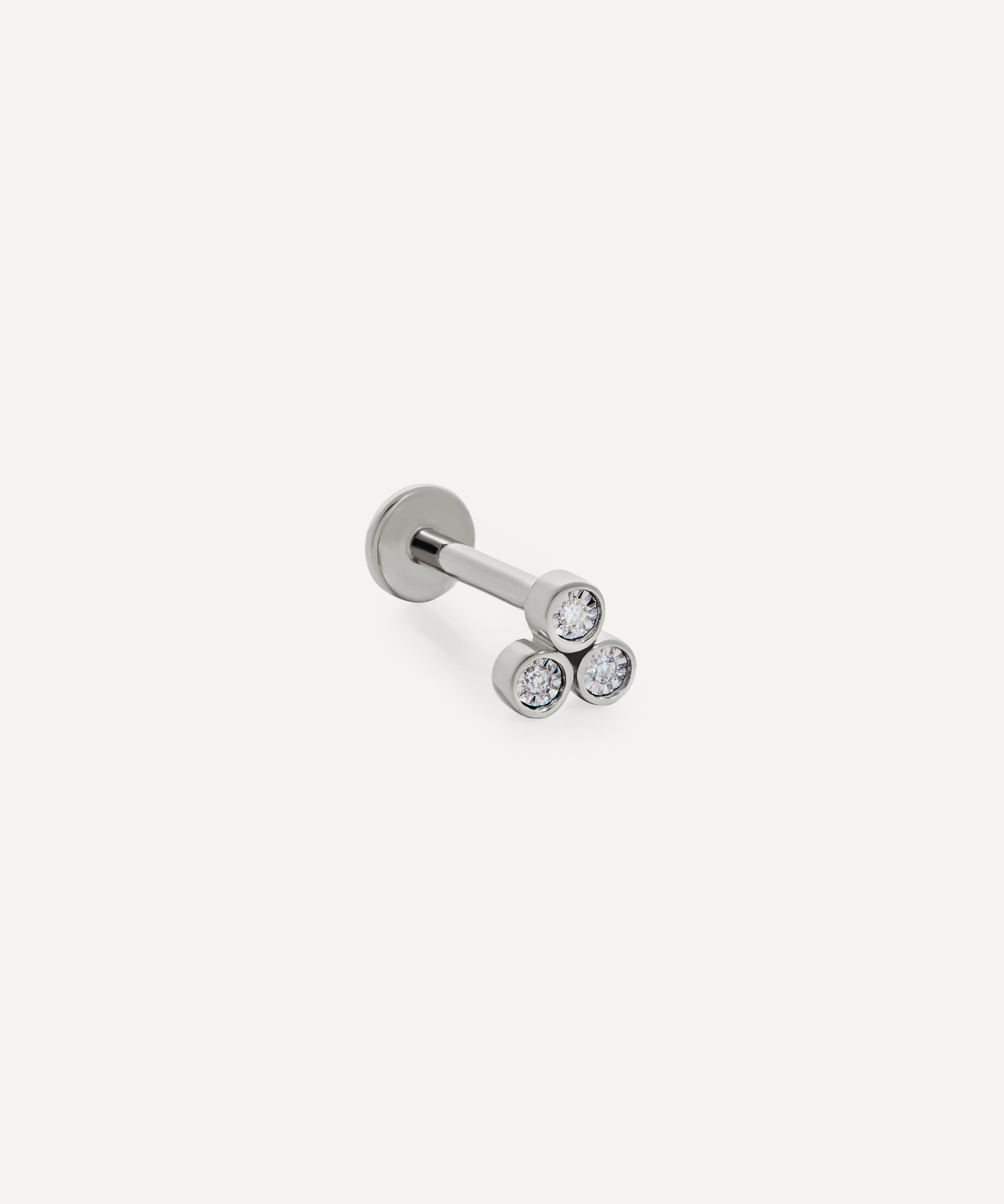 Crafted from 14 carat solid white gold, this timeless stud earring features a cluster design, with a trio of diamonds to add a touch of sparkle to any ensemble, and is complete with a flat back for ultimate comfort – mix and match with an array of other studs and hoops for your own unique curation.