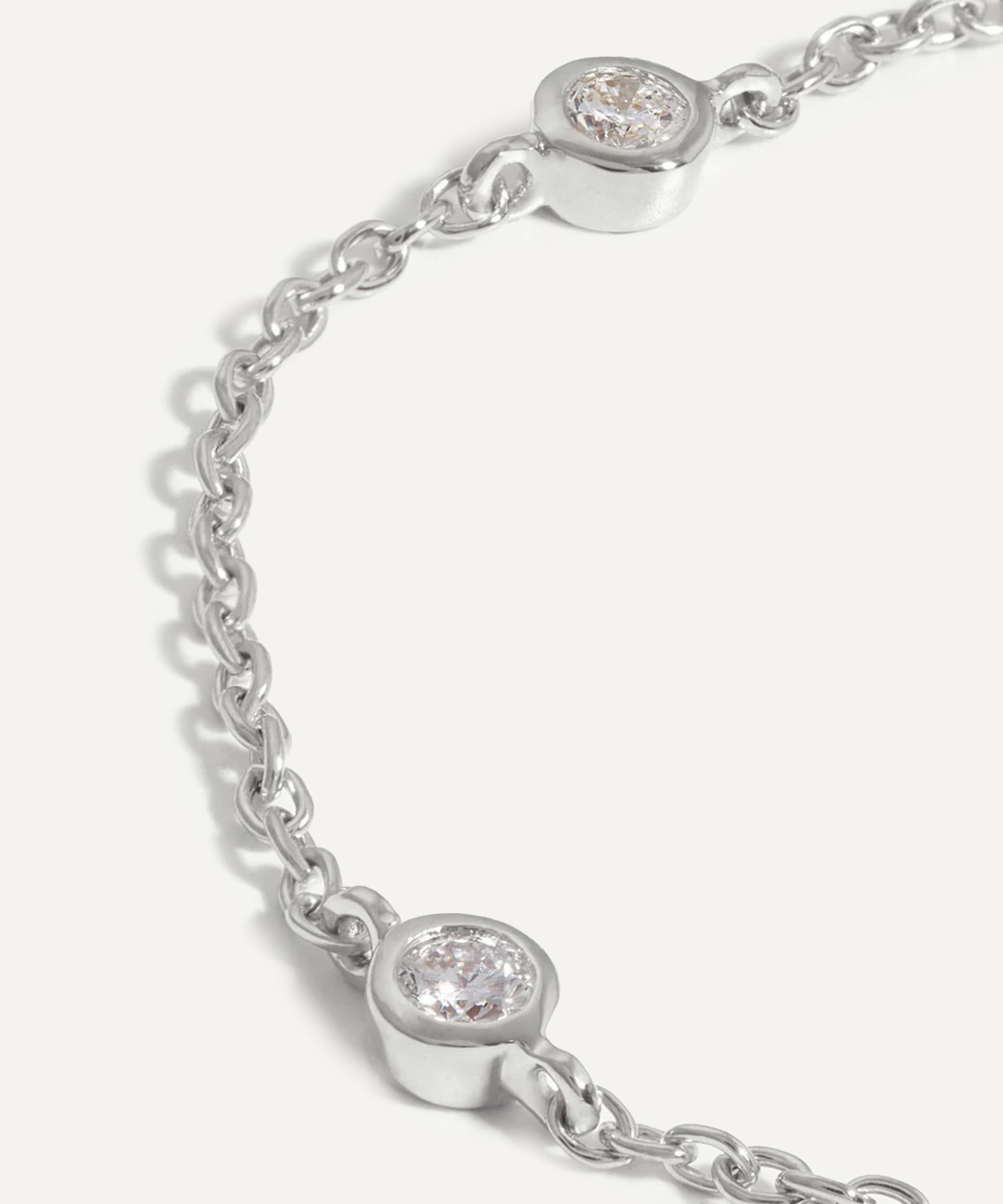 Make every day dressing feel effortless with this subtly diamond bracelet from Missoma. Handcrafted from solid 14ct white gold, it features a fine cable chain adorned with five round cut diamonds, floating on the wrist. Perfect for any kind of stack curation, style it with other gold bracelets, or wear solo for a minimal look.